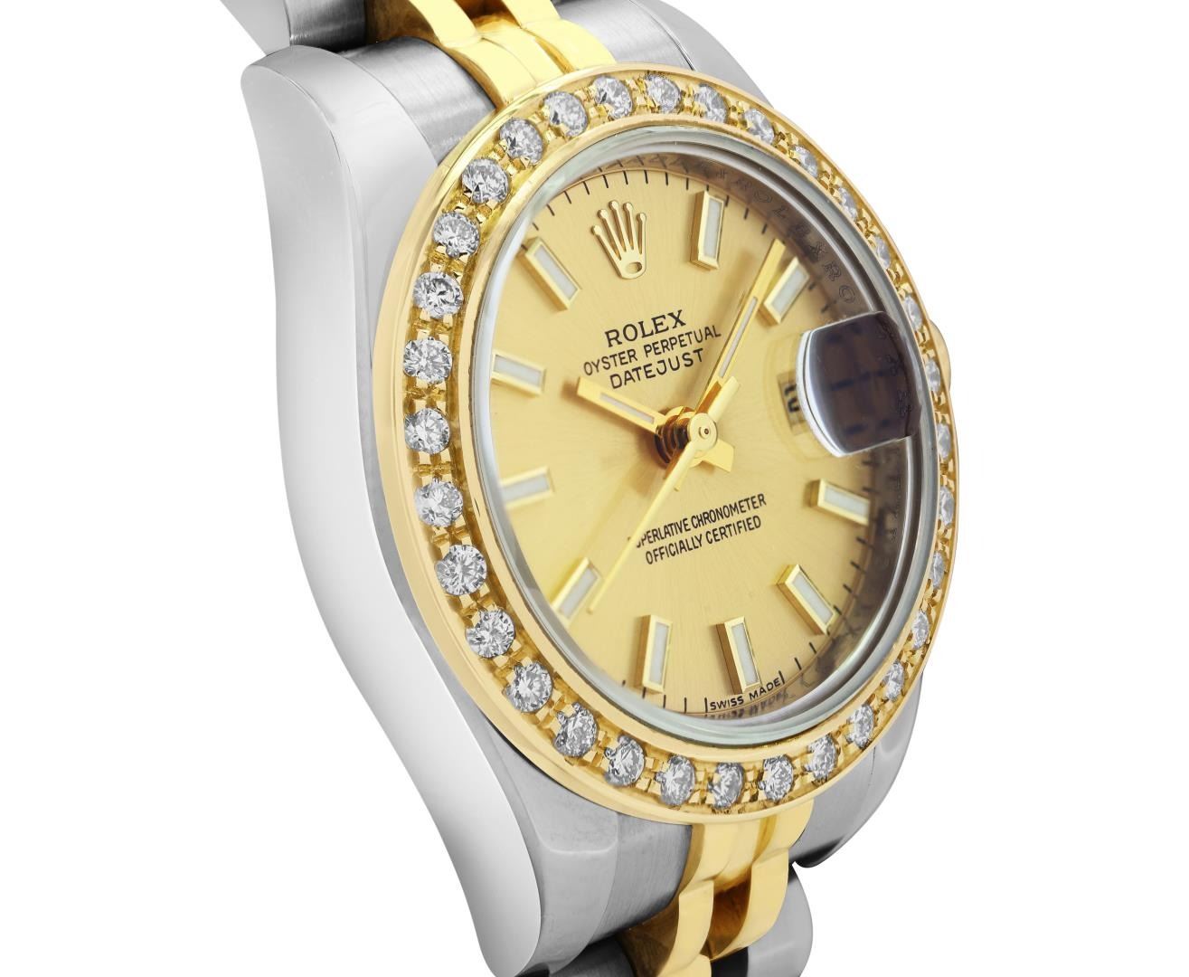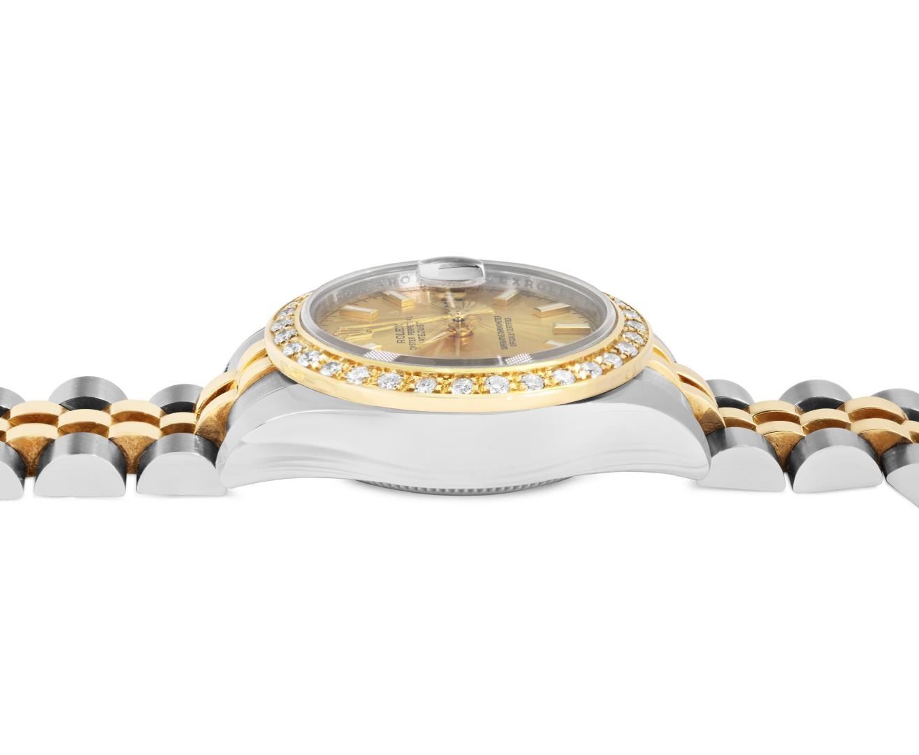 One Rolex Ladies Pre Owned Two Tone 18K Yellow Gold And Stainless Steel Rolex Datejust Polished, Serviced & Electronically Tested, Rolex Yellow Gold And Stainless Steel Case: 26mm, Rolex Yellow Gold Crown. Custom Bezel: New 18K Yellow Gold Beadset Diamond Bezel, Diamond Count: 32 Diamonds On Bezel. Crystal: Sapphire Crystal With Date Window. Hands: Luminescent Hands. Rolex Movement: 2235 Automatic Winding Movement. Rolex Dial: Factory Champagne Index Dial. Date Window: 3 O'Clock Position Date Display, Condition: G-6 Extra Fine. Rolex Bracelet: Two Tone 18K Yellow Gold And Stainless Steel Jubilee Band. Bright Polish And Satin Finish. 6.0 Inch Length, Adjustable. Hidden Clasp, With Rolex Logo. This Watch Has Been Serviced Time Tested And Is In Excellent Condition It Is Free Of All Scratches And Dents. This Watch Comes With A Rolex Box.