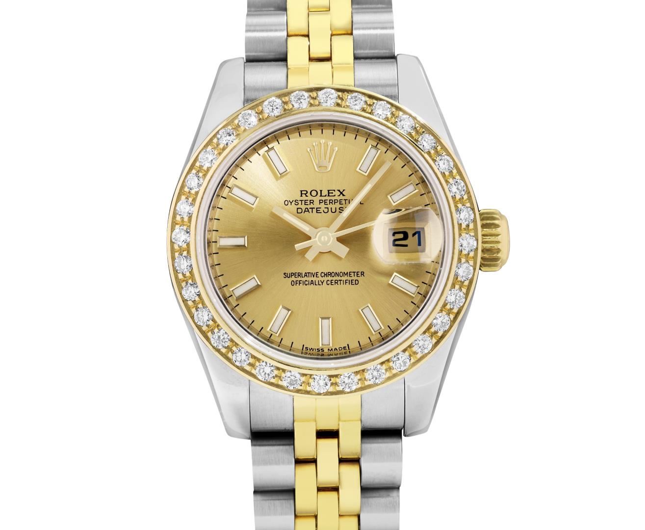 One Rolex Ladies Pre Owned Two Tone 18K Yellow Gold And Stainless Steel Rolex Datejust Polished, Serviced & Electronically Tested, Rolex Yellow Gold And Stainless Steel Case: 26mm, Rolex Yellow Gold Crown. Custom Bezel: New 18K Yellow Gold Beadset Diamond Bezel, Diamond Count: 32 Diamonds On Bezel. Crystal: Sapphire Crystal With Date Window. Hands: Luminescent Hands. Rolex Movement: 2235 Automatic Winding Movement. Rolex Dial: Factory Champagne Index Dial. Date Window: 3 O'Clock Position Date Display, Condition: G-6 Extra Fine. Rolex Bracelet: Two Tone 18K Yellow Gold And Stainless Steel Jubilee Band. Bright Polish And Satin Finish. 6.0 Inch Length, Adjustable. Hidden Clasp, With Rolex Logo. This Watch Has Been Serviced Time Tested And Is In Excellent Condition It Is Free Of All Scratches And Dents. This Watch Comes With A Rolex Box.
