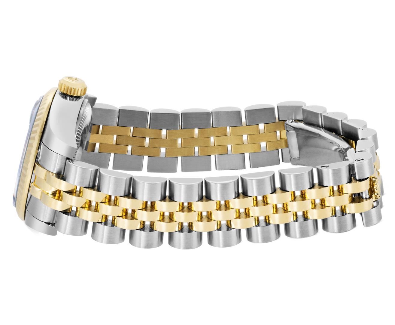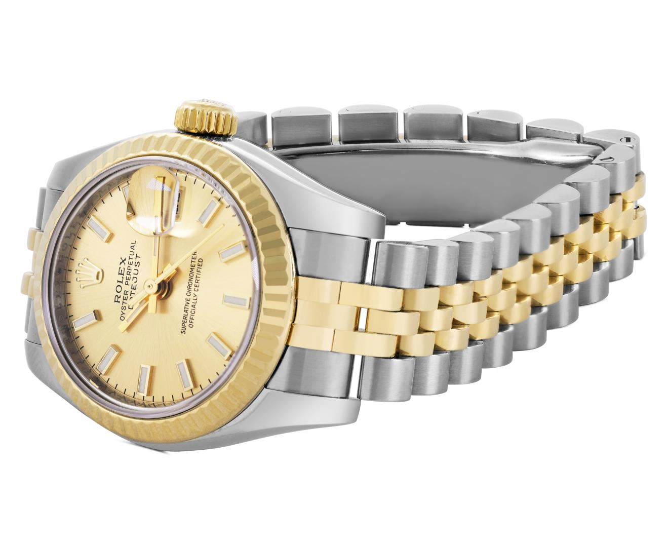 One Rolex Ladies Pre Owned Two Tone 18K Yellow Gold And Stainless Steel Rolex Datejust Polished, Serviced And Electronically Tested, Rolex Yellow Gold And Stainless Steel Case: 26mm, Rolex Yellow Gold Crown. Rolex 18K Yellow Gold Fluted Bezel. Crystal: Sapphire Crystal With Date Window. Hands: Luminescent Hands. Rolex Movement: 2235 Automatic Winding Movement. Rolex Dial: Factory Champagne Index Dial. Date Window: 3 O'Clock Position Date Display, Condition: G-6 Extra Fine. Rolex Bracelet: Two Tone 18K Yellow Gold And Stainless Steel Jubilee Band. Bright Polish And Satin Finish. 6.0 Inch Length, Adjustable. Hidden Clasp, With Rolex Logo. This Watch Has Been Serviced Time Tested And Is In Excellent Condition It Is Free Of All Scratches And Dents. This Watch Comes With A Rolex Box.