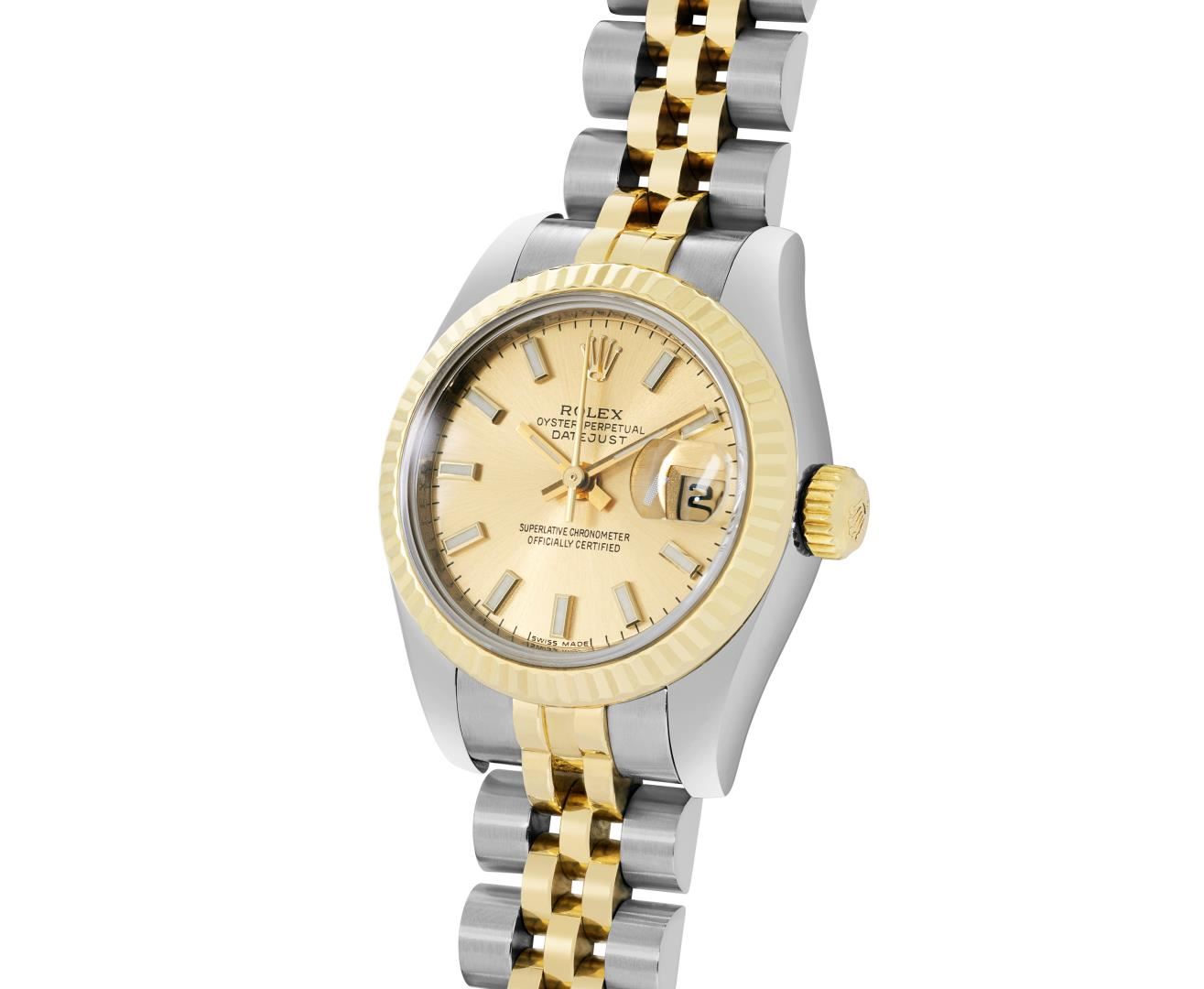 One Rolex Ladies Pre Owned Two Tone 18K Yellow Gold And Stainless Steel Rolex Datejust Polished, Serviced And Electronically Tested, Rolex Yellow Gold And Stainless Steel Case: 26mm, Rolex Yellow Gold Crown. Rolex 18K Yellow Gold Fluted Bezel. Crystal: Sapphire Crystal With Date Window. Hands: Luminescent Hands. Rolex Movement: 2235 Automatic Winding Movement. Rolex Dial: Factory Champagne Index Dial. Date Window: 3 O'Clock Position Date Display, Condition: G-6 Extra Fine. Rolex Bracelet: Two Tone 18K Yellow Gold And Stainless Steel Jubilee Band. Bright Polish And Satin Finish. 6.0 Inch Length, Adjustable. Hidden Clasp, With Rolex Logo. This Watch Has Been Serviced Time Tested And Is In Excellent Condition It Is Free Of All Scratches And Dents. This Watch Comes With A Rolex Box.