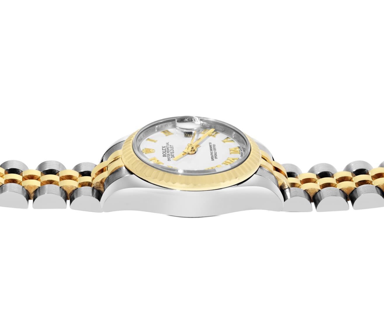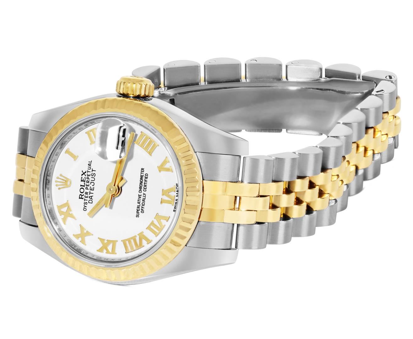One Rolex Ladies Pre Owned Two Tone 18K Yellow Gold And Stainless Steel Rolex Datejust Polished, Serviced & Electronically Tested, Rolex Yellow Gold And Stainless Steel Case: 26mm, Rolex Yellow Gold Crown. Rolex 18K Yellow Gold Fluted Bezel. Crystal: Sapphire Crystal With Date Window. Hands: Solid Hands. Rolex Movement: 2235 Automatic Winding Movement. Rolex Factory Dial: Factory White Roman Dial. Date Window: 3 O'Clock Position Date Display, Condition: G-6 Extra Fine. Rolex Bracelet: Two Tone 18K Yellow Gold And Stainless Steel Jubilee Band. Bright Polish And Satin Finish. 6.0 Inch Length, Adjustable. Hidden Clasp, With Rolex Logo. This Watch Has Been Serviced Time Tested And Is In Excellent Condition It Is Free Of All Scratches And Dents. This Watch Comes With A Rolex Box.