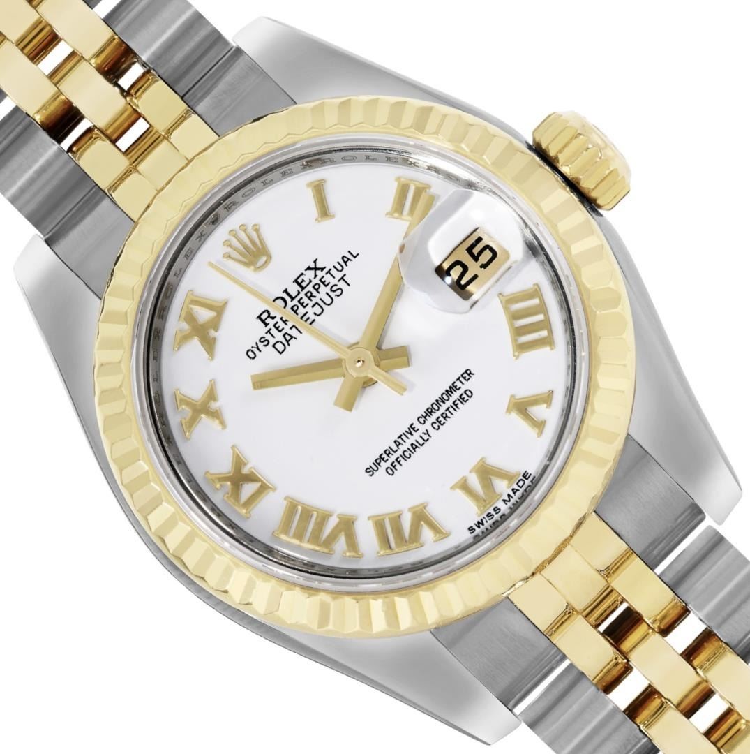 One Rolex Ladies Pre Owned Two Tone 18K Yellow Gold And Stainless Steel Rolex Datejust Polished, Serviced & Electronically Tested, Rolex Yellow Gold And Stainless Steel Case: 26mm, Rolex Yellow Gold Crown. Rolex 18K Yellow Gold Fluted Bezel. Crystal: Sapphire Crystal With Date Window. Hands: Solid Hands. Rolex Movement: 2235 Automatic Winding Movement. Rolex Factory Dial: Factory White Roman Dial. Date Window: 3 O'Clock Position Date Display, Condition: G-6 Extra Fine. Rolex Bracelet: Two Tone 18K Yellow Gold And Stainless Steel Jubilee Band. Bright Polish And Satin Finish. 6.0 Inch Length, Adjustable. Hidden Clasp, With Rolex Logo. This Watch Has Been Serviced Time Tested And Is In Excellent Condition It Is Free Of All Scratches And Dents. This Watch Comes With A Rolex Box.