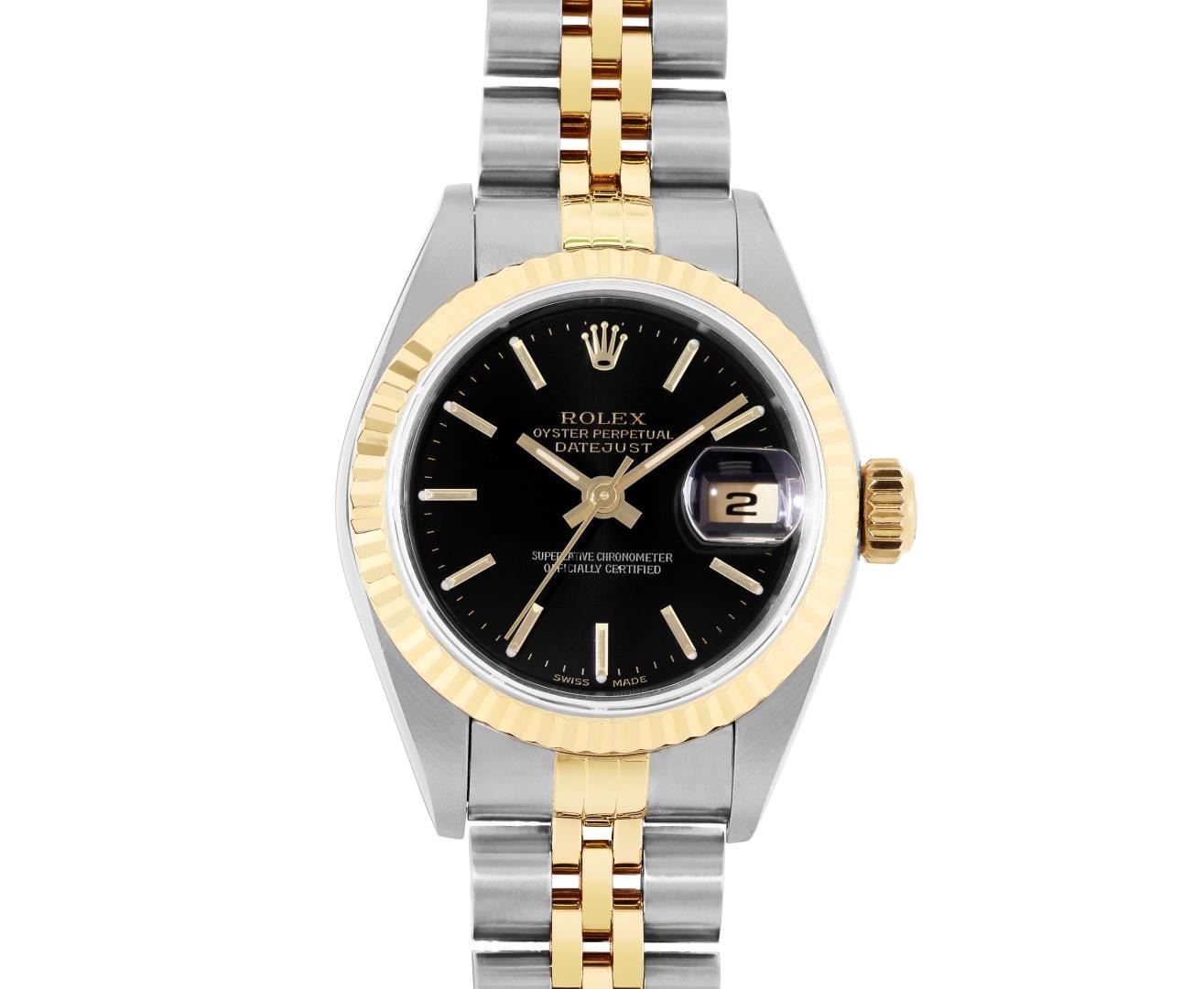 Rolex Ladies Pre Owned Sapphire Quickset 18K Yellow Gold and Stainless Steel Two Tone Datejust Polished Bright with Satin Finish, Serviced & Electronically Tested, Rolex Stainless Steel Case: 26mm, Rolex 18K Yellow Gold Crown, Rolex 18K Yellow Gold Fluted Bezel. Crystal: Sapphire With Magnified Date Window. Hands: Luminecent Hands. Rolex Movement: Automatic Winding Movement 2235. Rolex Dial: Factory Black Index Dial. Date Window: 3 O'Clock Position Date Display, Model: Quickset Datejust, Condition: G-6 Extra Fine. Rolex Bracelet: 18K Yellow Gold & Stainless Steel Jubilee Band. Bright Polish & Satin Finish. 6.0 Inch Length, Adjustable. Standard Clasp, With Rolex Logo. This Watch Has Been Serviced Time Tested And Is In Excellent Condition It Is Free Of All Scratches And Dents. This Watch Comes With A Rolex Box.