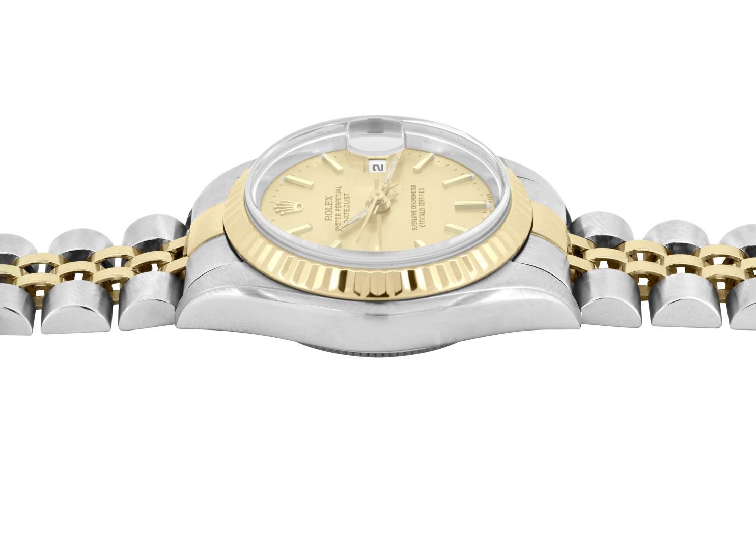 Rolex Ladies Pre Owned Sapphire Quickset 18K Yellow Gold and Stainless Steel Two Tone Datejust Polished Bright with Satin Finish, Serviced And Electronically Tested, Rolex Stainless Steel Case: 26mm, Rolex 18K Yellow Gold Crown, Rolex 18K Yellow Gold Fluted Bezel. Custom Crystal: New Sapphire With Magnified Date Window. Custom Hands: New Luminescent Hands. Rolex Movement: Automatic Winding Movement 2235. Rolex Dial: Factory Champagne Index Dial. Date Window: 3 O'Clock Position Date Display, Model: Quickset Datejust, Condition: G-6 Extra Fine. Rolex Bracelet: 18K Yellow Gold And Stainless Steel Jubilee Band. Bright Polish And Satin Finish. 6.0 Inch Length, Adjustable. Standard Clasp, With Rolex Logo. This Watch Has Been Serviced Time Tested And Is In Excellent Condition It Is Free Of All Scratches And Dents. This Watch Comes With A Rolex Box.