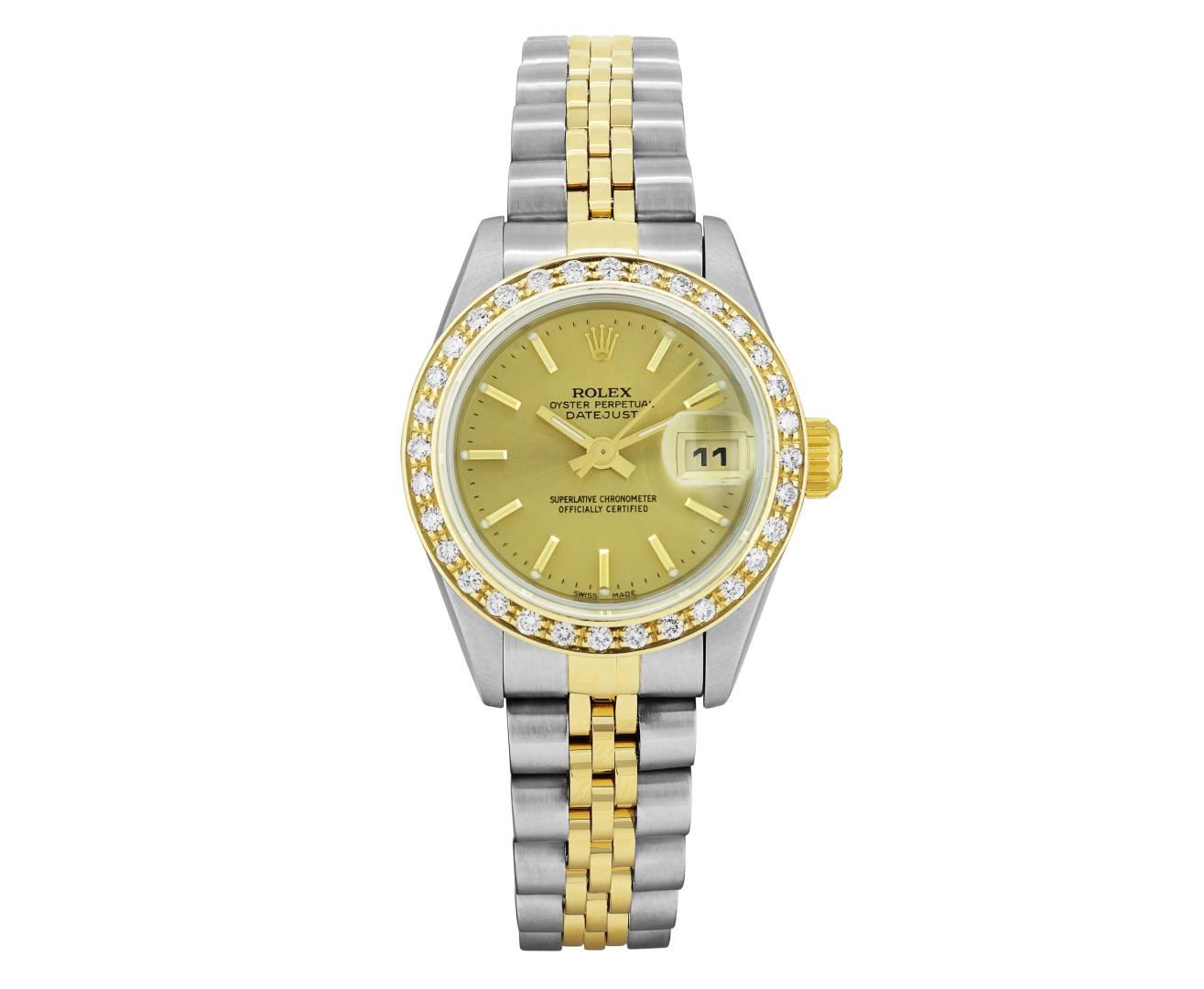 One Rolex Sapphire Ladies Pre Owned Two Tone 18K Yellow Gold And Stainless Steel Rolex Datejust Polished, Serviced And Electronically Tested, Rolex Yellow Gold And Stainless Steel Case: 26mm, Rolex Yellow Gold Crown. Custom Bezel: New 18K Yellow Gold Beadset Diamond Bezel, Diamond Count: 32 Diamonds On Bezel. Crystal: Sapphire Crystal With Date Window. Hands: Luminescent Hands. Rolex Movement: 2235 Automatic Winding Movement. Rolex Factory Dial: Champagne With Index Hour Markers And Dash Track, and Lumi Dots. Date Window: 3 O'Clock Position Date Display, Condition: G-6 Extra Fine. Rolex Bracelet: Two Tone 18K Yellow Gold & Stainless Steel Jubilee Band. Bright Polish & Satin Finish. 6.0 Inch Length, Adjustable. Standard Clasp, With Rolex Logo. This Watch Has Been Serviced Time Tested And Is In Excellent Condition It Is Free Of All Scratches And Dents.