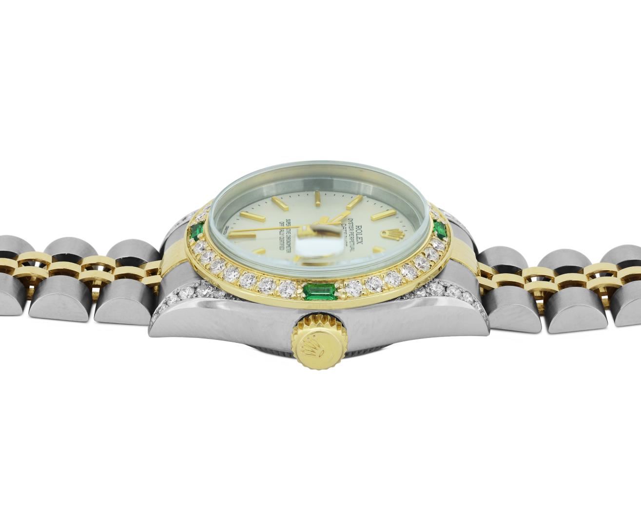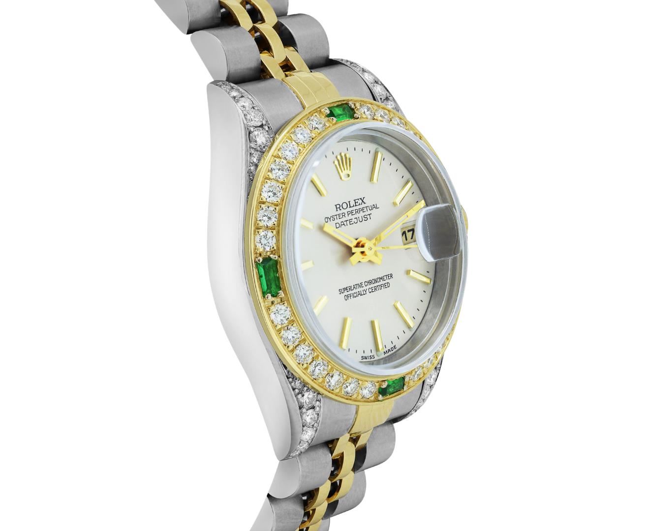 One Ladies Pre Owned Sapphire Rolex Two Tone 18K Yellow Gold And Stainless Steel Rolex Datejust Polished, Serviced & Electronically Tested, Rolex Yellow Gold And Stainless Steel Case: 26mm, Custom Diamond Lugs: 24 Added Diamonds On Lugs. Rolex Yellow Gold Crown. Custom Bezel: New 18K Yellow Gold Emerald Beadset Diamond Bezel, Diamond + Gem Count: 36 Diamonds + 4 Emeralds. Crystal: Sapphire Crystal With Date Window. Custom Hands: New Luminescent Hands. Rolex Movement: Automatic Winding Movement 2235. Rolex Factory Dial: Silver With Index Markers And Dash Track and Lumi Dots. Date Window: 3 O'Clock Position Date Display, Condition: G-6 Extra Fine. Rolex Bracelet: Two Tone 18K Yellow Gold And Stainless Steel Jubilee Band. Bright Polish & Satin Finish. 6.0 Inch Length, Adjustable. Standard Clasp, With Rolex Logo. This Watch Has Been Serviced And Time Tested. It Is In Excellent Condition, Free Of All Scratches And Dents.