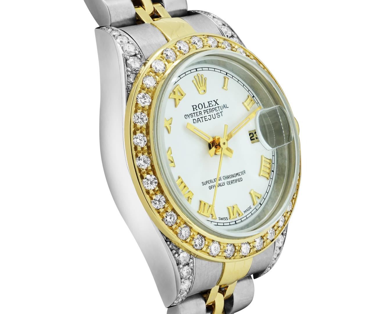 One Rolex Ladies Pre Owned Sapphire Two Tone 18K Yellow Gold And Stainless Steel Rolex Datejust Polished, Serviced And Electronically Tested, Rolex Yellow Gold And Stainless Steel Case: 26mm, Custom Diamond Lugs: 24 Added Diamonds On Lugs. Rolex Yellow Gold Crown. Custom Bezel: New 18K Yellow Gold Beadset Diamond Bezel, Diamond Count: 32 Diamonds On Bezel. Crystal: Sapphire Crystal With Date Window. Hands: Custom Hands: New Luminescent Hands. Rolex Movement: Automatic Winding Movement 2235. Rolex Factory Dial: White With Roman Markers And Square Track. Date Window: 3 O'Clock Position Date Display, Condition: G-6 Extra Fine. Rolex Bracelet: Two Tone 18K Yellow Gold And Stainless Steel Jubilee Band. Bright Polish & Satin Finish. 6.0 Inch Length, Adjustable. Standard Clasp, With Rolex Logo. This Watch Has Been Serviced And Time Tested. It Is In Excellent Condition, Free Of All Scratches And Dents. This Watch Comes With A Rolex Box.