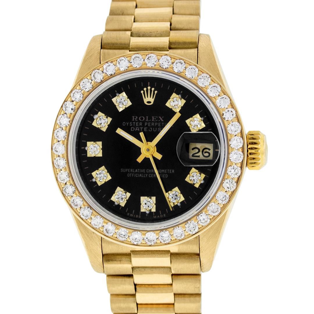 One Ladies Pre Owned Quickset Rolex 18K Yellow Gold President Polished, Serviced & Electronically Tested, 18K Yellow Gold Case: 26mm, 18K Yellow Gold Crown, Custom Bezel: New 18K Yellow Gold 1ctw Bead Set Diamond Bezel, Diamond Count: 42 Diamonds On Bezel, Total Weight 1.00 Carat. Custom Crystal: New Sapphire With Date Window and Cyclops Lens. Rolex Movement: Automatic Winding Quickset Movement. Custom Dial: Refinished Black With Custom Added Single Cut Diamond Hour Markers With Dash Track & Lumi Dots, Diamond Count: 10 Single Cut Diamonds On Dial. Date Window: 3 O'Clock Position, Model: Quickset Datejust President. Condition: G-6 Extra Fine The Watch Is In Very Good Condition Free Of All Scratches And Dents. Rolex Bracelet: 18K Yellow Gold President Band, Bright & Satin Polish. 6.0 Inch Length, Standard President Clasp (Hidden Clasp), With Rolex Logo.