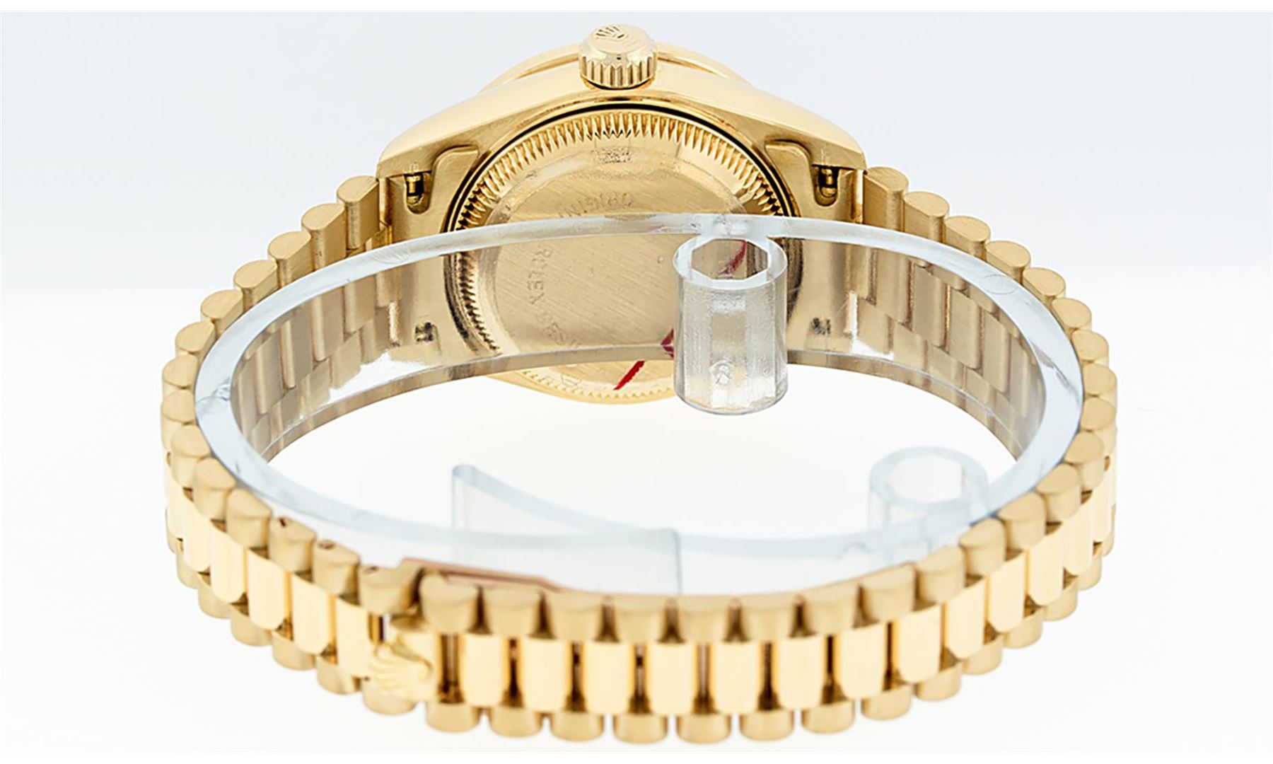 One Ladies Pre Owned Quickset Rolex 18K Yellow Gold President Polished, Serviced & Electronically Tested, 18K Yellow Gold Case: 26mm, 18K Yellow Gold Crown, Custom Bezel: New 18K Yellow Gold 1ctw Bead Set Diamond Bezel, Diamond Count: 42 Diamonds On Bezel. Total Weight 1.00 Carat. Custom Crystal: New Sapphire With Date Window. Rolex Rolex Movement: Automatic Winding Quickset Movement. Custom Dial: Refinished Blue Vignette With Single Cut Diamond Dial With Dash Track & Lumi Dots. Diamond Count: 10 Single Cut Diamonds On Dial, Date Window: 3 O'Clock Position, Model: Quickset Datejust President. Condition: G-6 Extra Fine The Watch Is In Very Good Condition Free Of All Scratches And Dents. Bracelet: 18K Yellow Gold President Band, Bright & Satin Polish. 6.0 Inch Length, Standard President Clasp (Hidden Clasp), With Rolex Logo.