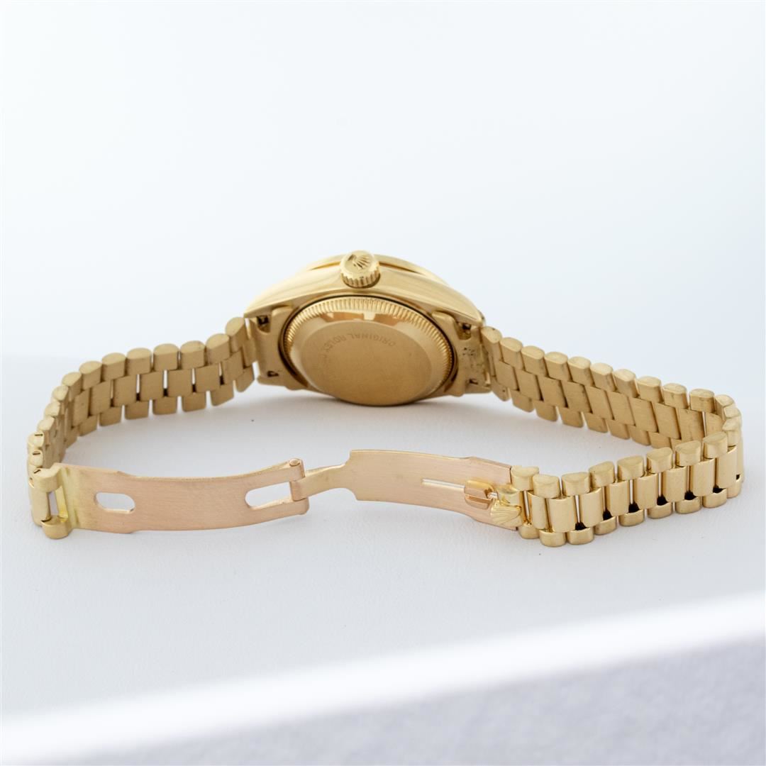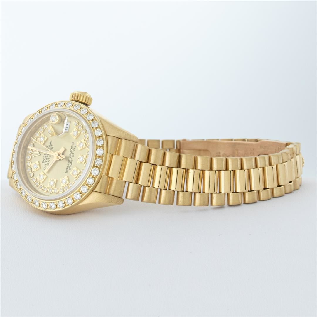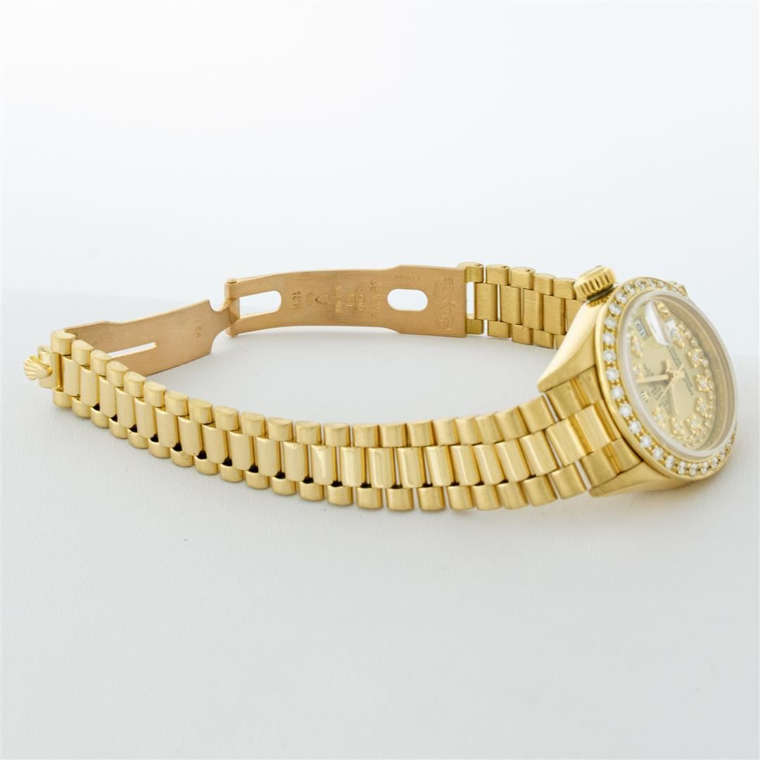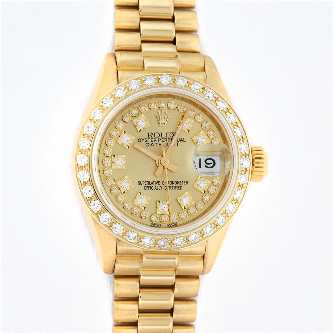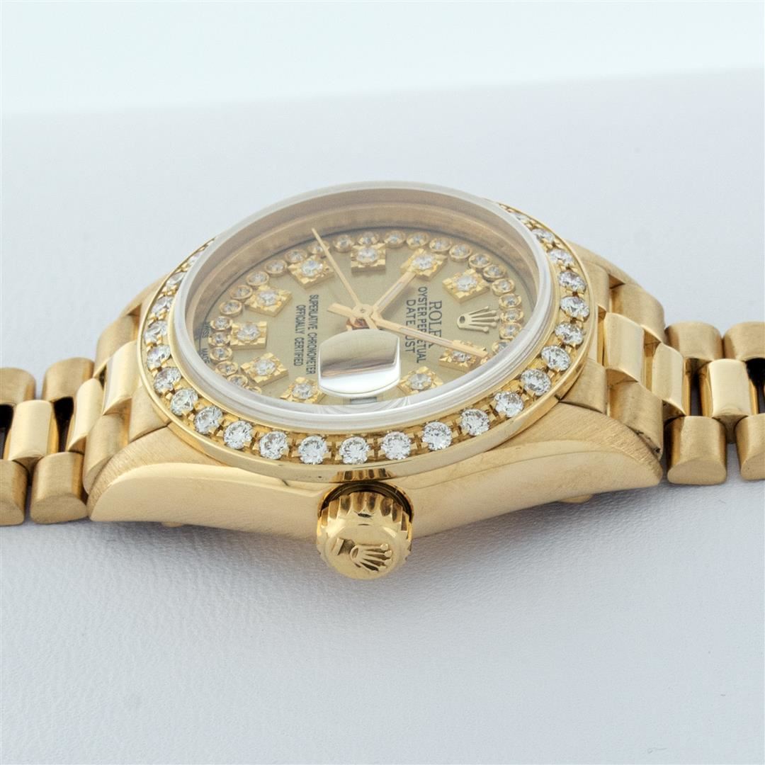 One Ladies Pre Owned Quickset Rolex 18K Yellow Gold President Polished, Serviced & Electronically Tested, 18K Yellow Gold Case: 26mm, 18K Yellow Gold Crown, Custom Bezel: New 18K Yellow Gold Bead Set Diamond Bezel, Diamond Count: 32 Diamonds On Bezel. Custom Crystal: New Sapphire With Date Window. Rolex Movement: Automatic Winding Quickset Movement. Custom Dial: Refinished To Champagne String With Custom Added Diamond Hour Markers, Diamond Count: 43 Diamonds On Dial, Clarity: VS. Date Window: 3 O'Clock Position, Model: Quickset Datejust President. Condition: G-6 Extra Fine The Watch Is In Very Good Condition Free Of All Scratches And Dents. Rolex Bracelet: 18K Yellow Gold President Band, Bright & Satin Polish. 6.0 Inch Length, Standard President Clasp (Hidden Clasp), With Rolex Logo.