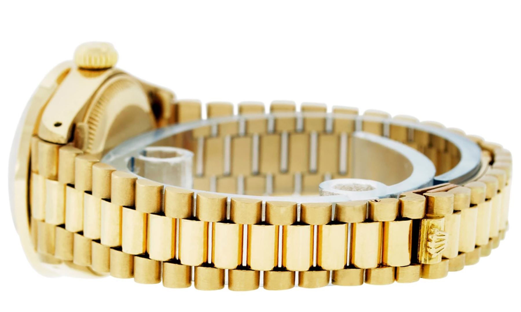 One Ladies Pre Owned 18K Yellow Gold Rolex President Polished, Serviced & Electronically Tested, Rolex Yellow Gold Case: 26mm, Rolex 18K Yellow Gold Crown, Custom Bezel: New 18K Yellow Gold Pyramid Bezel With Genuine Diamonds, Diamond Count: 24 Diamonds In Bezel. Total Weight .50 Carat, Clarity: SI-VS, Color: G to H. Custom Crystal: New Scratch Resistant Synthetic Sapphire Cyclops Lens. Custom Hands: New Luminescent Hands. Rolex Movement: Automatic Winding Movement. Rolex Dial: Champagne Index With Dash Track & Lumi Dots. Date Window: 3 O'Clock Position, Model: Datejust President, Condition: G-6 Extra Fine. Rolex Bracelet: 18K Yellow Gold President With Hidden Clasp, Bright & Satin Polish. 6.0 Inch Length, Standard President Clasp (Hidden Clasp), With Rolex Logo. This Watch Has Been Serviced And Polished It Is Free Of All Scratches And Dents. This Watch Has Been Serviced Time Tested And Is In Excellent Condition It Is Free Of All Scratches And Dents.