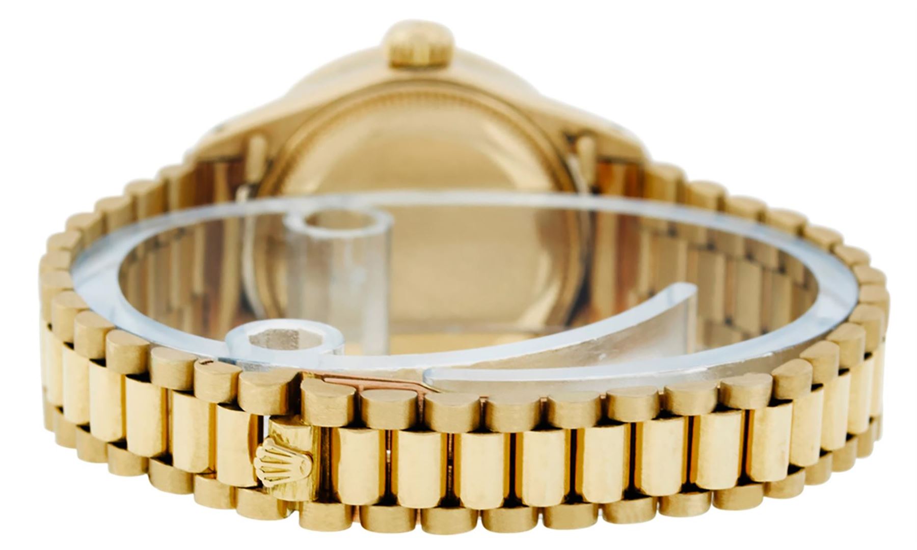 One Ladies Pre Owned 18K Yellow Gold Rolex President Polished, Serviced & Electronically Tested, Rolex Yellow Gold Case: 26mm, Rolex 18K Yellow Gold Crown, Custom Bezel: New 18K Yellow Gold Pyramid Bezel With Genuine Diamonds, Diamond Count: 24 Diamonds In Bezel. Total Weight .50 Carat, Clarity: SI-VS, Color: G to H. Custom Crystal: New Scratch Resistant Synthetic Sapphire Cyclops Lens. Custom Hands: New Luminescent Hands. Rolex Movement: Automatic Winding Movement. Rolex Dial: Champagne Index With Dash Track & Lumi Dots. Date Window: 3 O'Clock Position, Model: Datejust President, Condition: G-6 Extra Fine. Rolex Bracelet: 18K Yellow Gold President With Hidden Clasp, Bright & Satin Polish. 6.0 Inch Length, Standard President Clasp (Hidden Clasp), With Rolex Logo. This Watch Has Been Serviced And Polished It Is Free Of All Scratches And Dents. This Watch Has Been Serviced Time Tested And Is In Excellent Condition It Is Free Of All Scratches And Dents.