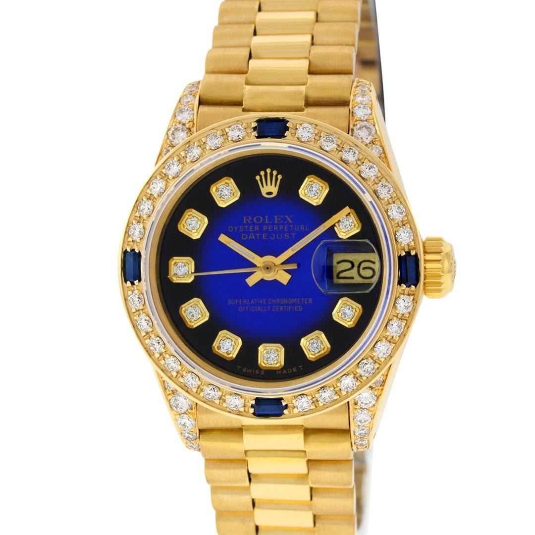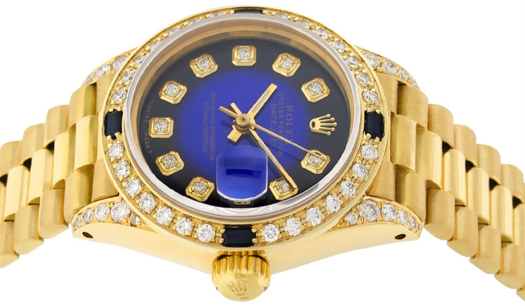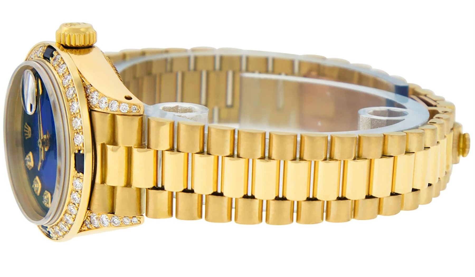 One Ladies 18K Yellow Gold Rolex President Polished, Serviced & Electronically Tested, Yellow Gold Case With Custom Diamond Lugs: 24 Diamonds On Lugs. Custom Bezel: New 18K Yellow Gold Sapphire Beadset Diamond Bezel, Diamond + Gem Count: 36 Diamonds + 4 Sapphires. Custom Crystal: New Sapphire With Date Window. Custom Hands: New Luminescent Hands. Rolex Movement: Automatic Winding Movement. Custom Dial: Refinished To Blue Vignette With Custom Added Diamond Hour Markers, Color: G To H. Clarity: SI-VS. Date Window: 3 O'Clock Position, Non Quickset, Model: Datejust President, Condition: G-6 Extra Fine. Rolex Bracelet: 18K Yellow Gold President Band, Bright & Satin Polish. 6.0 Inch Length, Standard President Clasp (Hidden Clasp), With Rolex Logo. This Pre Owned Watch Has Been Serviced Time Tested And Is In Excellent Condition It Is Free Of All Scratches And Dents.