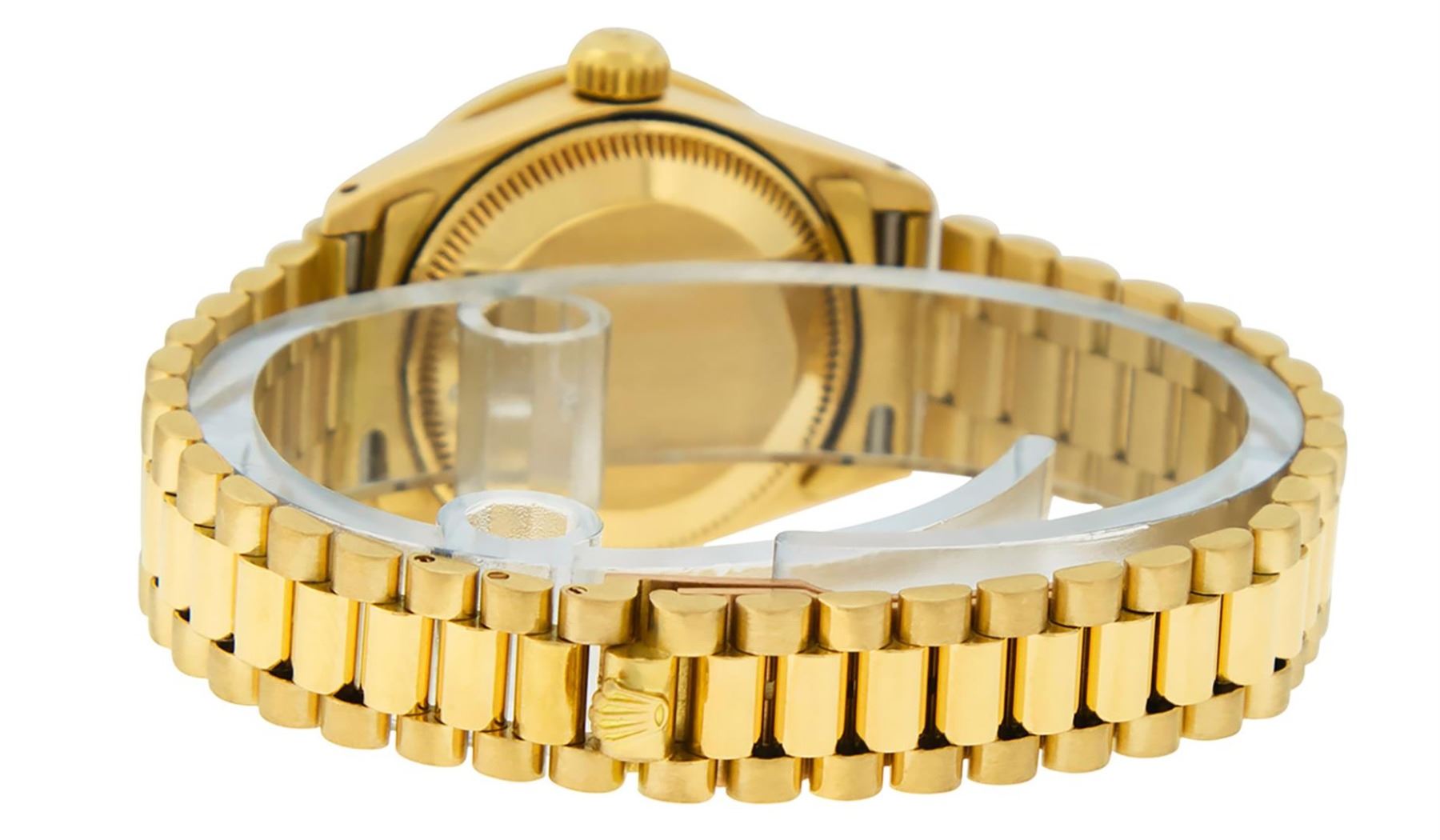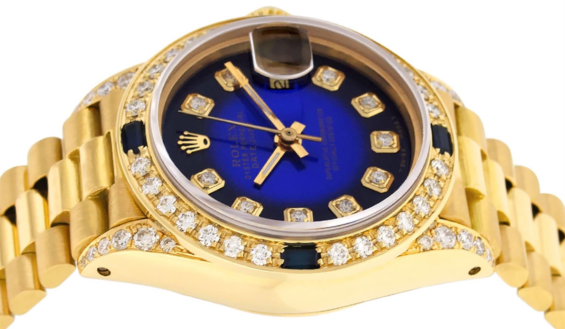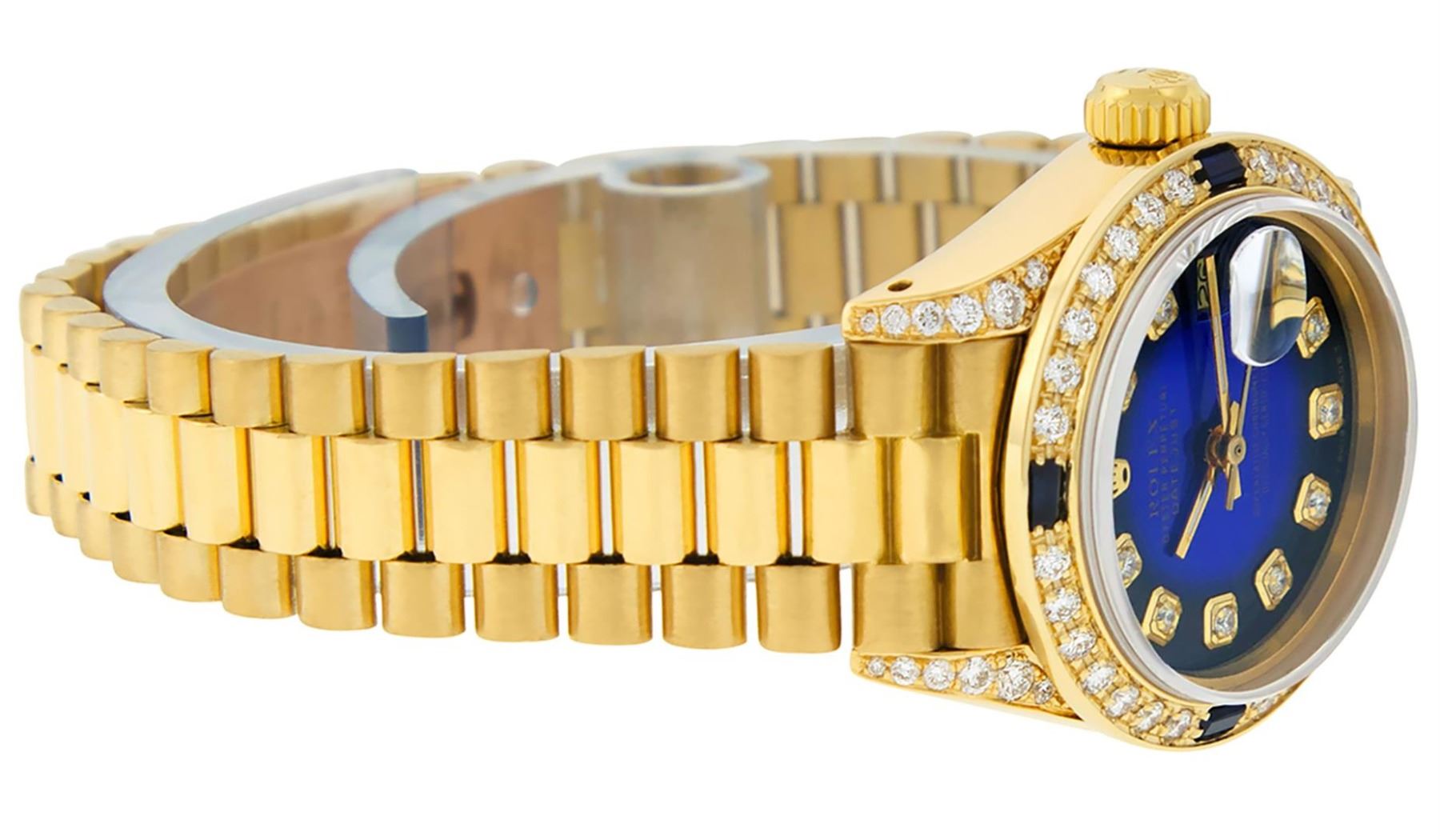 One Ladies 18K Yellow Gold Rolex President Polished, Serviced & Electronically Tested, Yellow Gold Case With Custom Diamond Lugs: 24 Diamonds On Lugs. Custom Bezel: New 18K Yellow Gold Sapphire Beadset Diamond Bezel, Diamond + Gem Count: 36 Diamonds + 4 Sapphires. Custom Crystal: New Sapphire With Date Window. Custom Hands: New Luminescent Hands. Rolex Movement: Automatic Winding Movement. Custom Dial: Refinished To Blue Vignette With Custom Added Diamond Hour Markers, Color: G To H. Clarity: SI-VS. Date Window: 3 O'Clock Position, Non Quickset, Model: Datejust President, Condition: G-6 Extra Fine. Rolex Bracelet: 18K Yellow Gold President Band, Bright & Satin Polish. 6.0 Inch Length, Standard President Clasp (Hidden Clasp), With Rolex Logo. This Pre Owned Watch Has Been Serviced Time Tested And Is In Excellent Condition It Is Free Of All Scratches And Dents.
