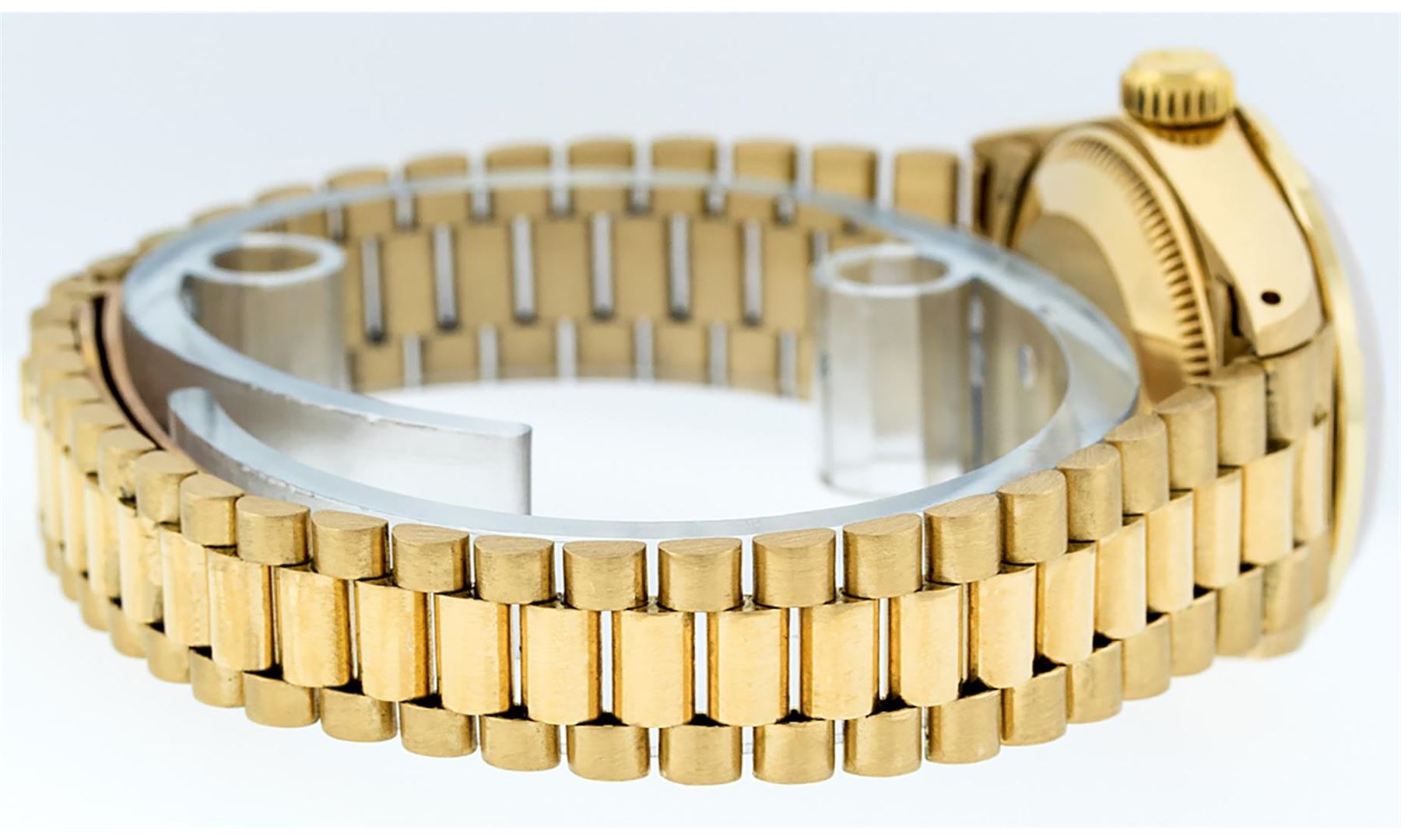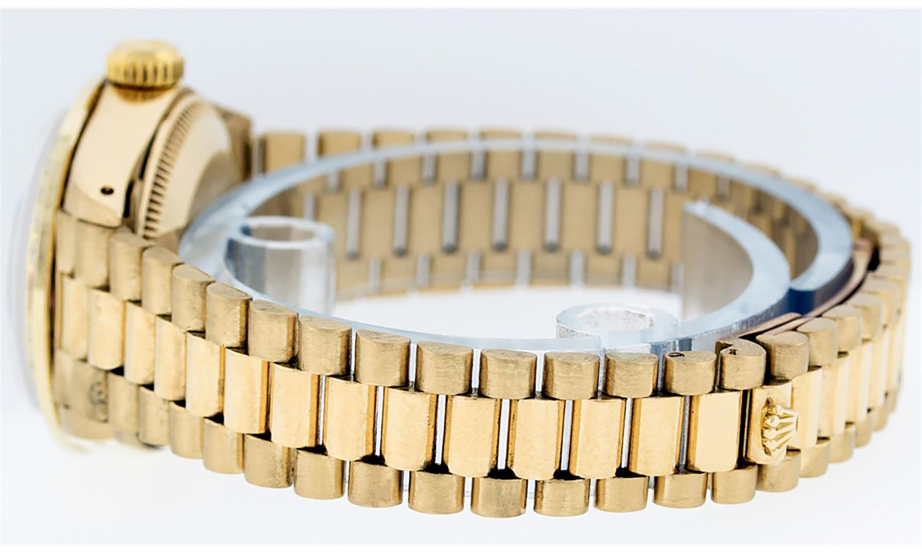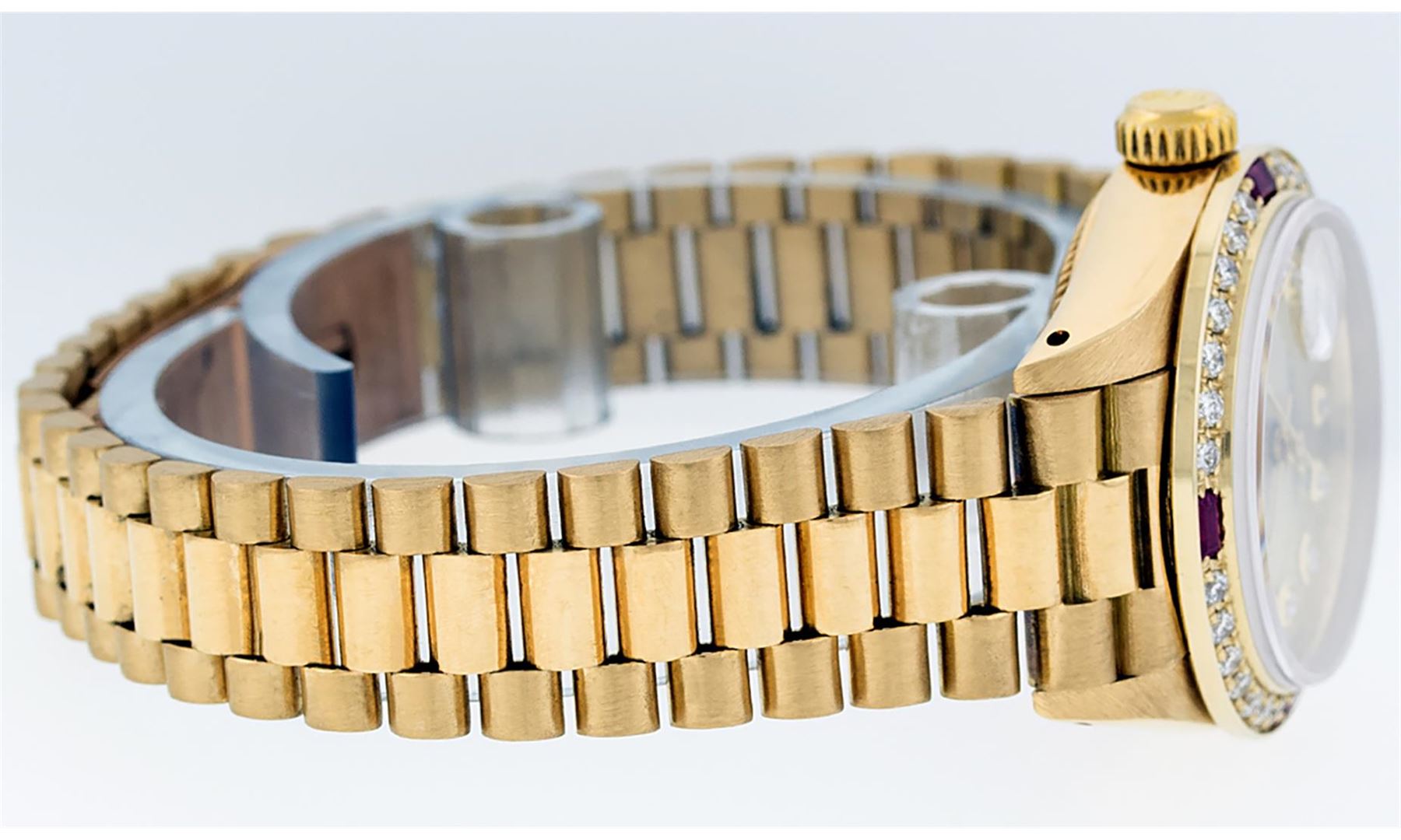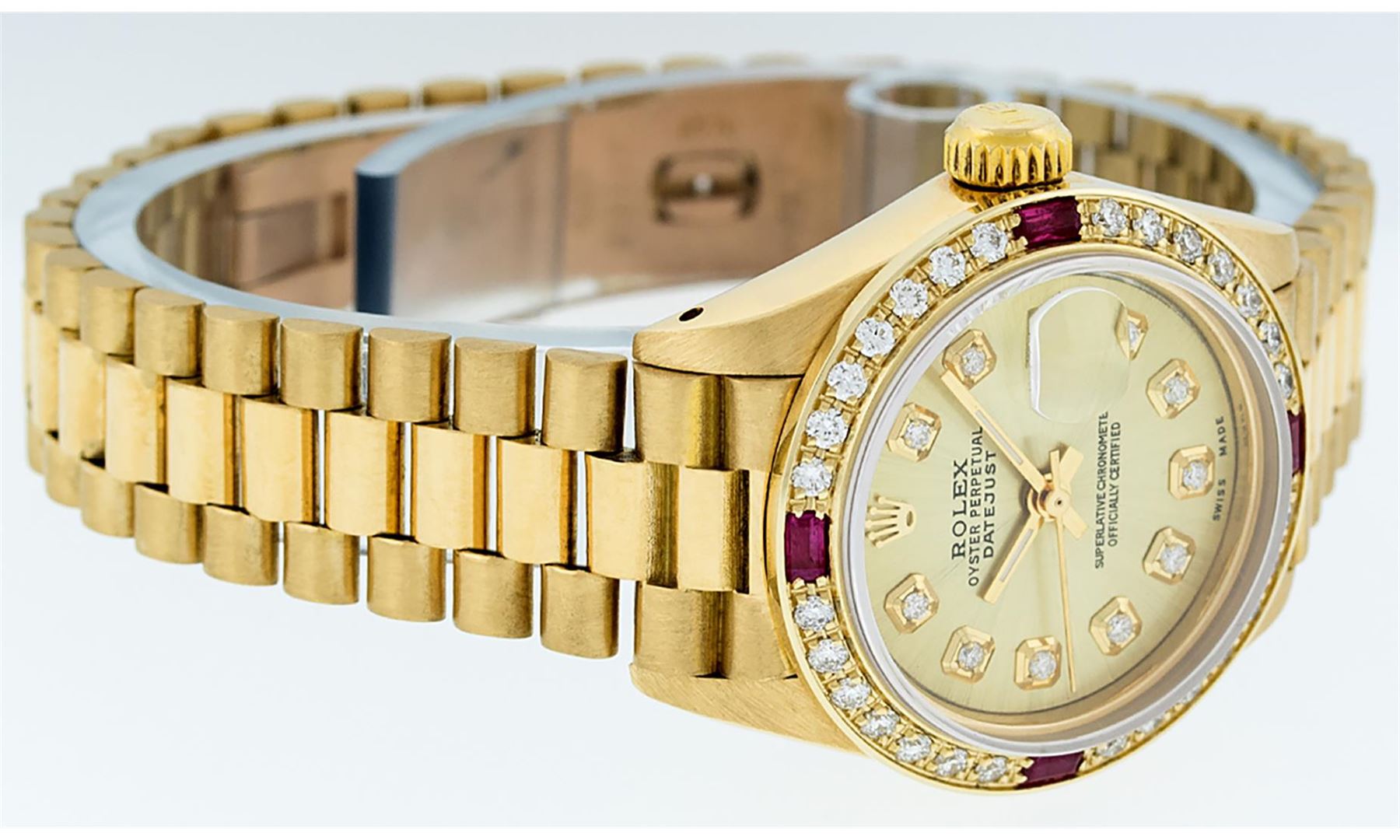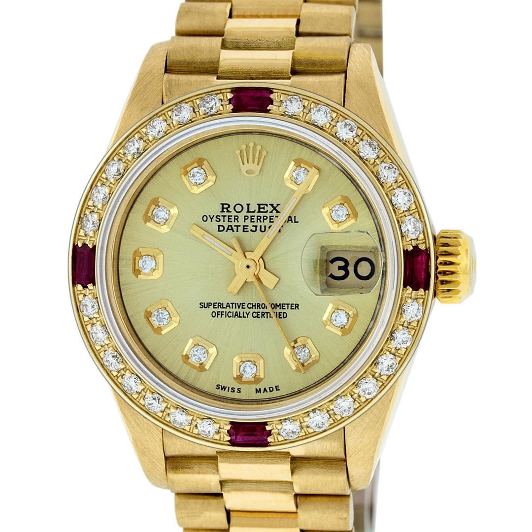 One Ladies Pre Owned 18K Yellow Gold Rolex President Polished, Serviced & Electronically Tested, Yellow Gold Case: 26mm, 18K Yellow Gold Crown, Custom Bezel: New 18K Yellow Gold Ruby Beadset Diamond Bezel, Diamond + Stone Count: 28 Diamonds + 4 Rubies. Custom Crystal: New Sapphire With Date Window. Custom Hands: New Luminescent. Hands. Rolex Movement: Automatic Winding Movement. Custom Dial: Refinished To Champagne With Custom Added Diamonds, Stone Count: 10 Diamonds In Dial. Date Window: 3 O'Clock Position, Model: Datejust President, Condition: G-6 Extra Fine. Rolex Bracelet: 18K Yellow Gold President With Hidden Clasp, Bright & Satin Polish. 6.0 Inch Length, Standard President Clasp (Hidden Clasp), With Rolex Logo. Watch Has Been Serviced And Polished It Is Free Of All Scratches And Dents.
