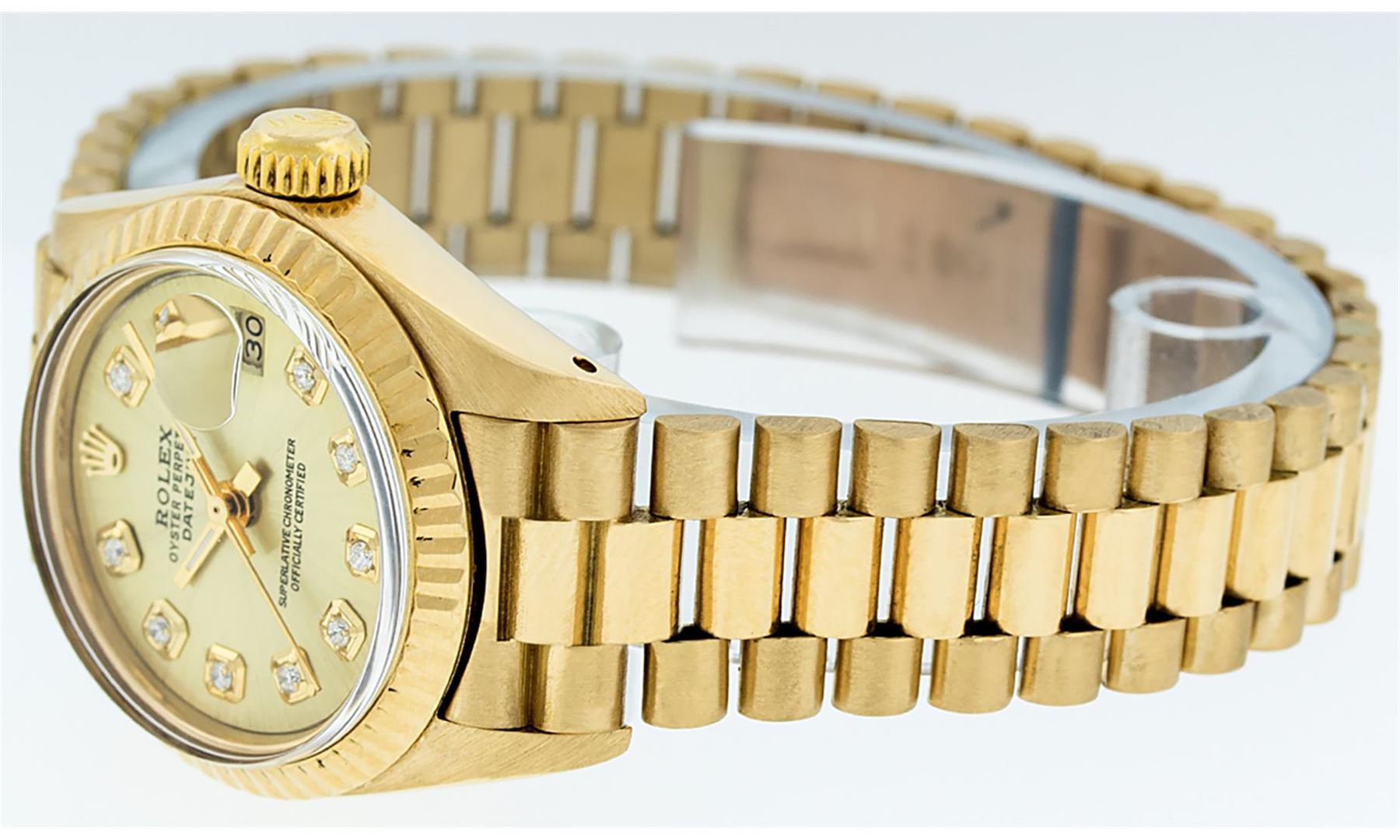 One Ladies Pre Owned Rolex 18K Yellow Gold President Polished, Serviced & Electronically Tested, Rolex 18K Yellow Gold Case: 26mm, Rolex 18K Yellow Gold Crown, Rolex Bezel: 18K Yellow Gold Fluted Bezel. Custom Crystal: New Acrylic Cyclops Lens. Movement: Automatic Winding Movement. Custom Dial: Refinished To Champagne With Added Diamonds, Color: G to H, Diamond Count: 10 Diamonds In Dial, Clarity: SI-VS. Date Window: 3 O'Clock Position, Model: Datejust. Condition: G-6 Extra, Fine The Watch Is In Very Good Condition Free Of All Scratches And Dents. Rolex Bracelet: 18K Yellow Gold President Band, Bright & Satin Polish. 6.0 Inch Length, Standard President Clasp (Hidden Clasp), With Rolex Logo.