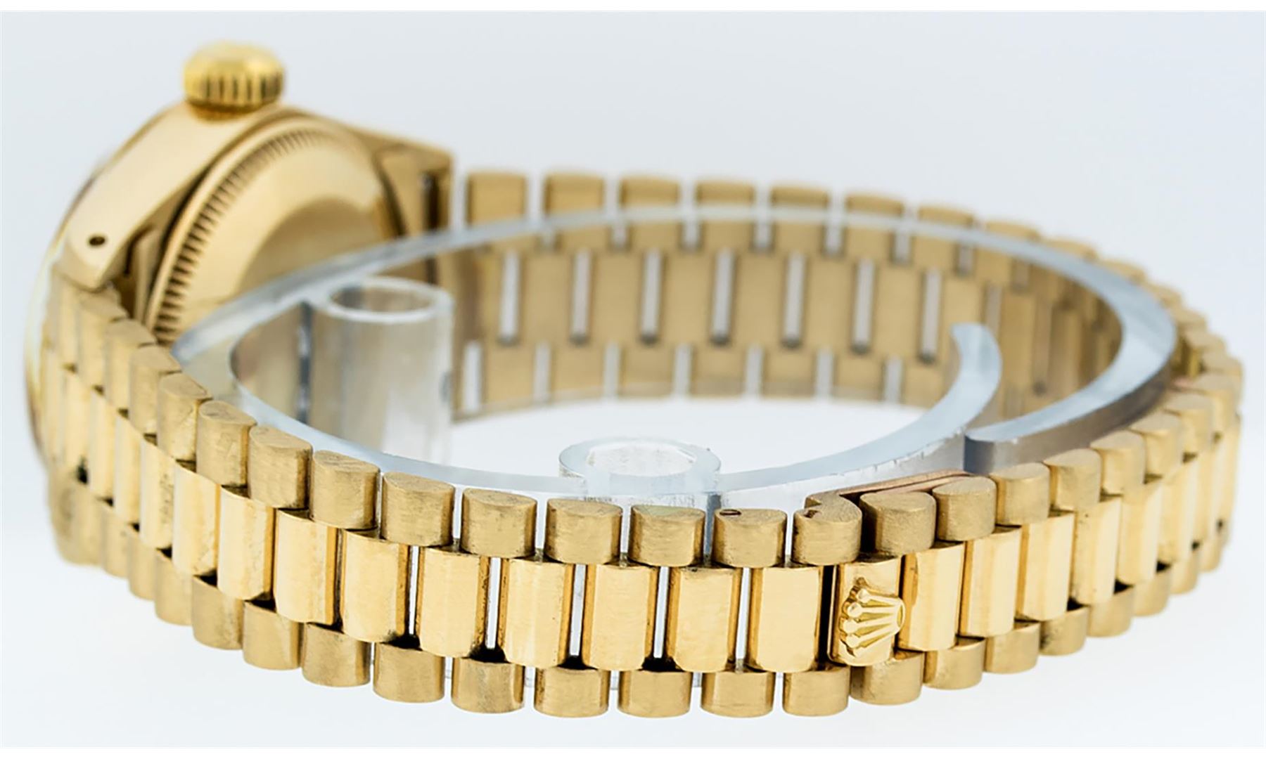 One Ladies Pre Owned Rolex 18K Yellow Gold President Polished, Serviced & Electronically Tested, Rolex 18K Yellow Gold Case: 26mm, Rolex 18K Yellow Gold Crown, Rolex Bezel: 18K Yellow Gold Fluted Bezel. Custom Crystal: New Acrylic Cyclops Lens. Movement: Automatic Winding Movement. Custom Dial: Refinished To Champagne With Added Diamonds, Color: G to H, Diamond Count: 10 Diamonds In Dial, Clarity: SI-VS. Date Window: 3 O'Clock Position, Model: Datejust. Condition: G-6 Extra, Fine The Watch Is In Very Good Condition Free Of All Scratches And Dents. Rolex Bracelet: 18K Yellow Gold President Band, Bright & Satin Polish. 6.0 Inch Length, Standard President Clasp (Hidden Clasp), With Rolex Logo.