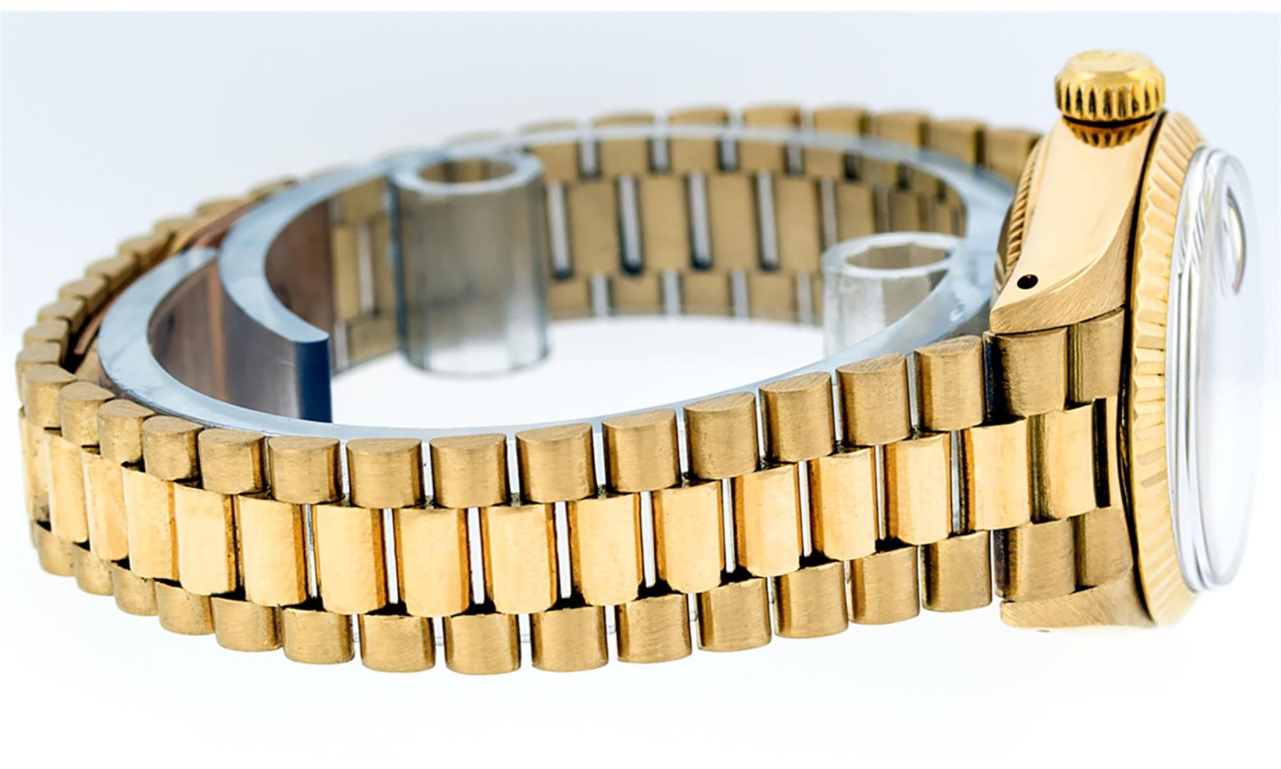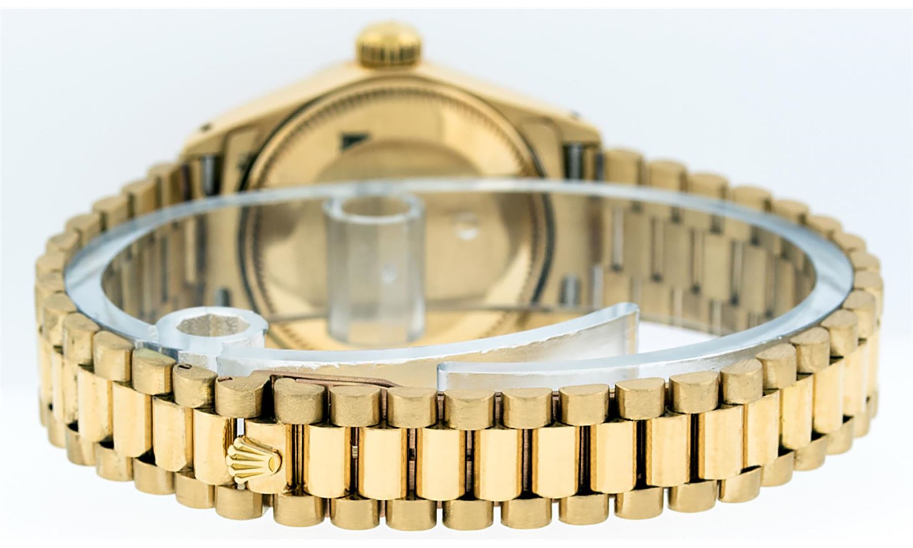 One Ladies Pre Owned Rolex 18K Yellow Gold President Polished, Serviced & Electronically Tested, Rolex 18K Yellow Gold Case: 26mm, Rolex 18K Yellow Gold Crown, Rolex Bezel: 18K Yellow Gold Fluted Bezel. Custom Crystal: New Acrylic Cyclops Lens. Movement: Automatic Winding Movement. Custom Dial: Refinished To Champagne With Added Diamonds, Color: G to H, Diamond Count: 10 Diamonds In Dial, Clarity: SI-VS. Date Window: 3 O'Clock Position, Model: Datejust. Condition: G-6 Extra, Fine The Watch Is In Very Good Condition Free Of All Scratches And Dents. Rolex Bracelet: 18K Yellow Gold President Band, Bright & Satin Polish. 6.0 Inch Length, Standard President Clasp (Hidden Clasp), With Rolex Logo.