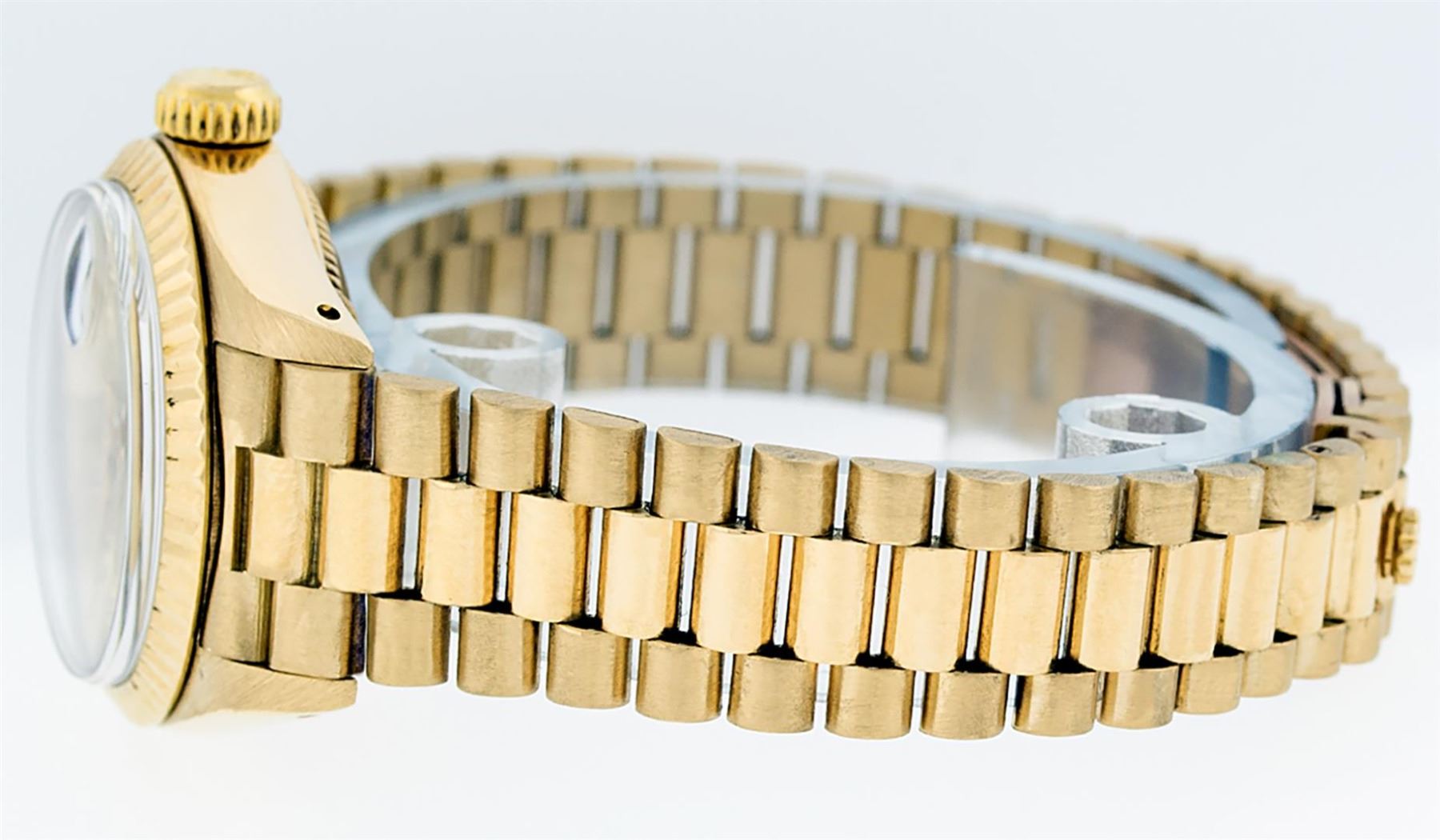 One Ladies Pre Owned Rolex 18K Yellow Gold President Polished, Serviced & Electronically Tested, Rolex 18K Yellow Gold Case: 26mm, Rolex 18K Yellow Gold Crown, Rolex Bezel: 18K Yellow Gold Fluted Bezel. Custom Crystal: New Acrylic Cyclops Lens. Movement: Automatic Winding Movement. Custom Dial: Refinished To Champagne With Added Diamonds, Color: G to H, Diamond Count: 10 Diamonds In Dial, Clarity: SI-VS. Date Window: 3 O'Clock Position, Model: Datejust. Condition: G-6 Extra, Fine The Watch Is In Very Good Condition Free Of All Scratches And Dents. Rolex Bracelet: 18K Yellow Gold President Band, Bright & Satin Polish. 6.0 Inch Length, Standard President Clasp (Hidden Clasp), With Rolex Logo.