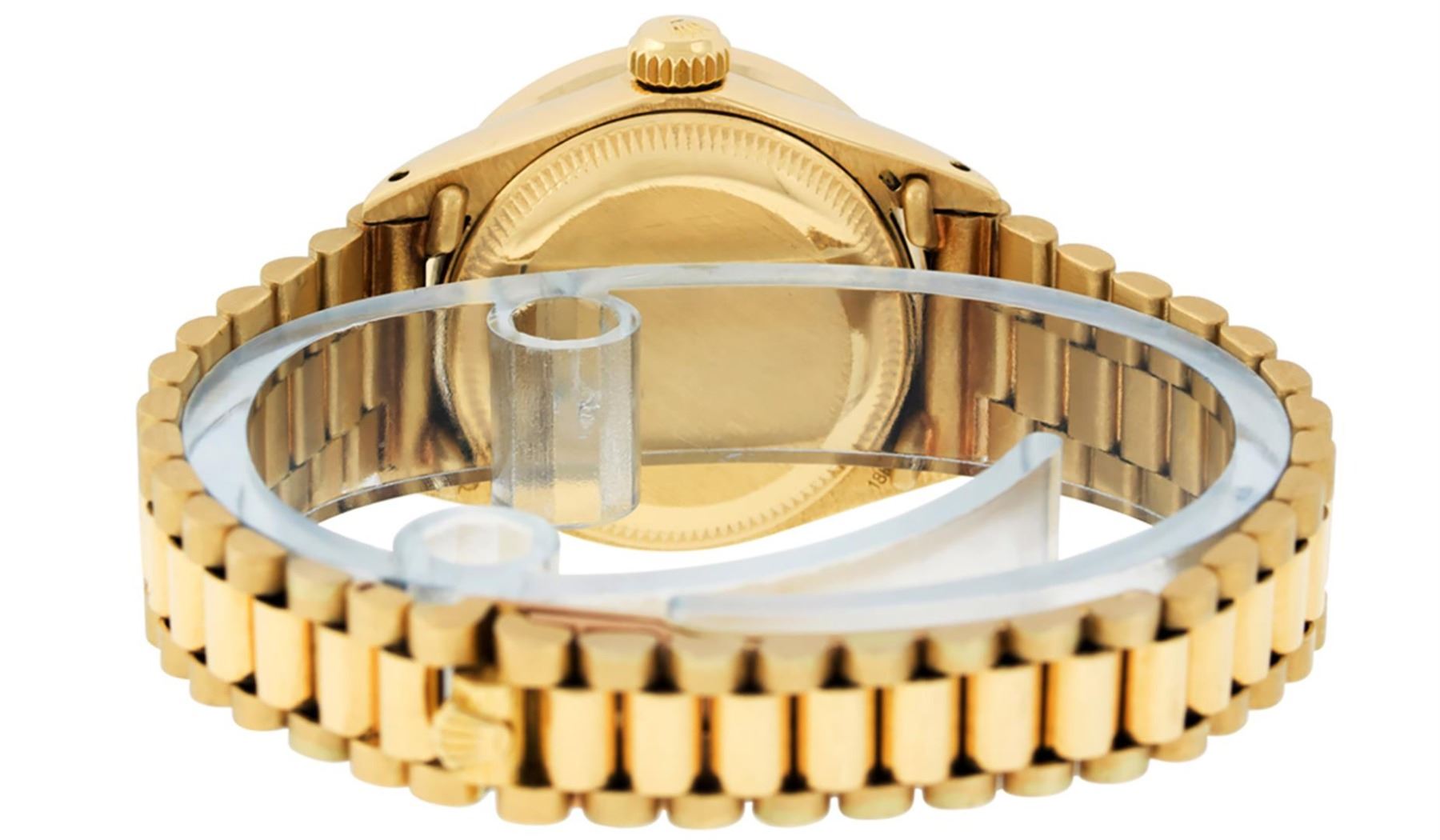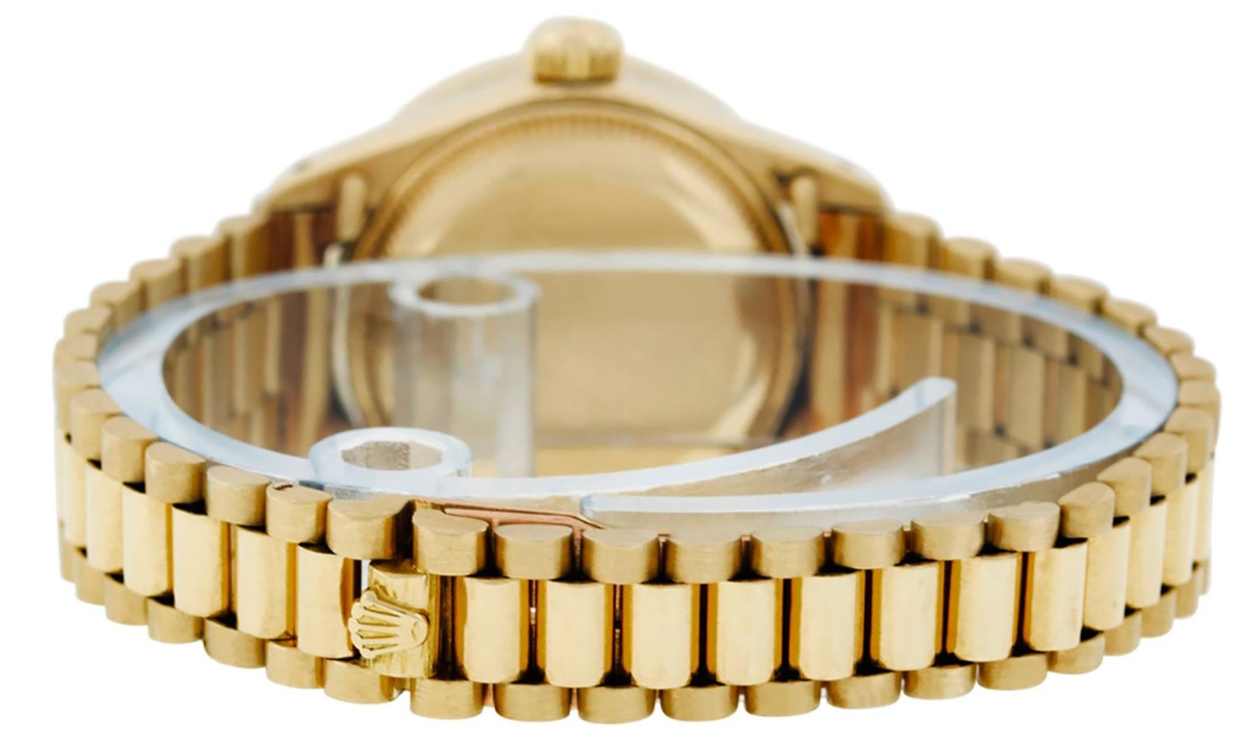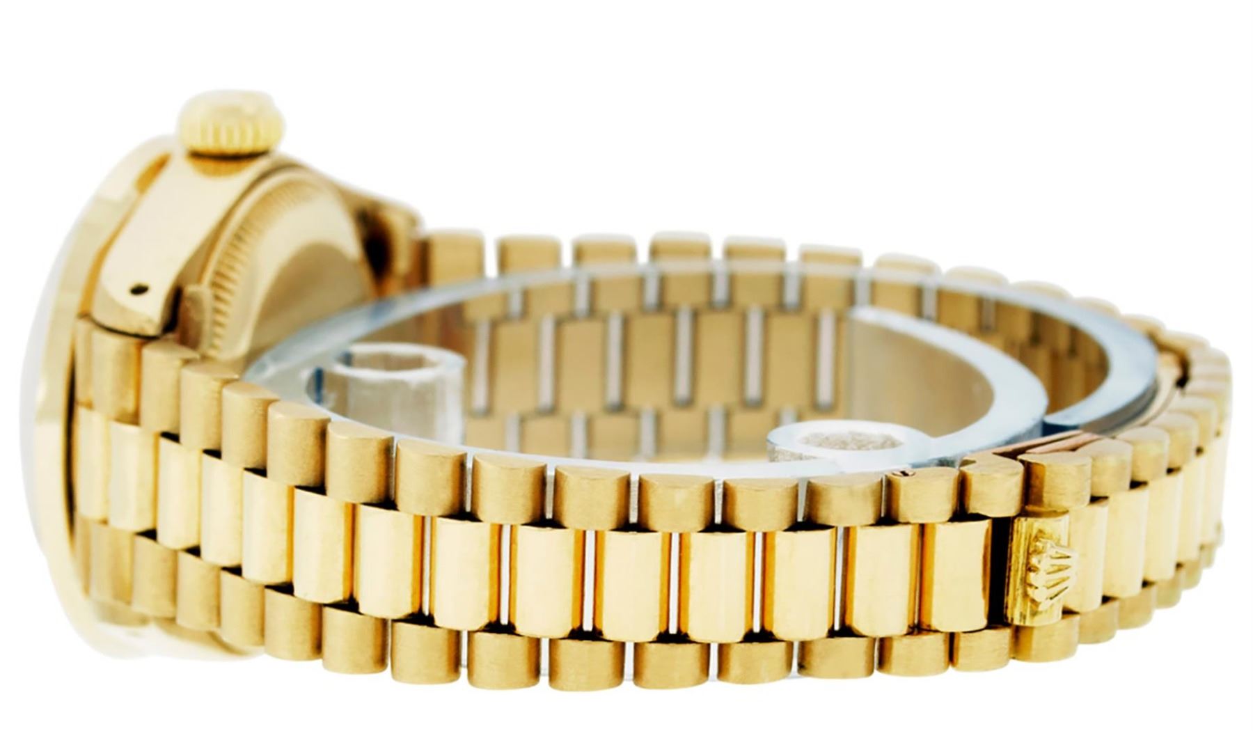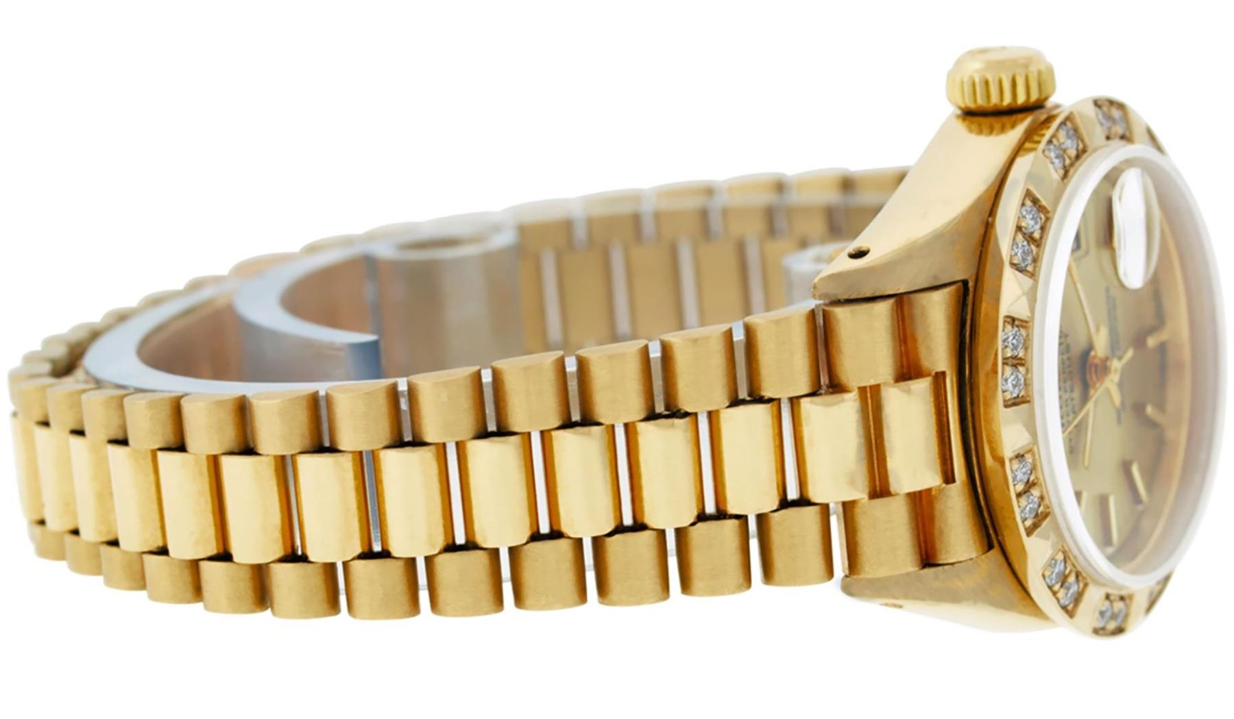 One Ladies Pre Owned 18K Yellow Gold Rolex President Polished, Serviced & Electronically Tested, Rolex Yellow Gold Case: 26mm, Rolex 18K Yellow Gold Crown, Custom Bezel: New 18K Yellow Gold Pyramid Bezel With Genuine Diamonds, Diamond Count: 24 Diamonds In Bezel. Total Weight .50 Carat, Clarity: SI-VS, Color: G to H. Custom Crystal: New Sapphire With Magnified Date Window. Custom Hands: New Luminescent Hands. Rolex Movement: Automatic Winding Movement. Rolex Dial: Champagne Index With Dash Track & Lumi Dots. Date Window: 3 O'Clock Position, Model: President, Condition: G-6 Extra Fine. Rolex Bracelet: 18K Yellow Gold President With Hidden Clasp, Bright & Satin Polish. 6.0 Inch Length, Standard President Clasp (Hidden Clasp), With Rolex Logo. This Watch Has Been Serviced Time Tested And Is In Excellent Condition It Is Free Of All Scratches And Dents.