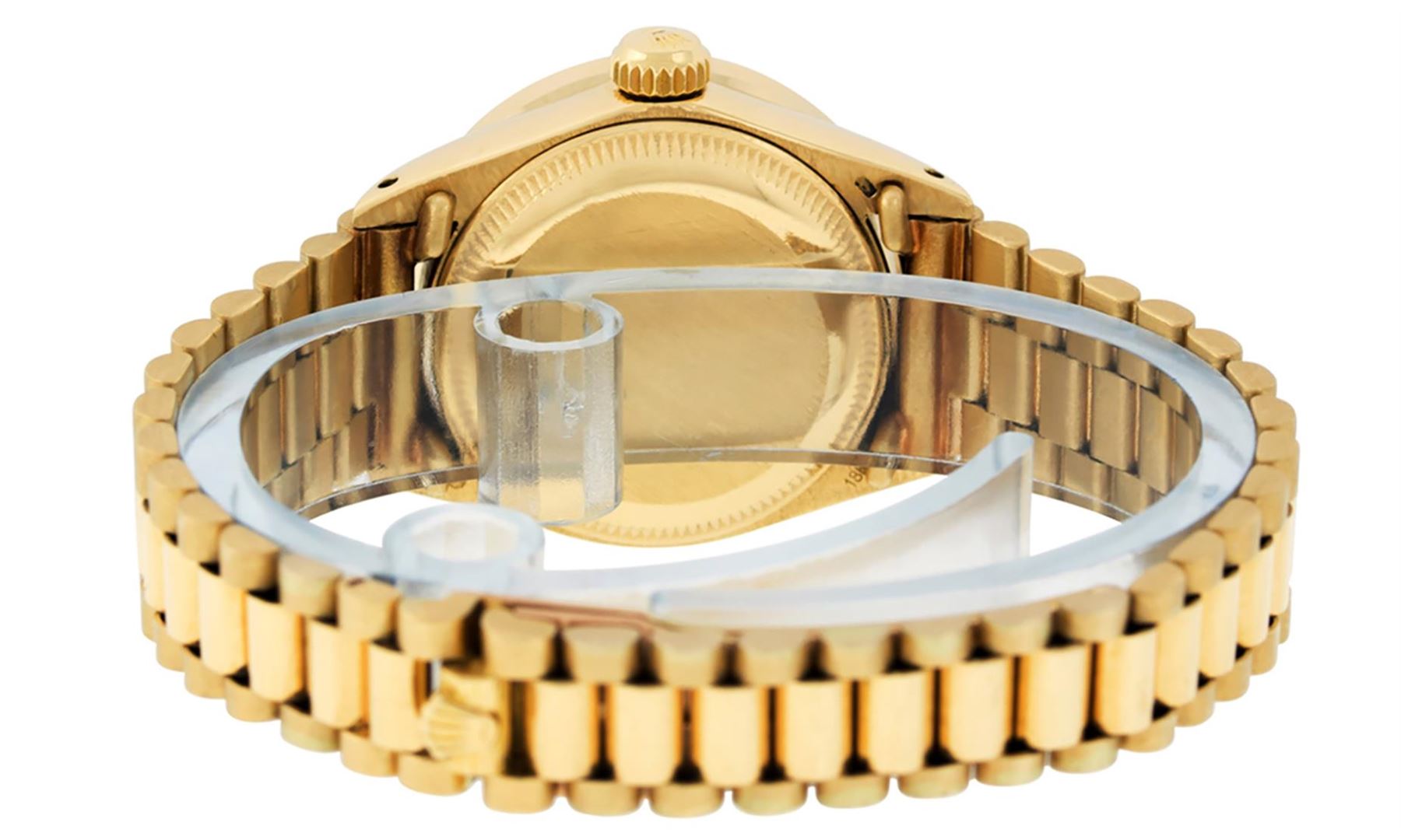 One Ladies Pre Owned 18K Yellow Gold Rolex President Polished, Serviced & Electronically Tested, Rolex Yellow Gold Case: 26mm, Rolex 18K Yellow Gold Crown, Custom Bezel: New 18K Yellow Gold Pyramid Bezel With Genuine Diamonds, Diamond Count: 24 Diamonds In Bezel. Total Weight .50 Carat, Clarity: SI-VS, Color: G to H. Custom Crystal: New Sapphire With Magnified Date Window. Custom Hands: New Luminescent Hands. Rolex Movement: Automatic Winding Movement. Rolex Dial: Champagne Index With Dash Track & Lumi Dots. Date Window: 3 O'Clock Position, Model: President, Condition: G-6 Extra Fine. Rolex Bracelet: 18K Yellow Gold President With Hidden Clasp, Bright & Satin Polish. 6.0 Inch Length, Standard President Clasp (Hidden Clasp), With Rolex Logo. This Watch Has Been Serviced Time Tested And Is In Excellent Condition It Is Free Of All Scratches And Dents.