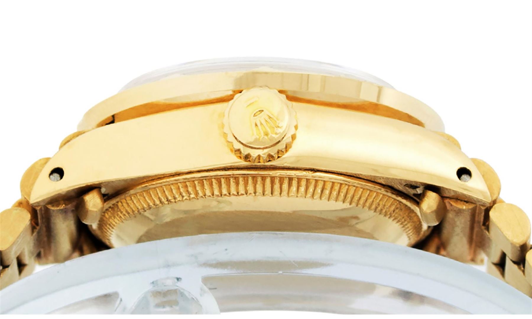 One Ladies Pre Owned 18K Yellow Gold Rolex President Polished, Serviced & Electronically Tested, Rolex Yellow Gold Case: 26mm, Rolex 18K Yellow Gold Crown, Custom Bezel: New 18K Yellow Gold Pyramid Bezel With Genuine Diamonds, Diamond Count: 24 Diamonds In Bezel. Total Weight.50 Carat, Clarity: SI-VS, Color: G to H. Custom Crystal: New Sapphire With Magnified Date Window. Custom Hands: New Luminescent Hands. Rolex Movement: Automatic Winding Movement. Rolex Dial: Champagne Index With Dash Track & Lumi Dots. Date Window: 3 O'Clock Position, Model: President, Condition: G-6 Extra Fine. Rolex Bracelet: 18K Yellow Gold President With Hidden Clasp, Bright & Satin Polish. 6.0 Inch Length, Standard President Clasp (Hidden Clasp), With Rolex Logo. This Watch Has Been Serviced Time Tested And Is In Excellent Condition It Is Free Of All Scratches And Dents.