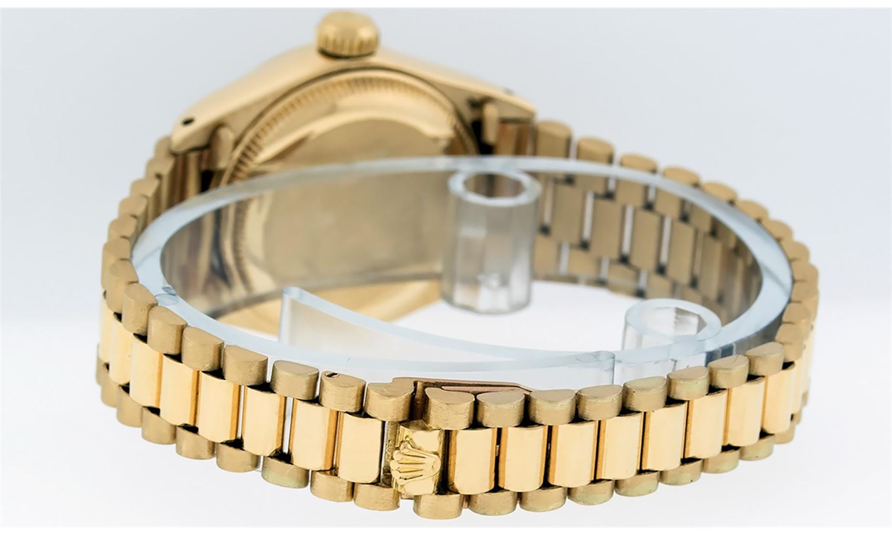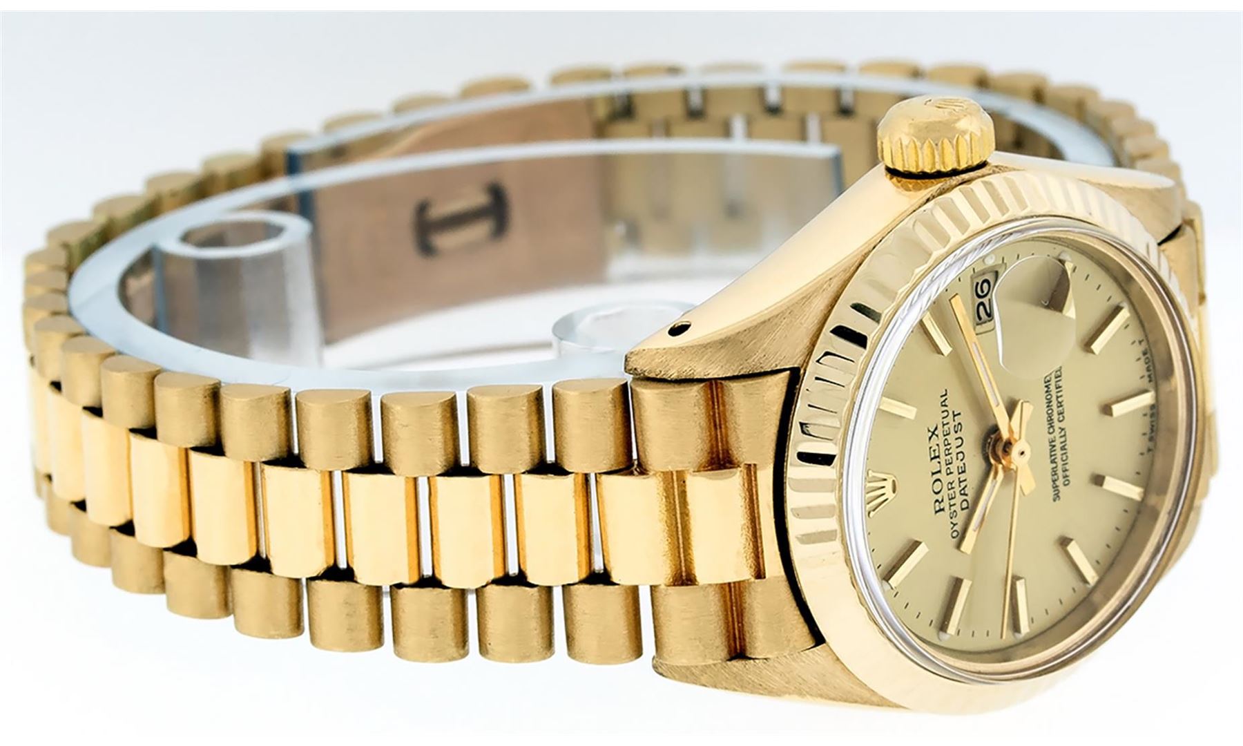 One Ladies Pre Owned Rolex 18K Yellow Gold President Polished, Serviced & Electronically Tested, Rolex 18K Yellow Gold Case: 26mm, Rolex 18K Yellow Gold Crown, Rolex Bezel: 18K Yellow Gold Fluted Bezel. Custom Crystal: New Acrylic Cyclops Lens. Custom Hands: New Luminescent Hands. Rolex Movement: Automatic Winding Movement. Rolex Dial: Champagne Index Dial. Date Window: 3 O'Clock Position, Model: Datejust President. Condition: G-6 Extra Fine The Watch Is In Very Good Condition Free Of All Scratches And Dents. Rolex Bracelet: 18K Yellow Gold President Band, Bright & Satin Polish. 6.0 Inch Length, Standard President Clasp (Hidden Clasp), With Rolex Logo.