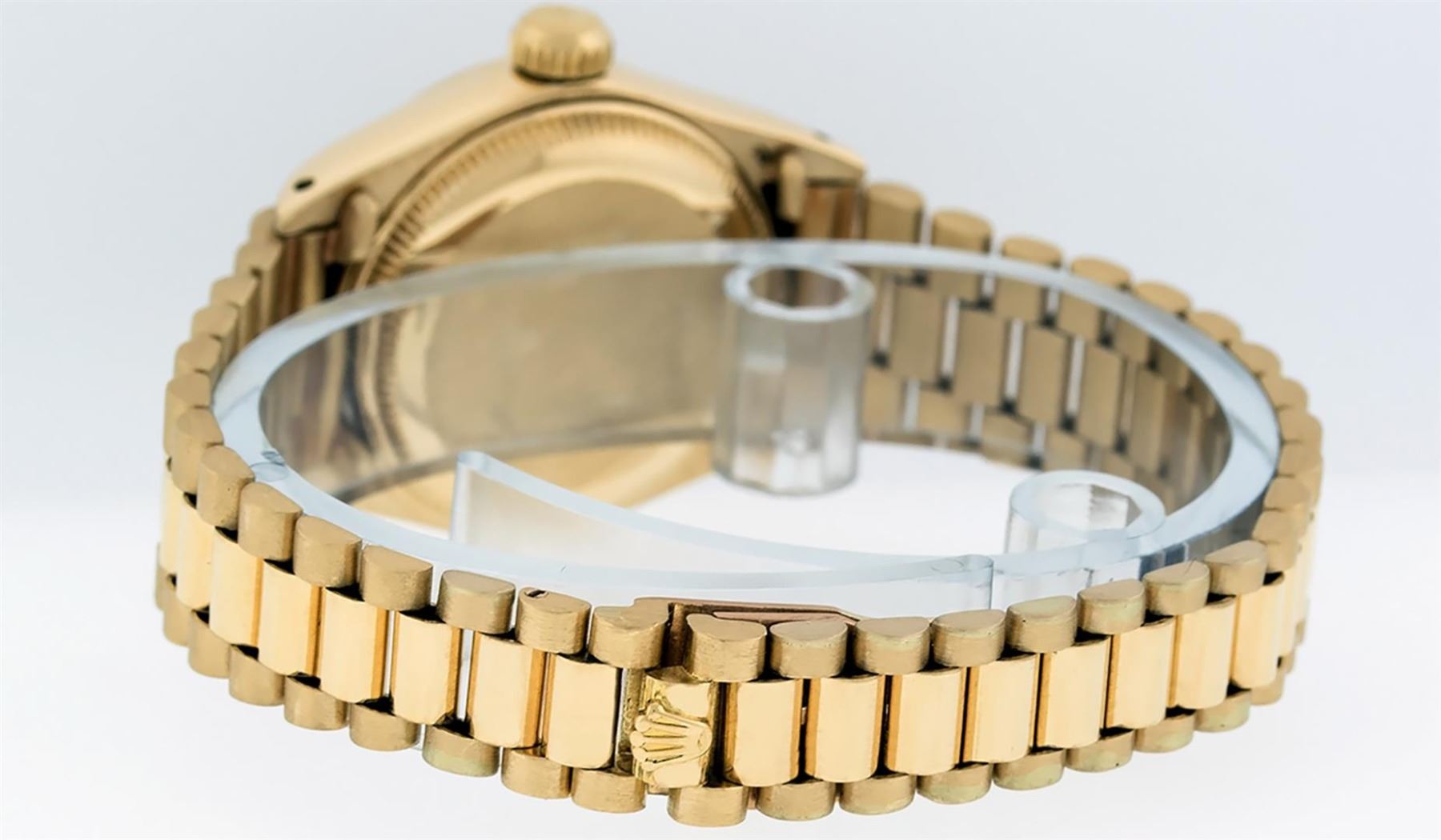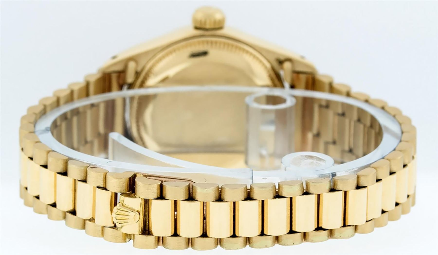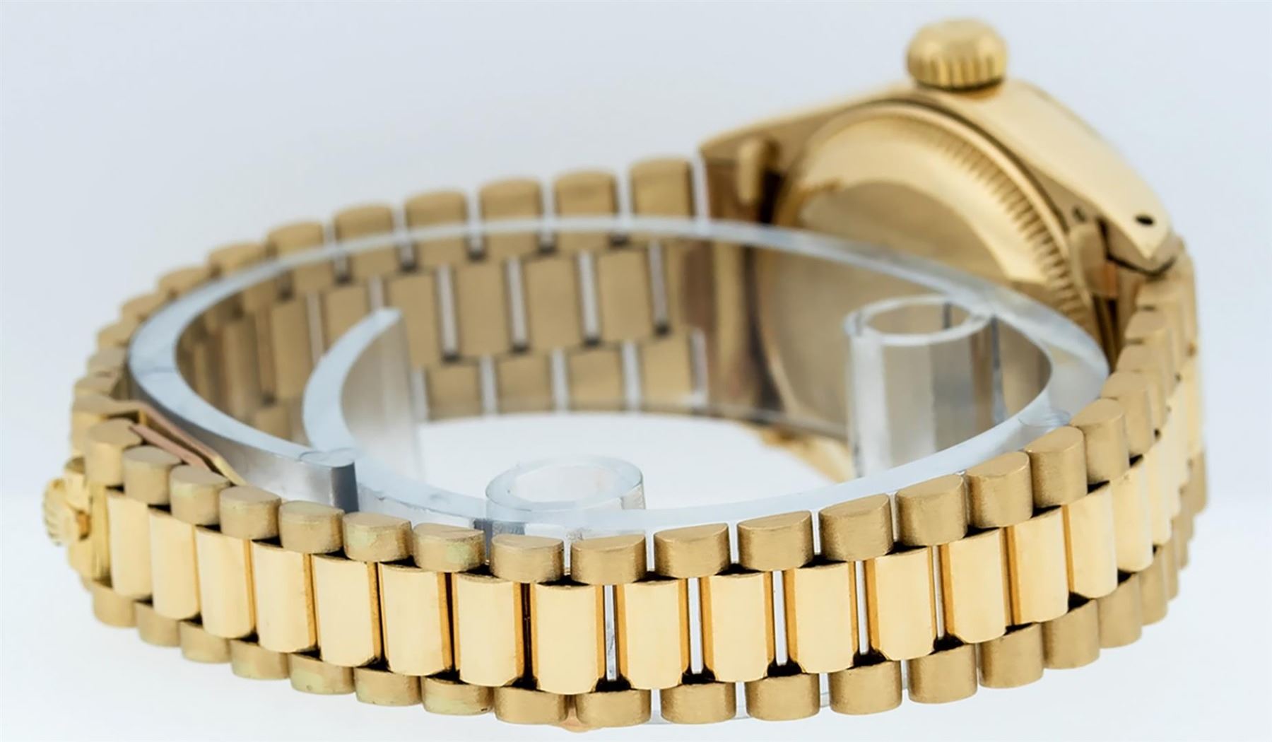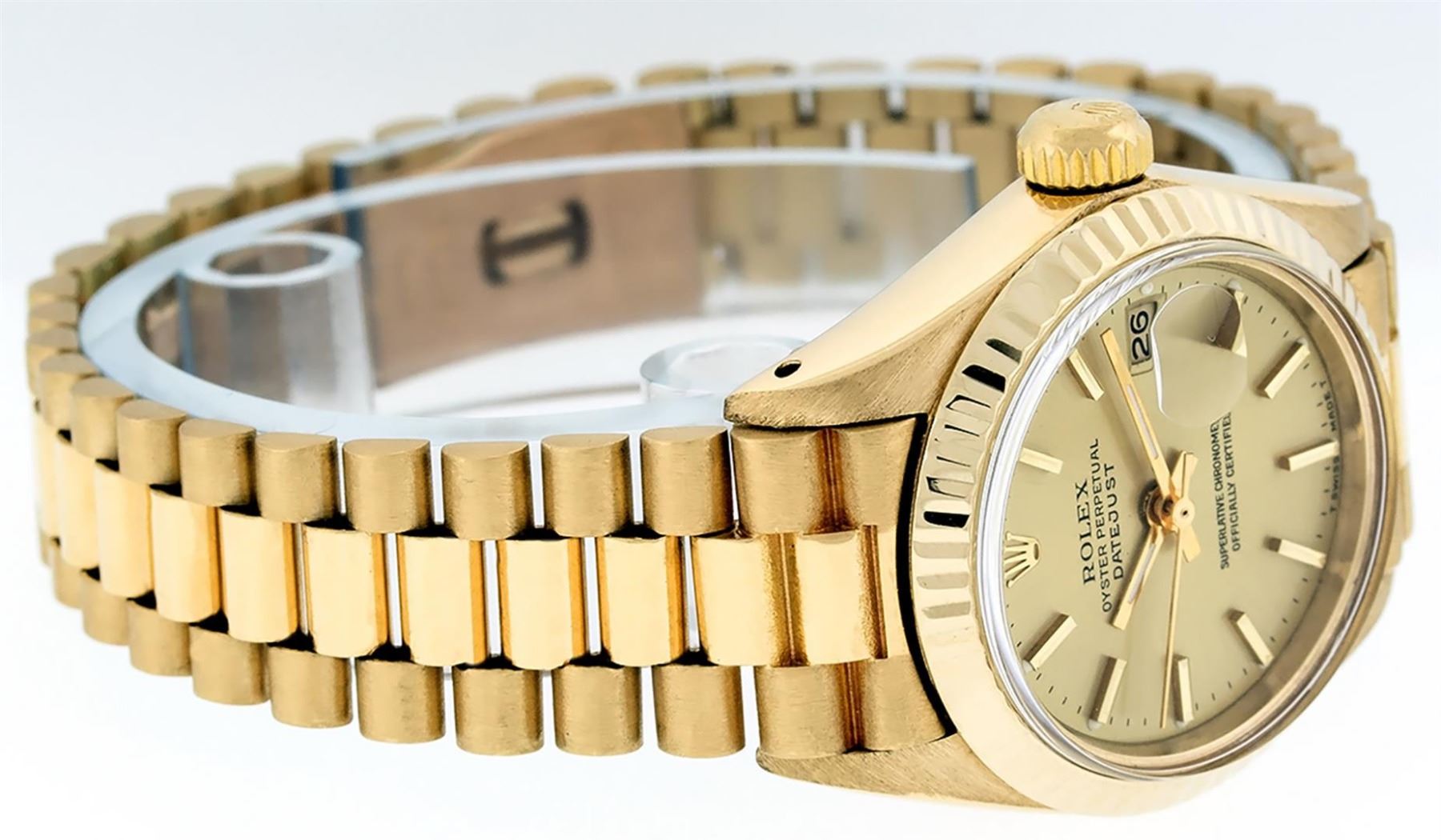 One Ladies Pre Owned Rolex 18K Yellow Gold President Polished, Serviced & Electronically Tested, Rolex 18K Yellow Gold Case: 26mm, Rolex 18K Yellow Gold Crown, Rolex Bezel: 18K Yellow Gold Fluted Bezel. Custom Crystal: New Acrylic With Magnified Date Window. Custom Hands: New Luminescent Hands. Rolex Movement: Automatic Winding Movement. Rolex Dial: Champagne Index Dial. Date Window: 3 O'Clock Position, Model: President. Condition: G-6 Extra Fine. Rolex Bracelet: 18K Yellow Gold President Band, Bright & Satin Polish. 6.0 Inch Length, Standard President Clasp (Hidden Clasp), With Rolex Logo. Watch Has Been Serviced And Polished It Is Free Of All Scratches And Dents.