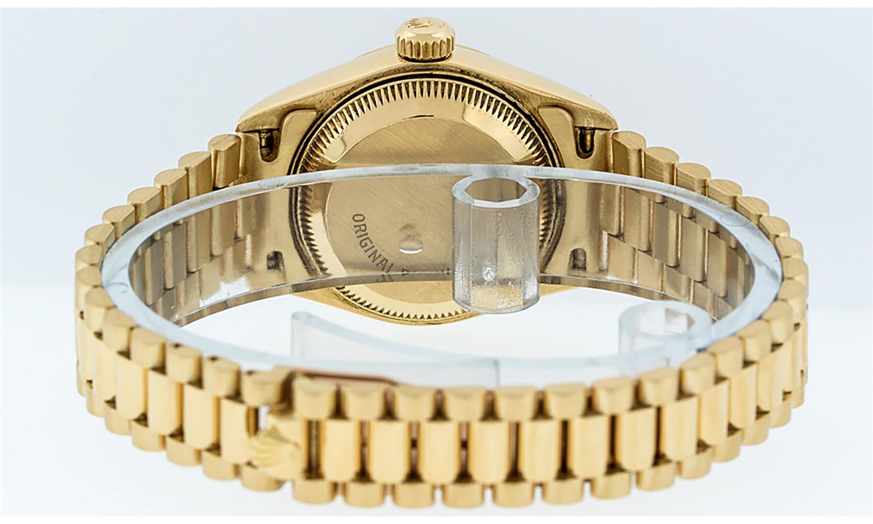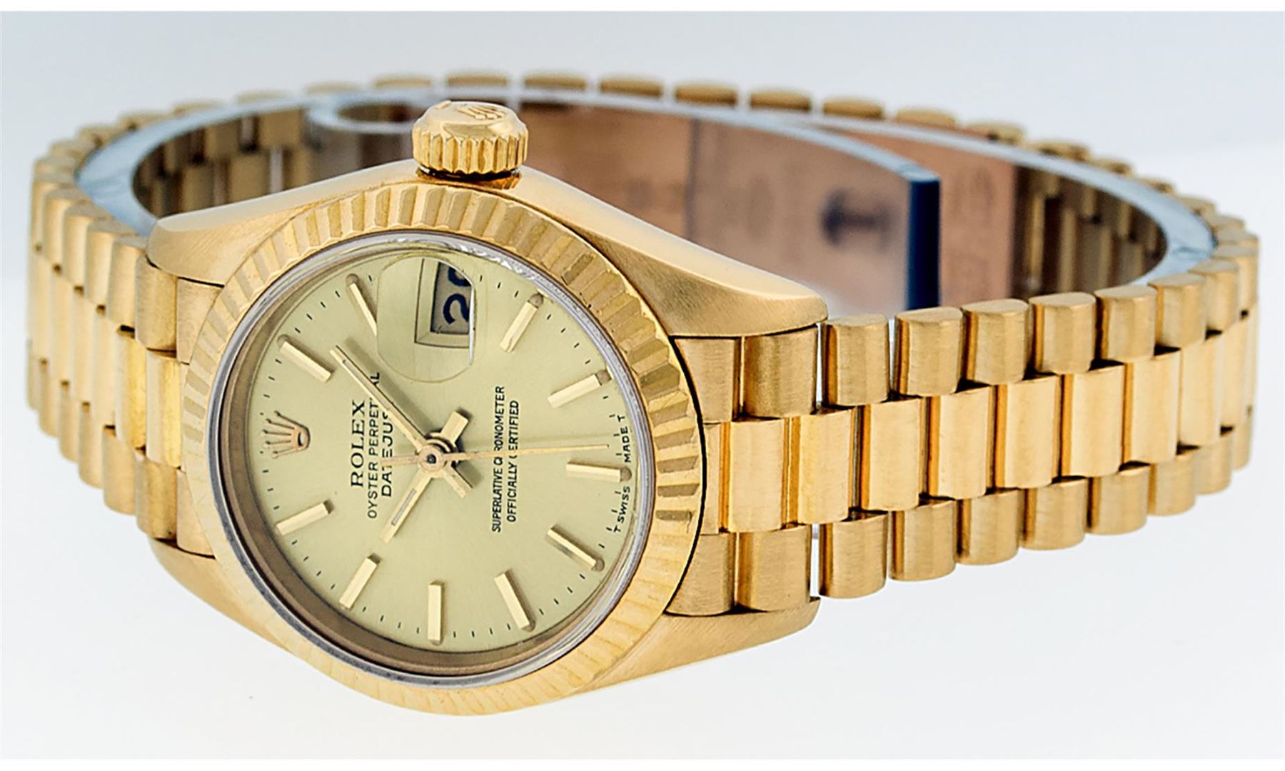 One Ladies Pre Owned Quickset Rolex 18K Yellow Gold President Polished, Serviced & Electronically Tested, Rolex 18K Yellow Gold Case: 26mm, Rolex 18K Yellow Gold Crown, Rolex Bezel: 18K Yellow Gold Fluted Bezel. Rolex Crystal: Sapphire With Cyclops Lens. Rolex Hands: Luminescent Hands. Rolex Movement: Automatic Winding Quickset Movement. Rolex Dial: Champagne Index Dial With Dash Track & Lumi Dots. Date Window: 3 O'Clock Position, Model: Datejust. Condition: G-6 Extra Fine The Watch Is In Very Good Condition Free Of All Scratches And Dents. Rolex Bracelet: 18K Yellow Gold President Band, Bright & Satin Polish. 6.0 Inch Length, Standard President Clasp (Hidden Clasp), With Rolex Logo.