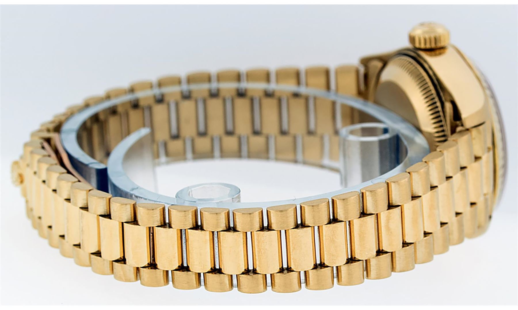 One Ladies Pre Owned Quickset Rolex 18K Yellow Gold President Polished, Serviced & Electronically Tested, Rolex 18K Yellow Gold Case: 26mm, Rolex 18K Yellow Gold Crown, Rolex Bezel: 18K Yellow Gold Fluted Bezel. Rolex Crystal: Sapphire With Cyclops Lens. Rolex Hands: Luminescent Hands. Rolex Movement: Automatic Winding Quickset Movement. Rolex Dial: Champagne Index Dial With Dash Track & Lumi Dots. Date Window: 3 O'Clock Position, Model: Datejust. Condition: G-6 Extra Fine The Watch Is In Very Good Condition Free Of All Scratches And Dents. Rolex Bracelet: 18K Yellow Gold President Band, Bright & Satin Polish. 6.0 Inch Length, Standard President Clasp (Hidden Clasp), With Rolex Logo.