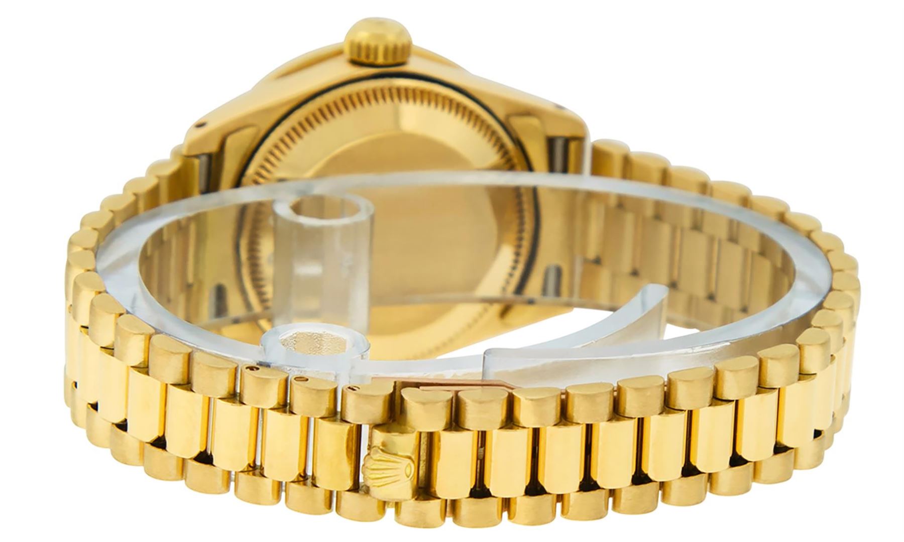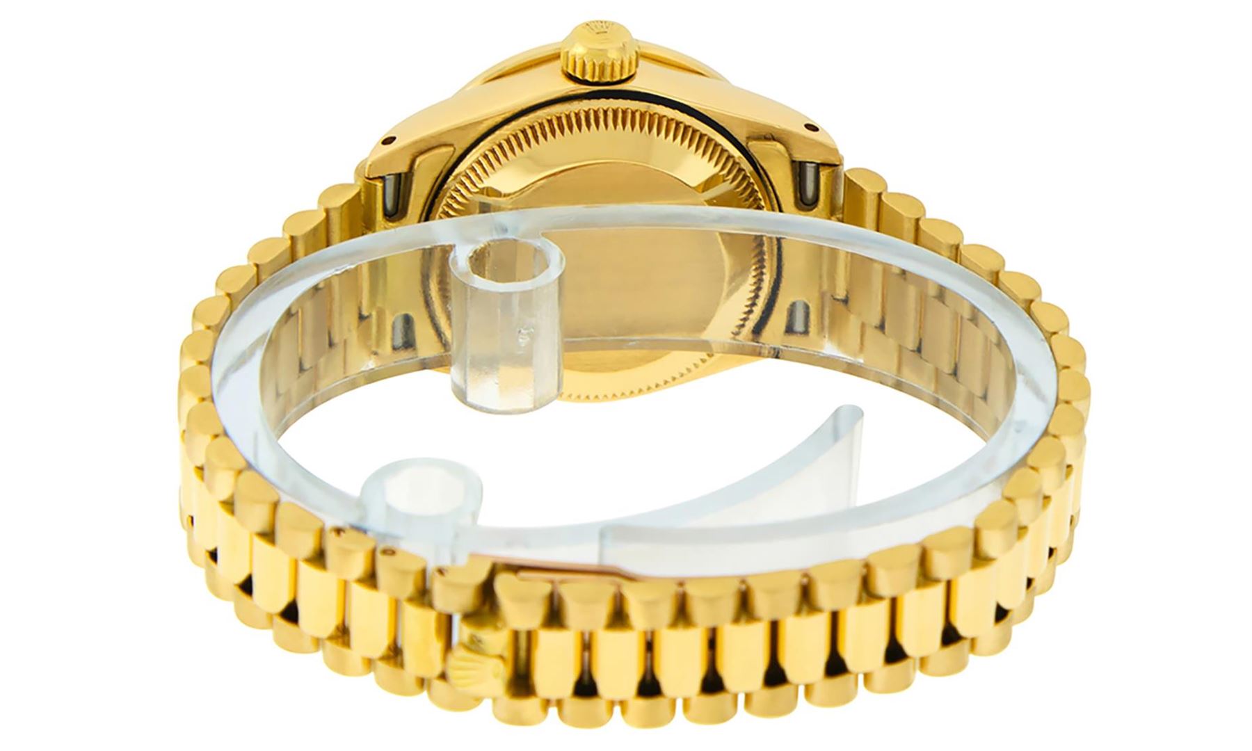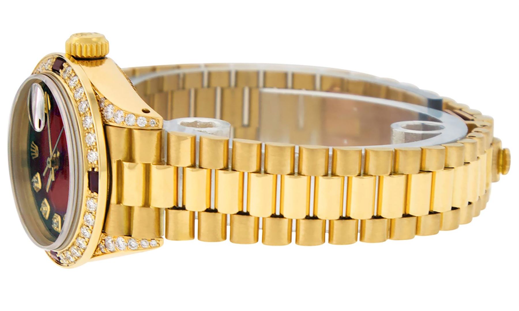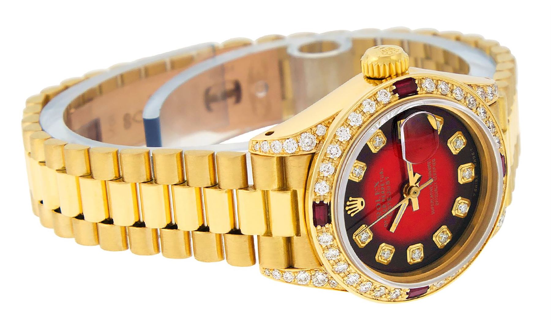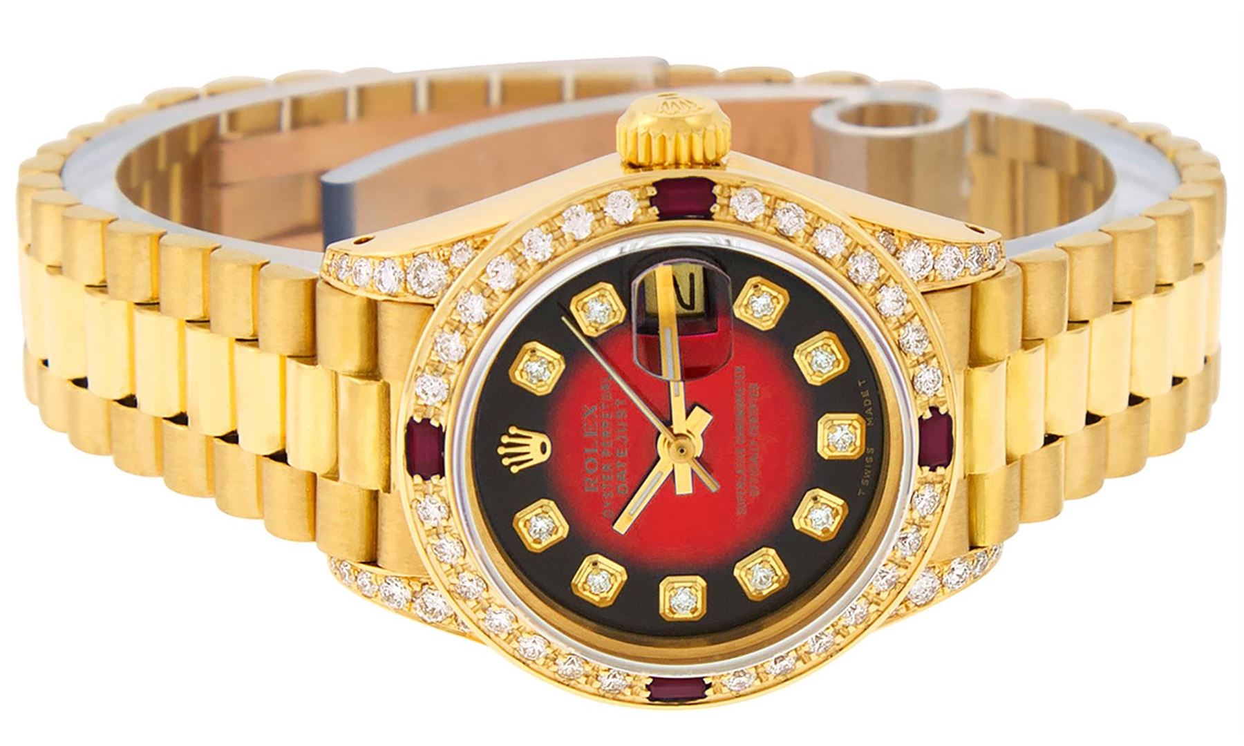 One Ladies Pre Owned Rolex President Polished, Serviced & Electronically Tested, Yellow Gold Case With Custom Diamond Lugs: 26mm G to H In Color, SI1, Yellow Gold Crown, Custom Diamond Lugs: 24 Diamonds On Lugs. Custom Bezel: New 18K Yellow Gold Ruby Beadset Diamond Bezel, Diamond + Gem Count: 36 Diamonds + 4 Rubies, Custom Crystal: New Sapphire With Date Window. Custom Hands: New Luminescent Hands. Rolex Movement: Automatic Winding Movement. Custom Dial: Refinished To Red Vignette With Custom Added Diamond Hour Markers, Stone Count: 10 Diamonds On Dial. Clarity: SI-VS. Date Window: 3 O'Clock Position, Model: Datejust, Condition: G-6 Extra Fine. Rolex Bracelet: 18K Yellow Gold President Band, Bright & Satin Polish. 6.0 Inch Length, Standard President Clasp (Hidden Clasp), With Rolex Logo. This Watch Has Been Serviced Time Tested And Is In Excellent Condition It Is Free Of All Scratches And Dents.