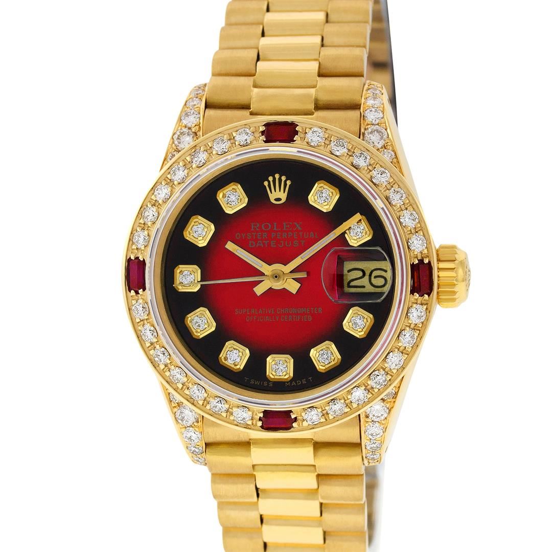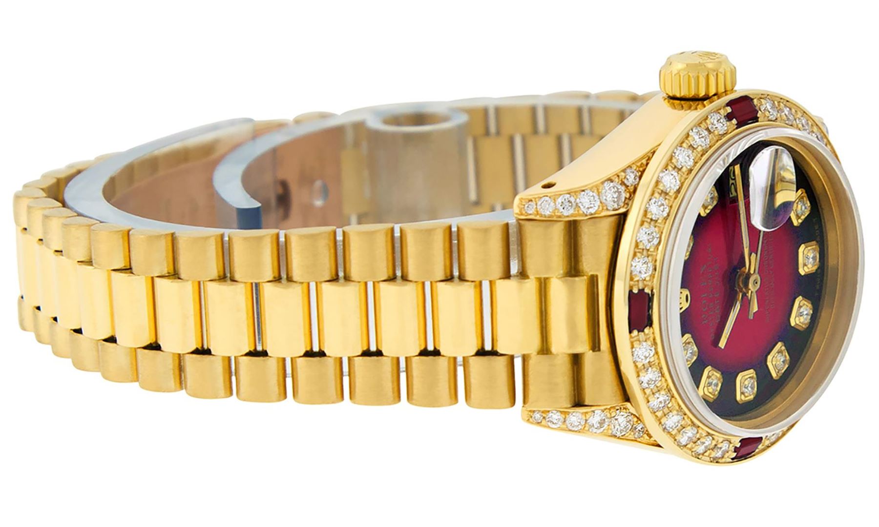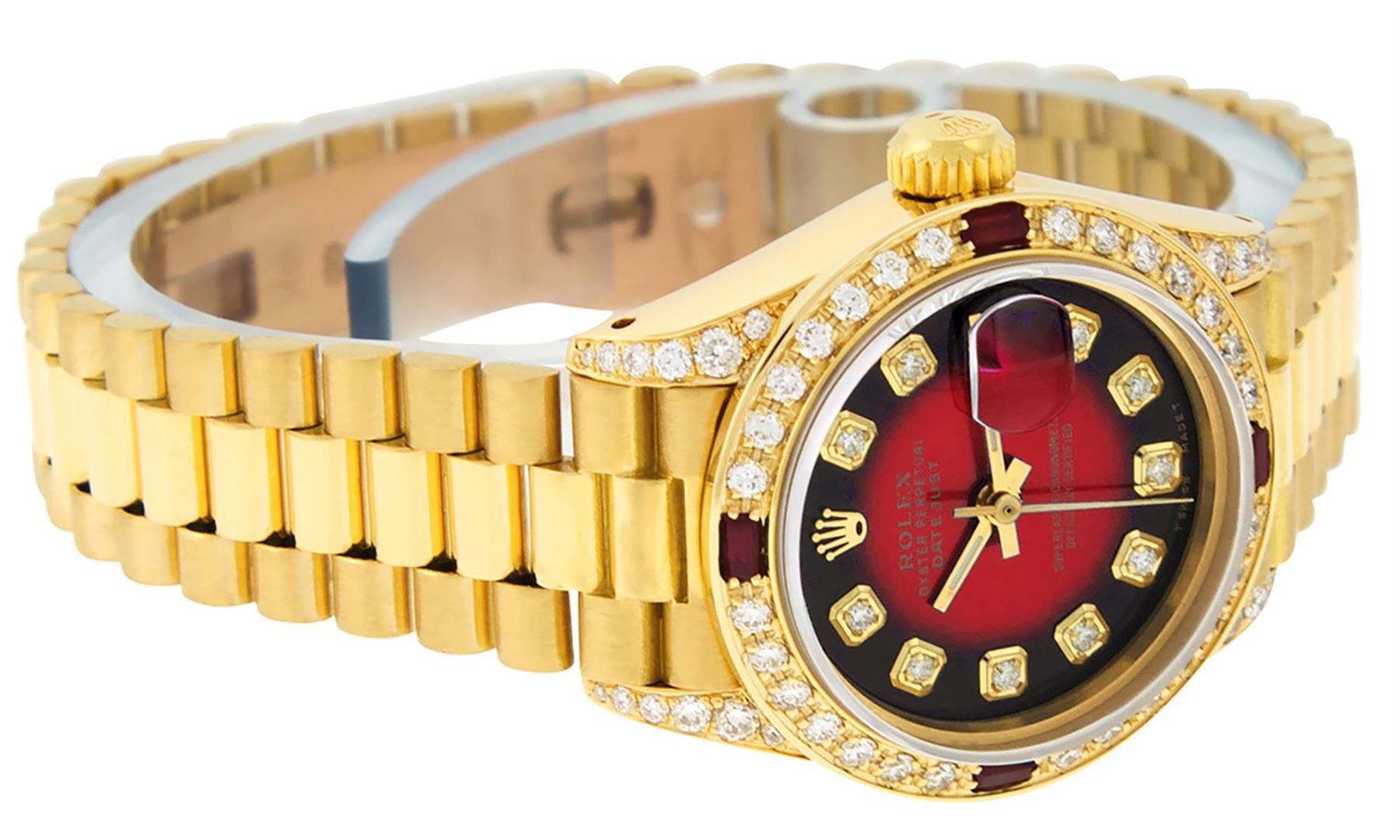 One Ladies Pre Owned Rolex President Polished, Serviced & Electronically Tested, Yellow Gold Case With Custom Diamond Lugs: 26mm G to H In Color, SI1, Yellow Gold Crown, Custom Diamond Lugs: 24 Diamonds On Lugs. Custom Bezel: New 18K Yellow Gold Ruby Beadset Diamond Bezel, Diamond + Gem Count: 36 Diamonds + 4 Rubies, Custom Crystal: New Sapphire With Date Window. Custom Hands: New Luminescent Hands. Rolex Movement: Automatic Winding Movement. Custom Dial: Refinished To Red Vignette With Custom Added Diamond Hour Markers, Stone Count: 10 Diamonds On Dial. Clarity: SI-VS. Date Window: 3 O'Clock Position, Model: Datejust, Condition: G-6 Extra Fine. Rolex Bracelet: 18K Yellow Gold President Band, Bright & Satin Polish. 6.0 Inch Length, Standard President Clasp (Hidden Clasp), With Rolex Logo. This Watch Has Been Serviced Time Tested And Is In Excellent Condition It Is Free Of All Scratches And Dents.