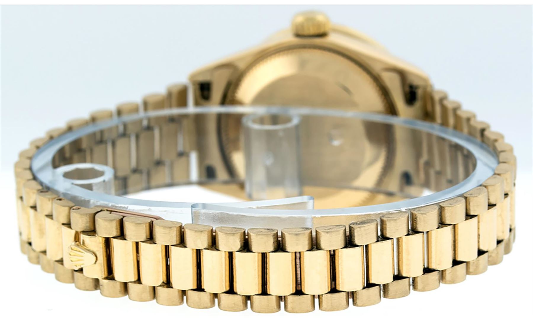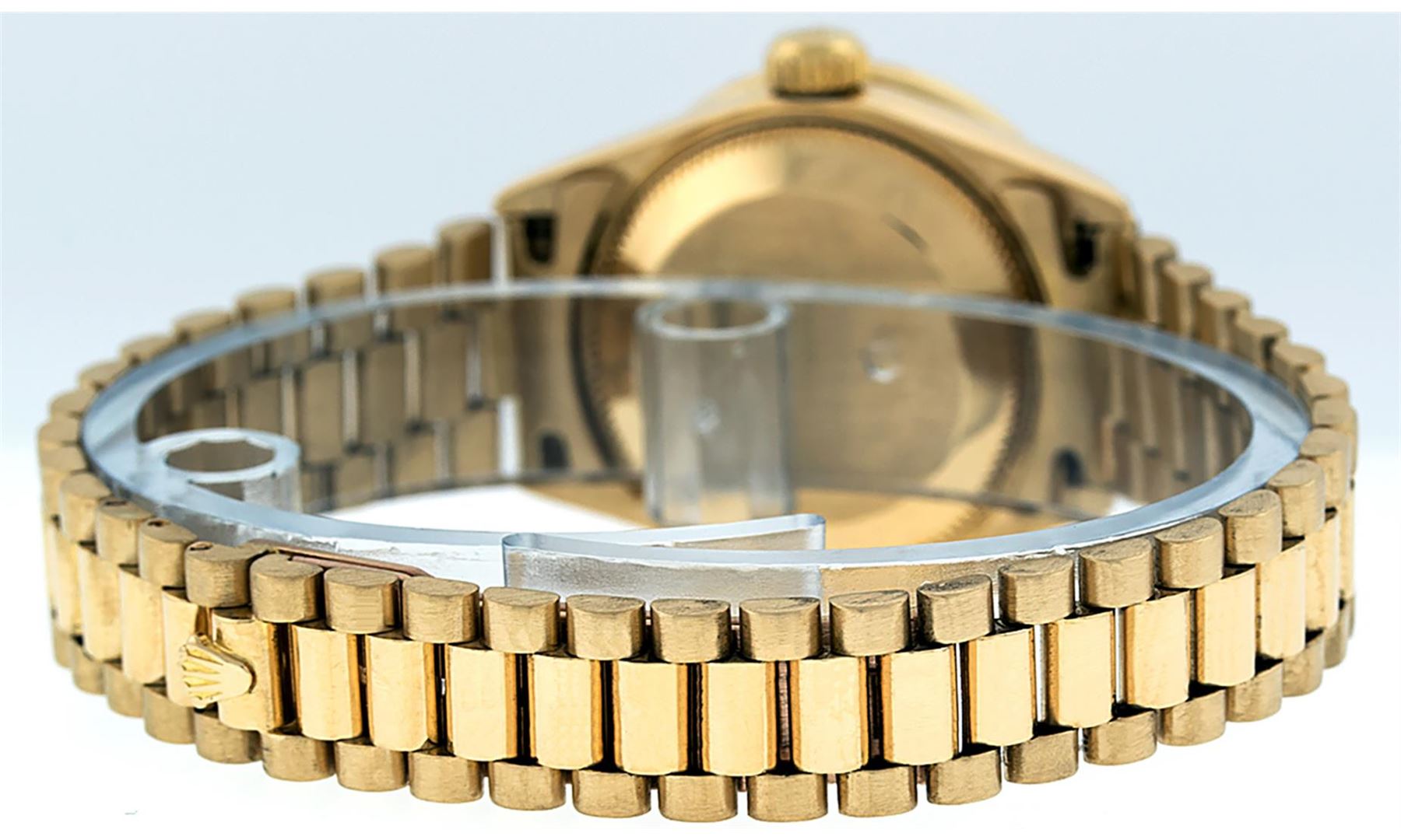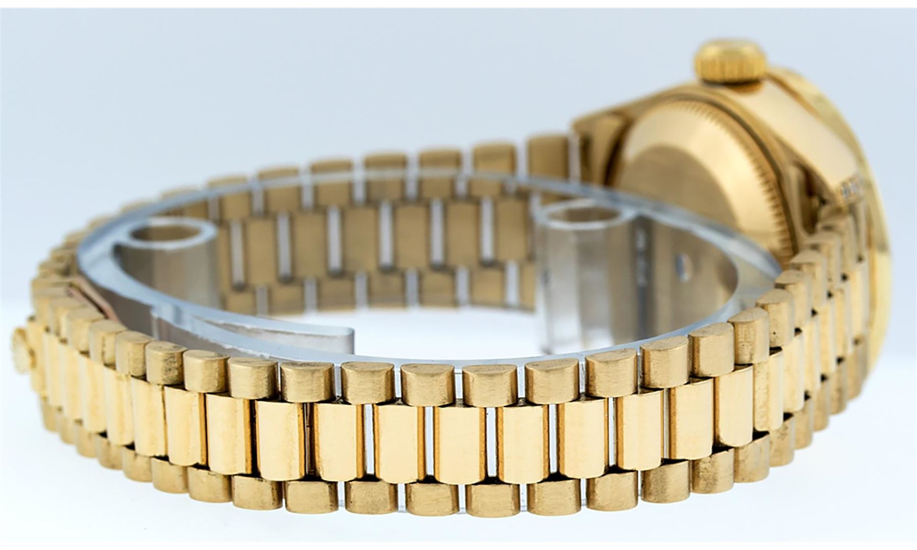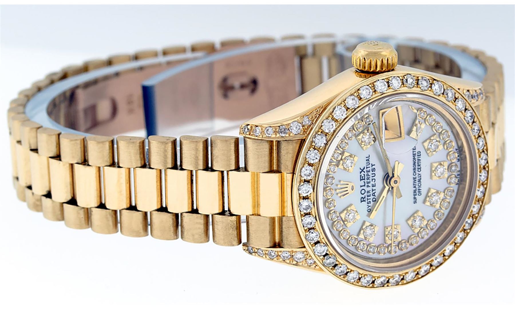 One Ladies Pre Owned Quickset Rolex 18K Yellow Gold President Polished, Serviced & Electronically Tested, 18K Yellow Gold Case With Custom Diamond Lugs: 24 Added Diamonds On Lugs, Case: 26mm, Yellow Gold Crown. Custom Bezel: New 18K Yellow Gold Beadset Diamond Bezel, Diamond Count: 32 Diamonds On Bezel. Custom Crystal: New Sapphire With Date Window. Custom Hands: New Luminescent Hands. Rolex Movement: Automatic Quickset Winding Movement. Custom Dial: Mother Of Pearl With Single Cut Diamond Hour Markers, Diamond Count: 43 Diamonds On Dial. Date Window: 3 O'Clock Position, Model: Datejust, Condition: G-6 Extra Fine. Rolex Bracelet: 18K Yellow Gold President Band, Bright & Satin Polish. 6.0 Inch Length, Standard President Clasp (Hidden Clasp), With Rolex Logo. This Watch Has Been Serviced Time Tested And Is In Excellent Condition It Is Free Of All Scratches And Dents.