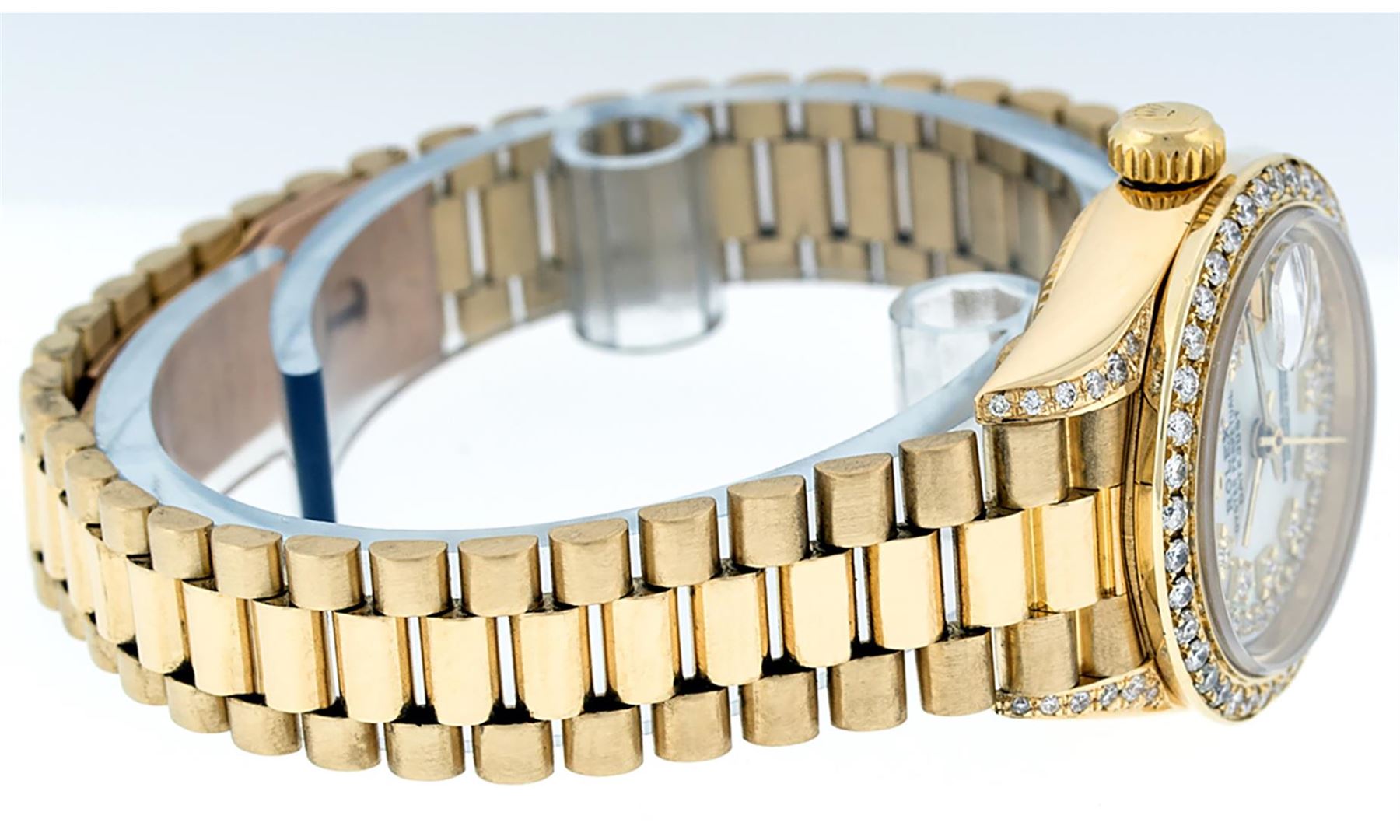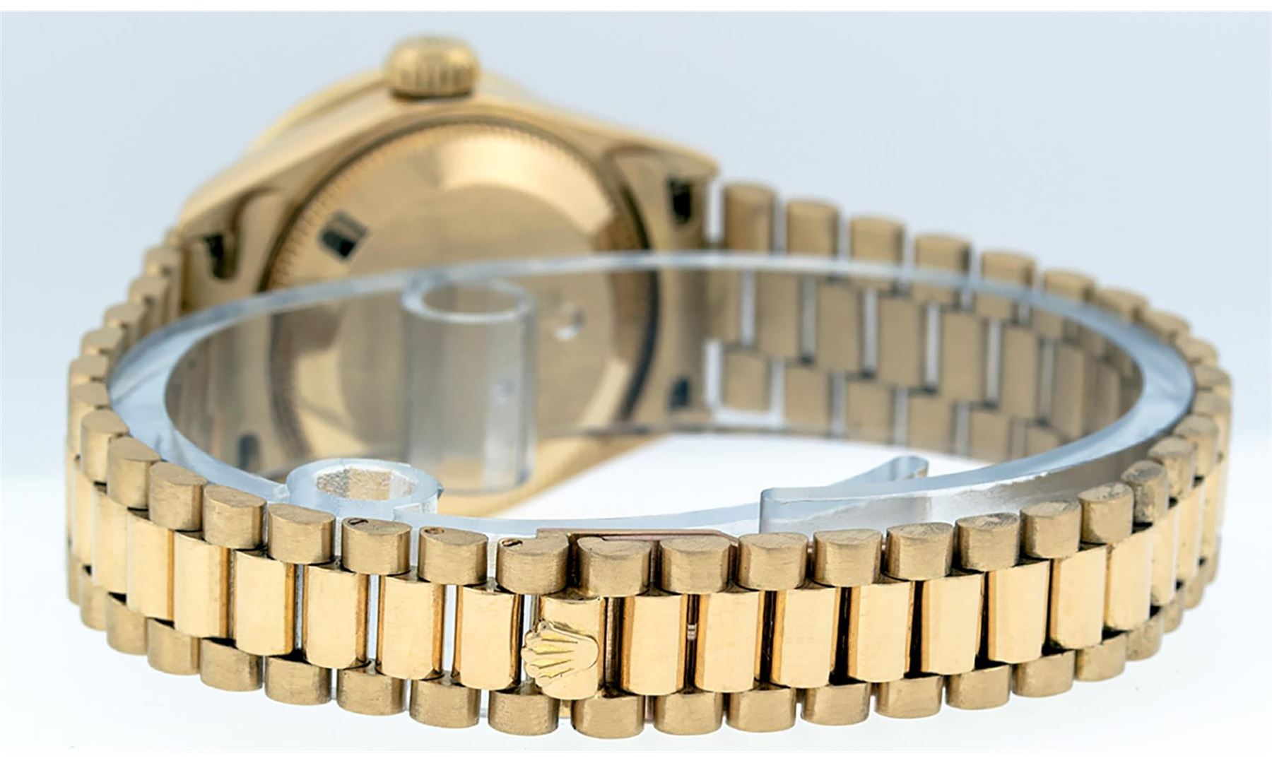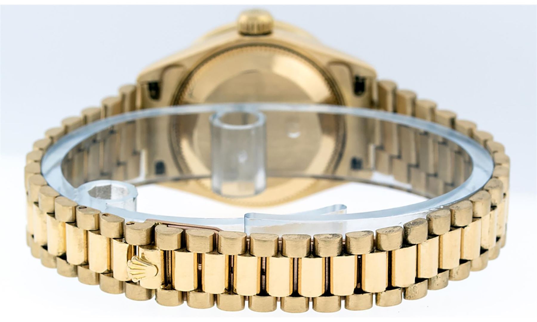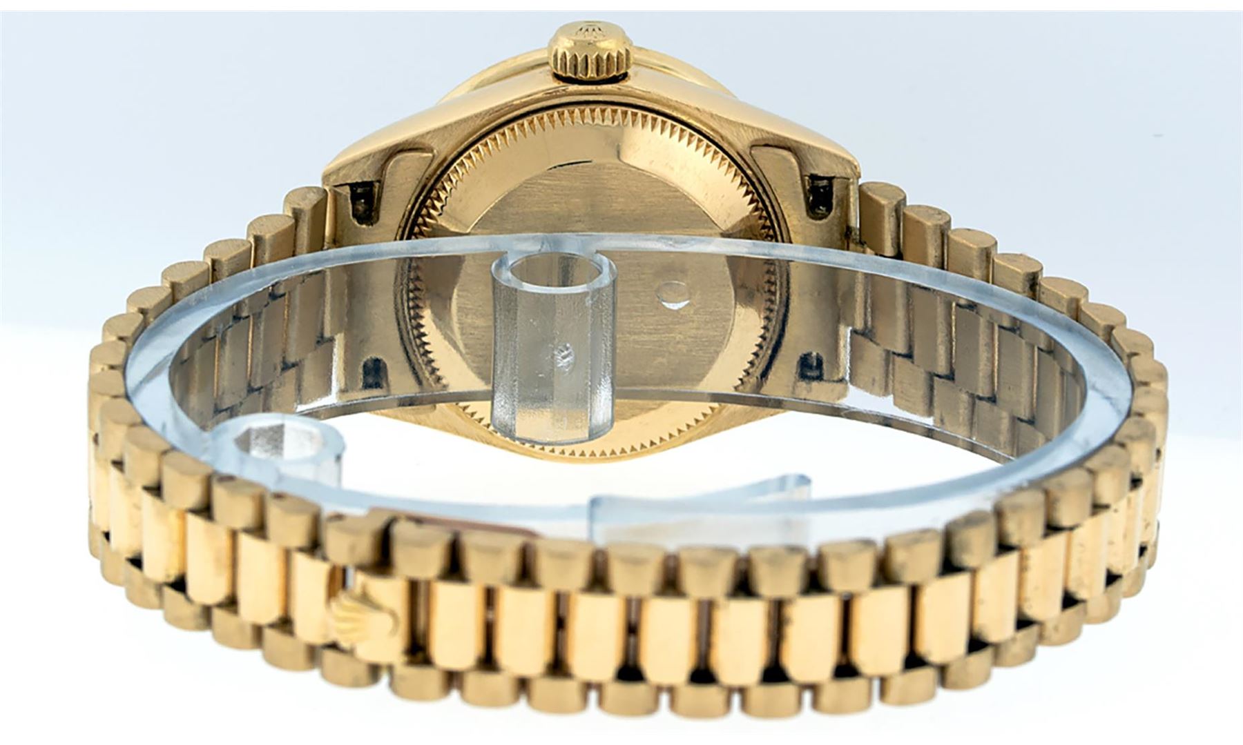 One Ladies Pre Owned Quickset Rolex 18K Yellow Gold President Polished, Serviced & Electronically Tested, 18K Yellow Gold Case With Custom Diamond Lugs: 24 Added Diamonds On Lugs, Case: 26mm, Yellow Gold Crown. Custom Bezel: New 18K Yellow Gold Beadset Diamond Bezel, Diamond Count: 32 Diamonds On Bezel. Custom Crystal: New Sapphire With Date Window. Custom Hands: New Luminescent Hands. Rolex Movement: Automatic Quickset Winding Movement. Custom Dial: Mother Of Pearl With Single Cut Diamond Hour Markers, Diamond Count: 43 Diamonds On Dial. Date Window: 3 O'Clock Position, Model: Datejust, Condition: G-6 Extra Fine. Rolex Bracelet: 18K Yellow Gold President Band, Bright & Satin Polish. 6.0 Inch Length, Standard President Clasp (Hidden Clasp), With Rolex Logo. This Watch Has Been Serviced Time Tested And Is In Excellent Condition It Is Free Of All Scratches And Dents.
