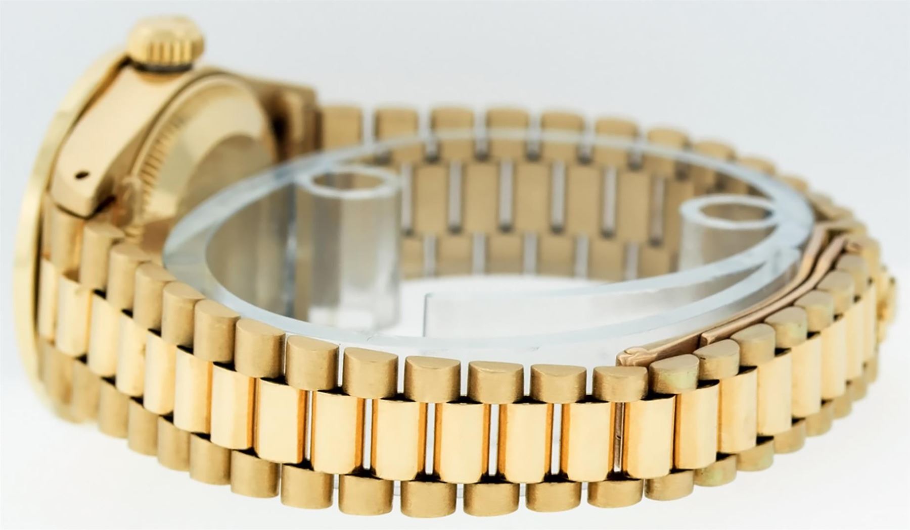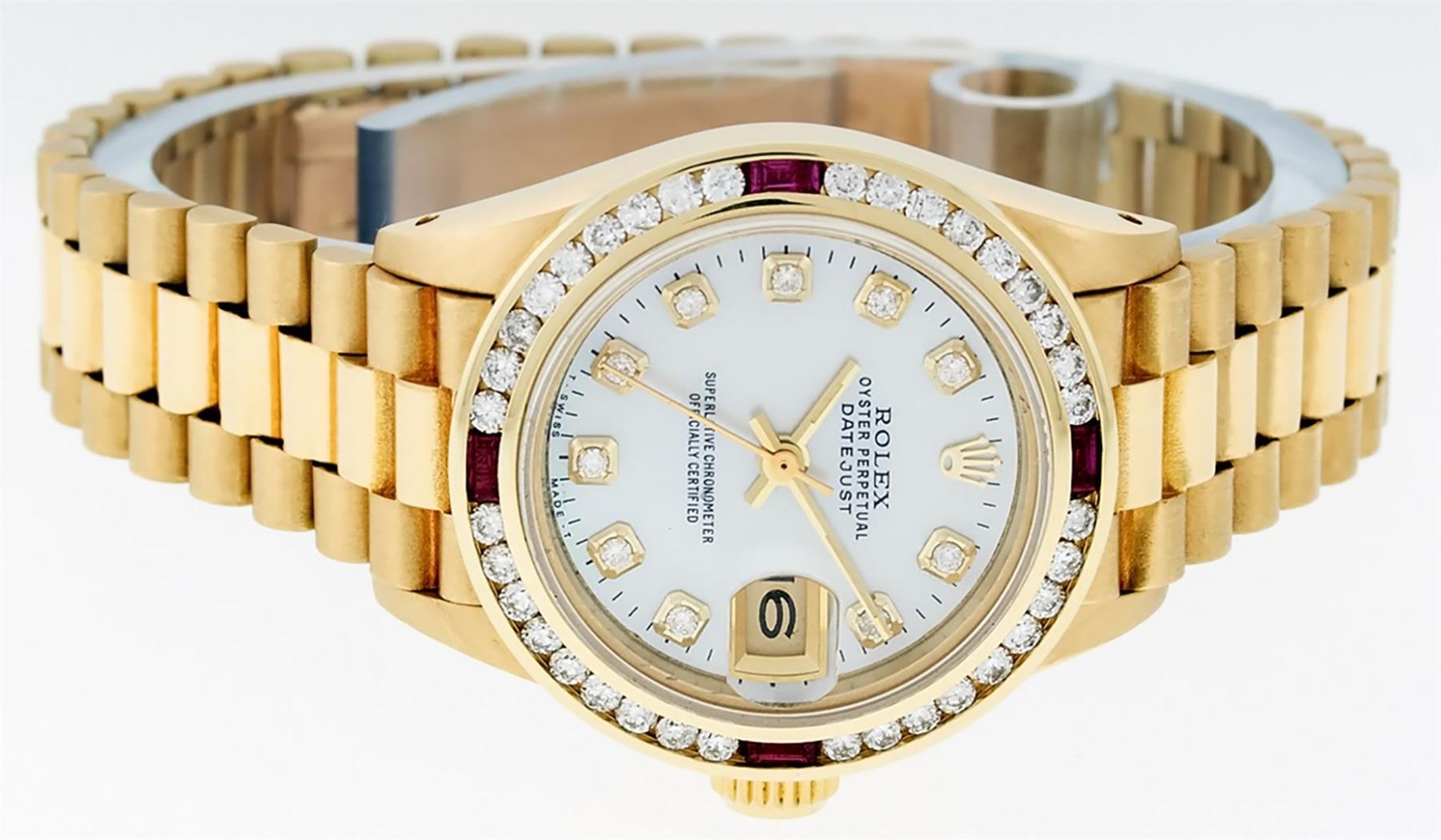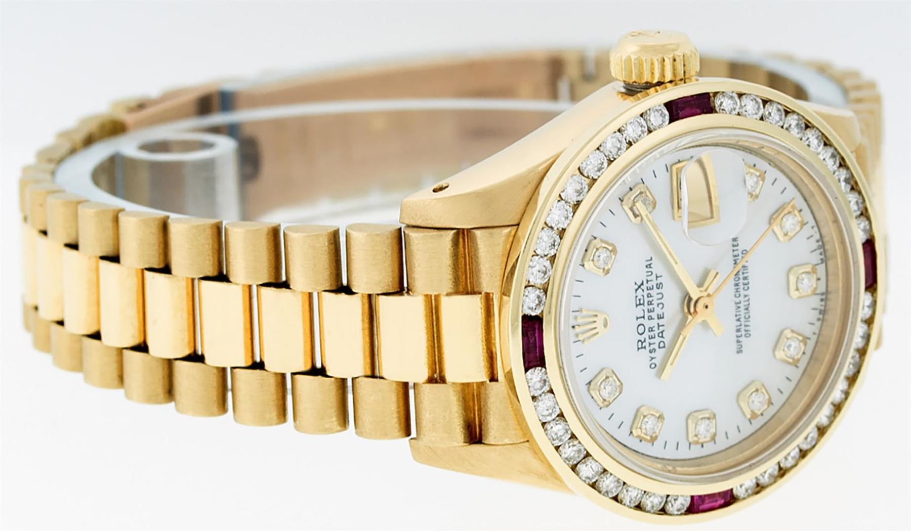 One Ladies Pre Owned 18K Yellow Gold Rolex President Polished, Serviced & Electronically Tested, Yellow Gold Case: 26mm, 18K Yellow Gold Crown, Custom Bezel: New 18K Yellow Gold Ruby Channel Set Diamond Bezel, Diamond + Stone Count: 36 Diamonds + 4 Rubies. Custom Crystal: New Sapphire With Date Window. Custom Hands: New Luminescent Hands. Rolex Movement: Automatic Winding Movement. Custom Dial: Mother Of Pearl With Dash Track, Stone Count: 10 Diamonds In Dial, Color: G To H, Clarity: SI-VS. Date Window: 3 O'Clock Position, Model: Datejust President, Condition: G-6 Extra Fine. Rolex Bracelet: 18K Yellow Gold President With Hidden Clasp, Bright & Satin Polish. 6.0 Inch Length, Standard President Clasp (Hidden Clasp), With Rolex Logo. Watch Has Been Serviced And Polished It Is Free Of All Scratches And Dents.