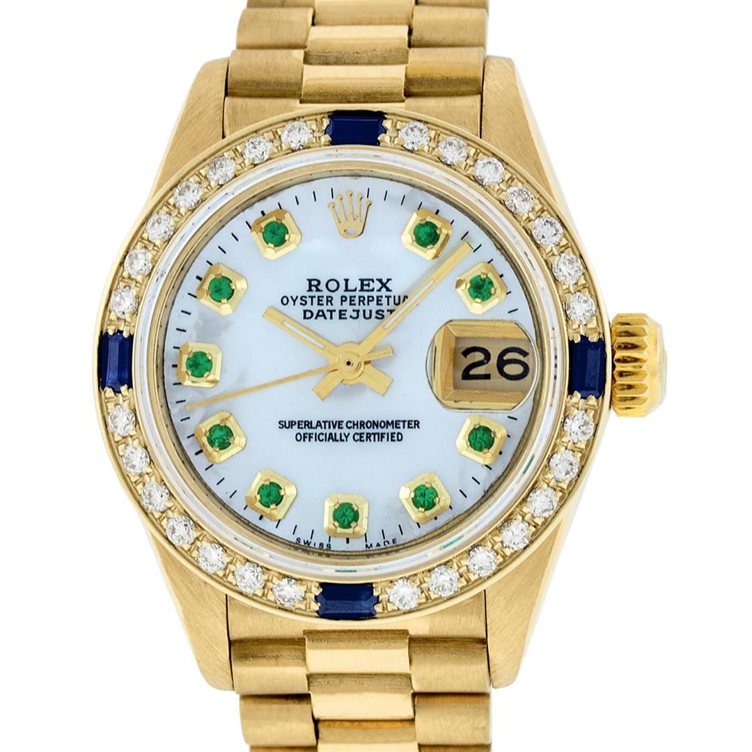 One Ladies 18K Yellow Gold Rolex President Polished, Serviced & Electronically Tested, Yellow Gold Case: 26mm, 18K Yellow Gold Crown, Custom Bezel: New 18K Yellow Gold Sapphire Beadset Diamond Bezel, Diamond + Stone Count: 28 Diamonds + 4 Sapphires. Custom Crystal: New Sapphire With Date Window. Custom Hands: New Luminescent Hands. Rolex Movement: Automatic Winding Movement. Custom Dial: Mother Of Pearl With Emerald Hour Markers, Stone Count: 10 Emeralds In Dial. Date Window: 3 O'Clock Position, Model: President, Condition: G-6 Extra Fine. Rolex Bracelet: 18K Yellow Gold President With Hidden Clasp, Bright & Satin Polish. 6.0 Inch Length, Standard President Clasp (Hidden Clasp), With Rolex Logo. This Preowned Watch Has Been Serviced And Polished It Is Free Of All Scratches And Dents.