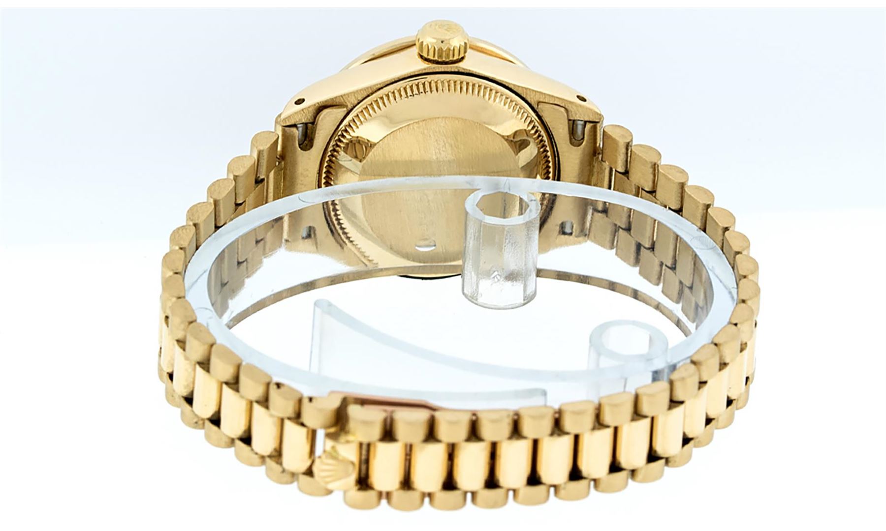 One Ladies Pre Owned Rolex 18K Yellow Gold President Polished, Serviced & Electronically Tested, 18K Yellow Gold Case: 26mm, 18K Yellow Gold Crown, Custom Bezel: New 18K Yellow Gold Bead Set Diamond Bezel, Diamond Count: 32 Diamonds Total Weight .70 Carat. Custom Crystal: New Sapphire With Date Window. Rolex Movement: Automatic Winding Movement. Custom Dial: Mother Of Pearl With Custom Added Diamond Hour Markers, Diamond Count: 10 Diamonds In Dial, Date Window: 3 O'Clock Position, Model: Datejust. Condition: G-6 Extra Fine The Watch Is In Very Good Condition Free Of All Scratches And Dents. Bracelet: 18K Yellow Gold President Band, Bright & Satin Polish. 6.0 Inch Length, Standard President Clasp (Hidden Clasp), With Rolex Logo.