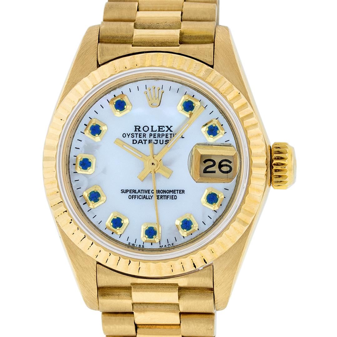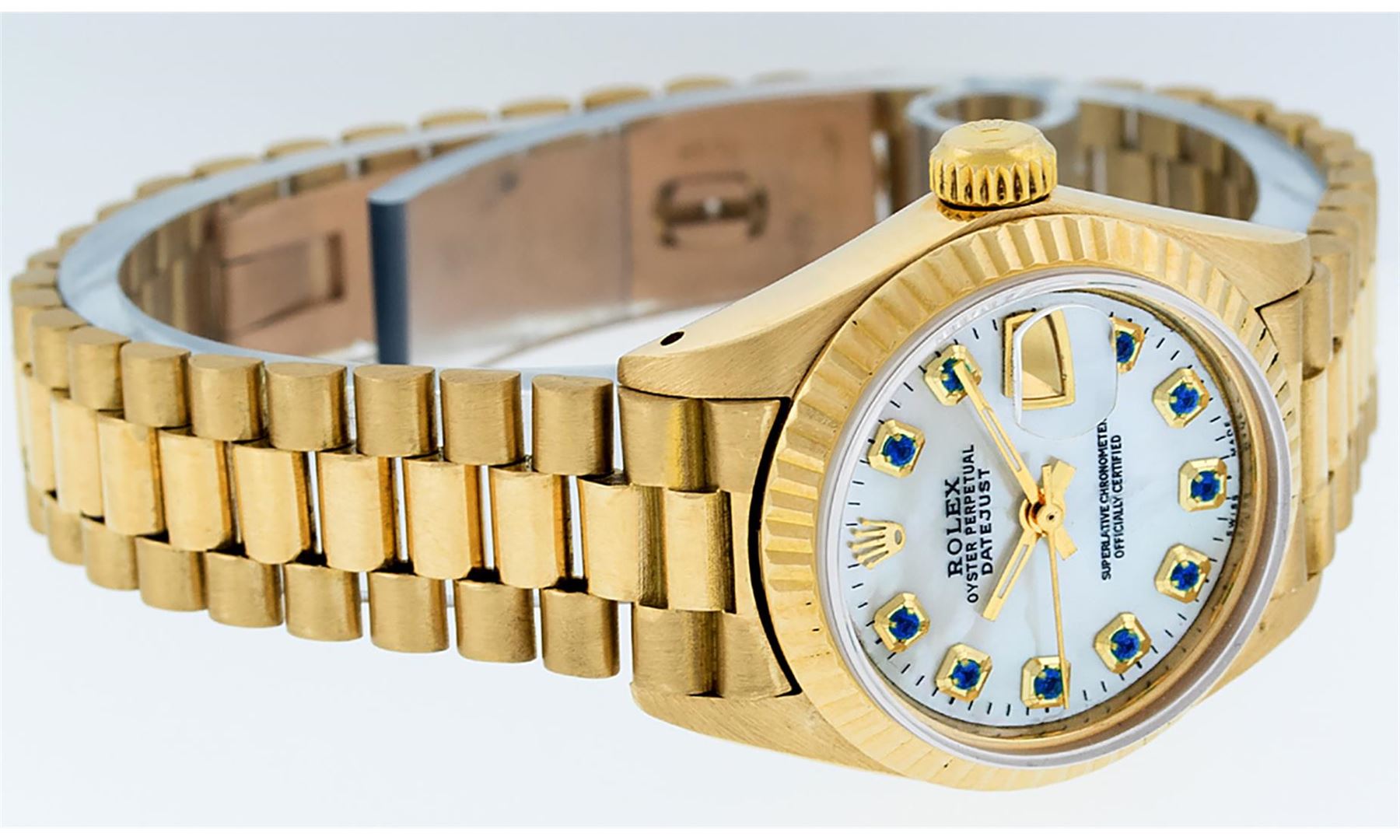 One Ladies Pre Owned Rolex 18K Yellow Gold President Polished, Serviced & Electronically Tested, Rolex 18K Yellow Gold Case: 26mm, Rolex 18K Yellow Gold Crown, Rolex Bezel: 18K Yellow Gold Fluted Bezel. Custom Crystal: New Acrylic Cyclops Lens. Custom Hands: New Luminescent Hands. Rolex Movement: Automatic Winding Movement. Custom Dial: Refinished To Mother Of Pearl With Custom Added Synthetic Sapphire Hour Markets, Stone Count: 10 Synthetic Sapphires In Dial, Clarity: SI-VS. Date Window: 3 O'Clock Position, Model: Datejust. Condition: G-6 Extra Fine The Watch Is In Very Good Condition Free Of All Scratches And Dents. Rolex Bracelet: 18K Yellow Gold President Band, Bright & Satin Polish. 6.0 Inch Length, Standard President Clasp (Hidden Clasp), With Rolex Logo.