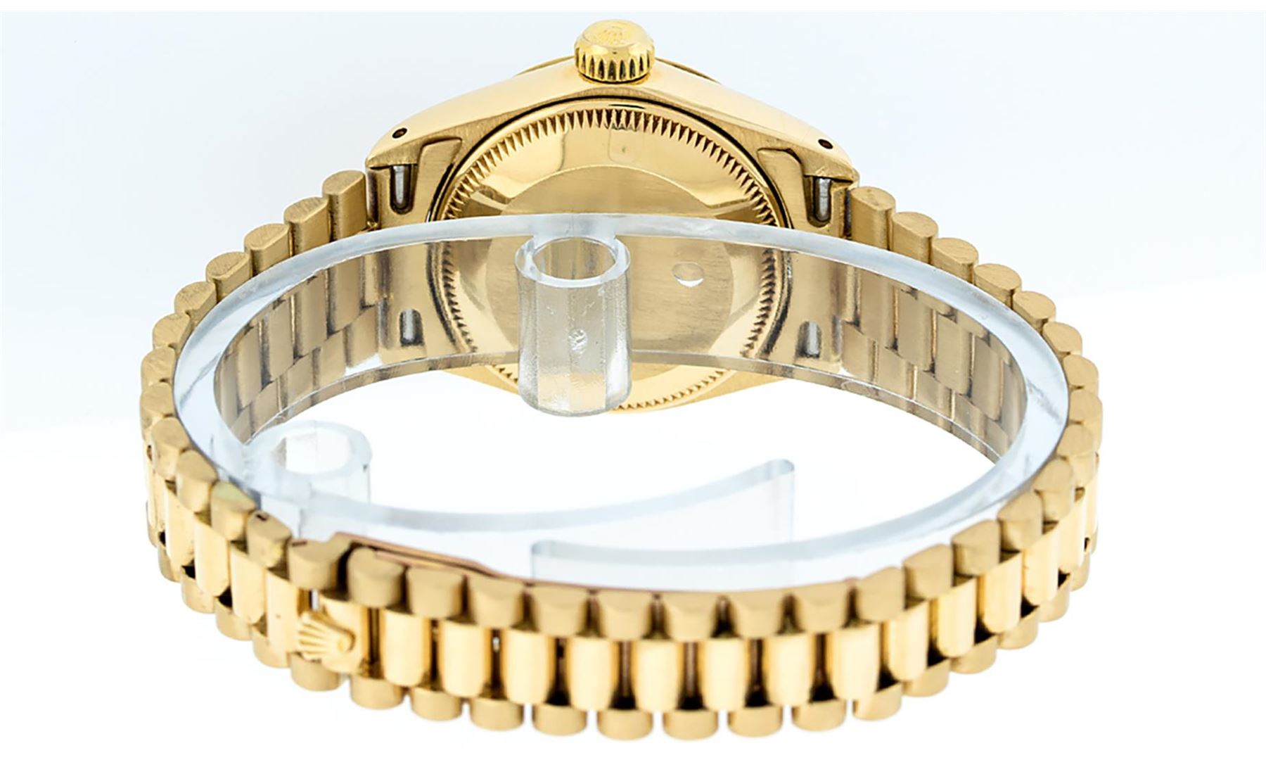 One Ladies Pre Owned Rolex 18K Yellow Gold President Polished, Serviced & Electronically Tested, Rolex 18K Yellow Gold Case: 26mm, Rolex 18K Yellow Gold Crown, Rolex Bezel: 18K Yellow Gold Fluted Bezel. Custom Crystal: New Acrylic Cyclops Lens. Custom Hands: New Luminescent Hands. Rolex Movement: Automatic Winding Movement. Custom Dial: Refinished To Mother Of Pearl With Custom Added Synthetic Sapphire Hour Markets, Stone Count: 10 Synthetic Sapphires In Dial, Clarity: SI-VS. Date Window: 3 O'Clock Position, Model: Datejust. Condition: G-6 Extra Fine The Watch Is In Very Good Condition Free Of All Scratches And Dents. Rolex Bracelet: 18K Yellow Gold President Band, Bright & Satin Polish. 6.0 Inch Length, Standard President Clasp (Hidden Clasp), With Rolex Logo.