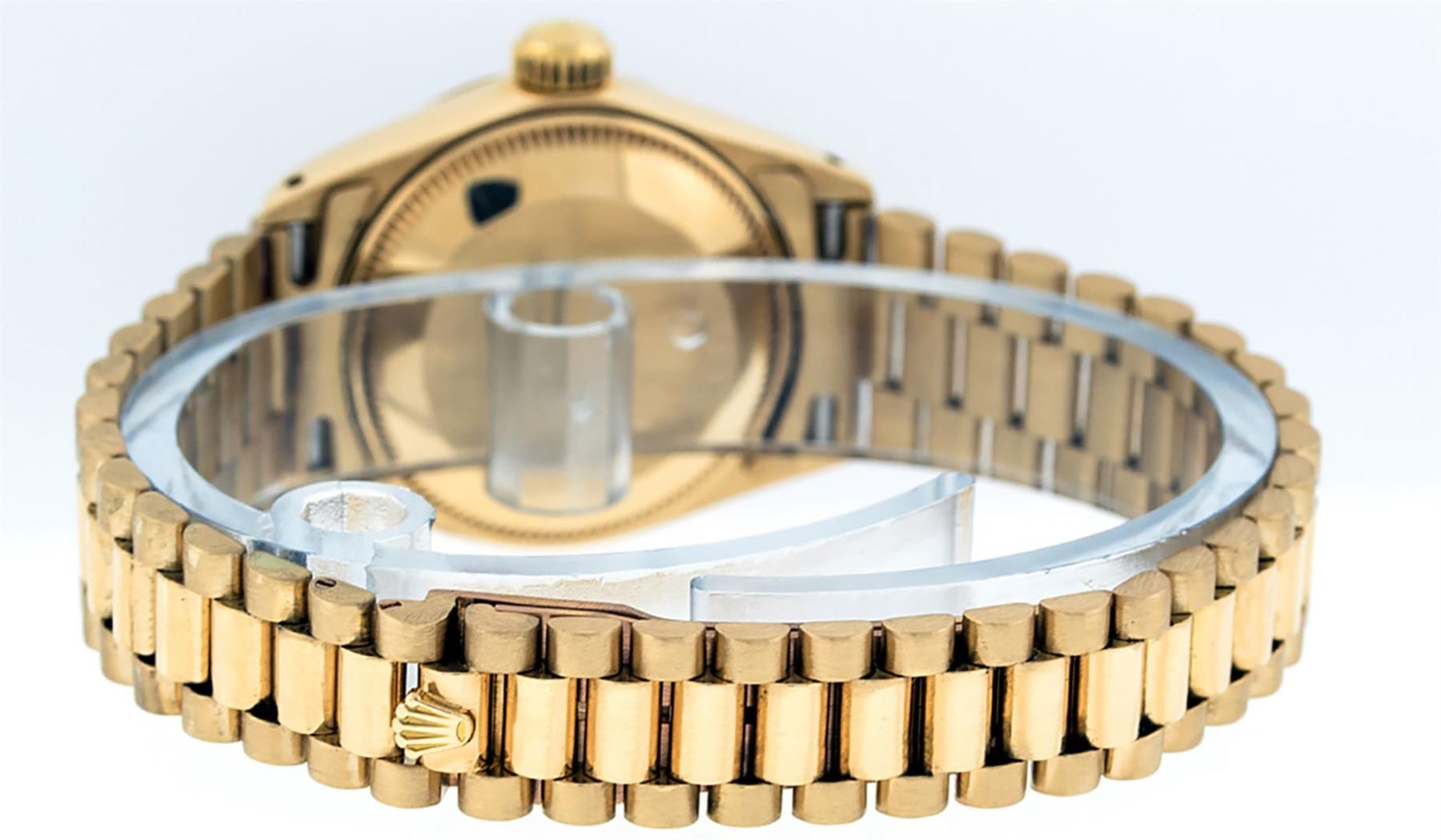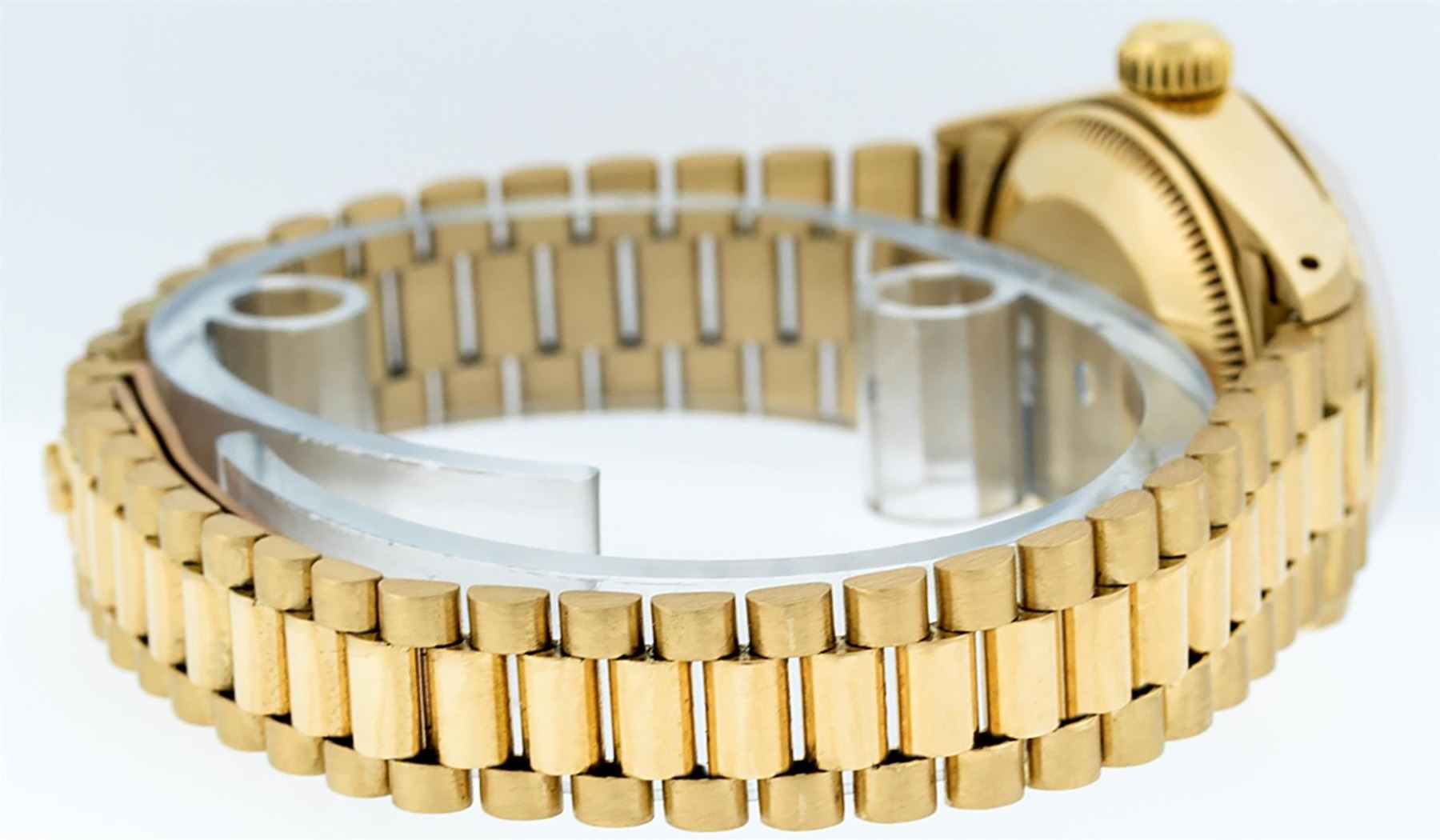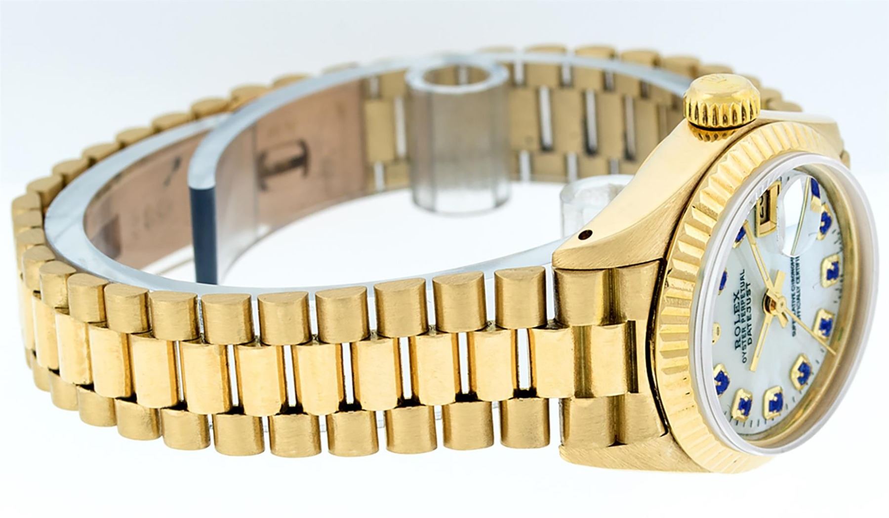 One Ladies Pre Owned Rolex 18K Yellow Gold President Polished, Serviced & Electronically Tested, Rolex 18K Yellow Gold Case: 26mm, Rolex 18K Yellow Gold Crown, Rolex Bezel: 18K Yellow Gold Fluted Bezel. Custom Crystal: New Acrylic Cyclops Lens. Custom Hands: New Luminescent Hands. Rolex Movement: Automatic Winding Movement. Custom Dial: Refinished To Mother Of Pearl With Custom Added Synthetic Sapphire Hour Markets, Stone Count: 10 Synthetic Sapphires In Dial, Clarity: SI-VS. Date Window: 3 O'Clock Position, Model: Datejust. Condition: G-6 Extra Fine The Watch Is In Very Good Condition Free Of All Scratches And Dents. Rolex Bracelet: 18K Yellow Gold President Band, Bright & Satin Polish. 6.0 Inch Length, Standard President Clasp (Hidden Clasp), With Rolex Logo.