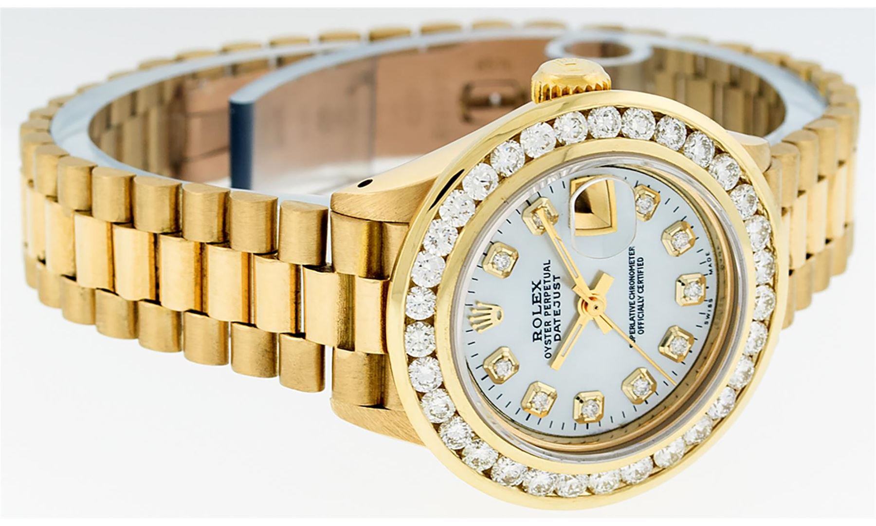 One Ladies 18K Yellow Gold Rolex Presidential Polished, Serviced & Electronically Tested, 18K Yellow Gold Case: 26mm, 18K Yellow Gold Crown, Custom Bezel: New 18K Yellow Gold 2CTW Channel Set Diamond Bezel, Diamond Count: 32 Diamonds On Bezel. Total Diamond Weight 2.00 Carat, Clarity: SI-VS, Color: G to H. Custom Crystal: New Scratch Resistant Synthetic Sapphire Cyclops Lens. Custom Hands: New Luminescent Hands. Movement: Automatic Winding Movement. Custom Dial: Refinished Mother Of Pearl With Dash Track. Date Window: 3 O'Clock Position, Model: Datejust President, Condition: G-6 Extra Fine. Bracelet: 18K Yellow Gold Presidential With Hidden Clasp, Bright & Satin Polish. 6.0 Inch Length, Standard President Clasp (Hidden Clasp), With Rolex Logo. Watch Has Been Serviced And Polished It Is Free Of All Scratches And Dents. This Watch Comes With A Rolex Box And Appraisal. This Watch Has Been Serviced Time Tested And Is In Excellent Condition It Is Free Of All Scratches And Dents.