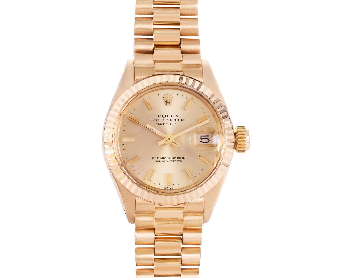 One Ladies Pre Owned Quickset Rolex 18K Yellow Gold President Polished, Serviced & Electronically Tested, Rolex 18K Yellow Gold Case: 26mm, Rolex 18K Yellow Gold Crown, Rolex Bezel: 18K Rolex Yellow Gold Fluted Bezel, Crystal: Sapphire With Cyclops Lens. Hands: Luminescent Hands. Rolex Movement: Rolex Automatic Movement Self Winding 2135. Rolex Dial: Factory Rolex Champagne Index Dial. Model: Quickset President. Condition: G-6 Extra Fine, Rolex Bracelet: 18K Yellow Gold President Band, Bright & Satin Polish. 6.0 Inch Length, Standard President Hidden Clasp, With Rolex Logo. This Watch Has Been Serviced Time Tested And Is In Excellent Condition It Is Free Of All Scratches And Dents. This Watch Comes With A Rolex Box.