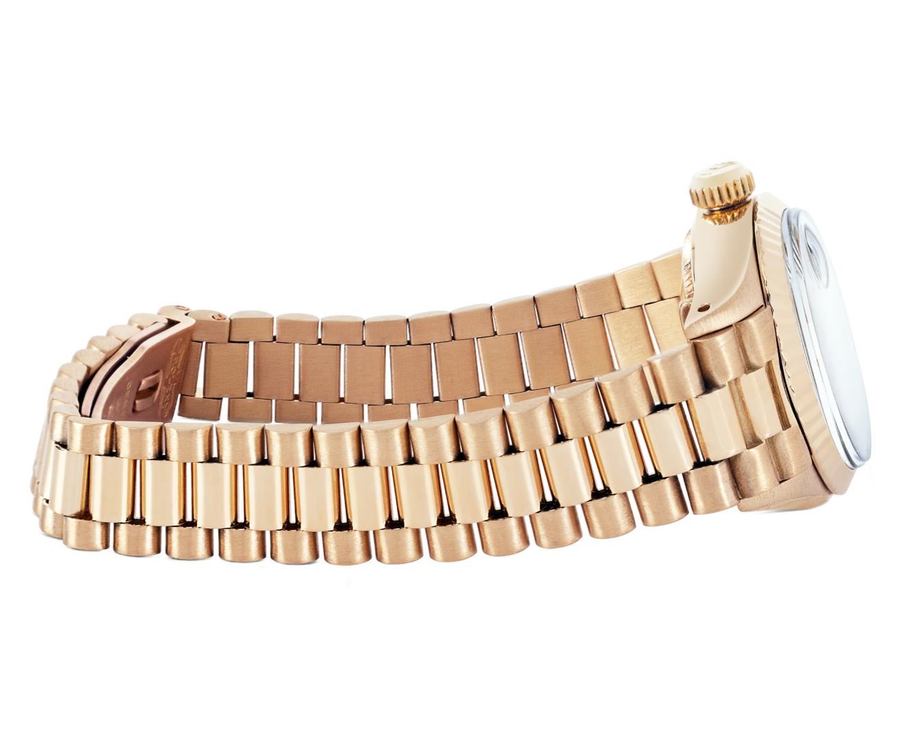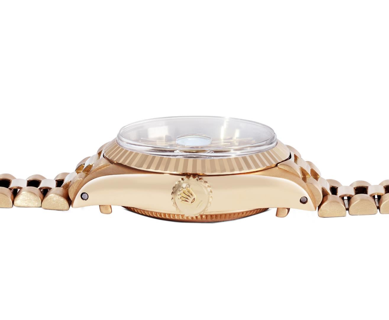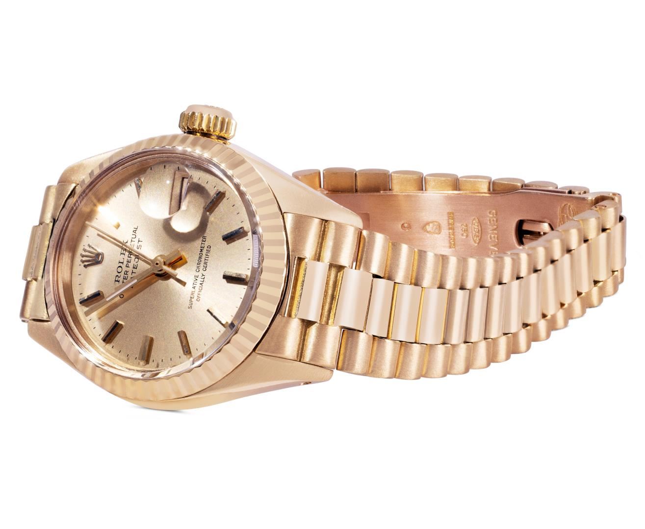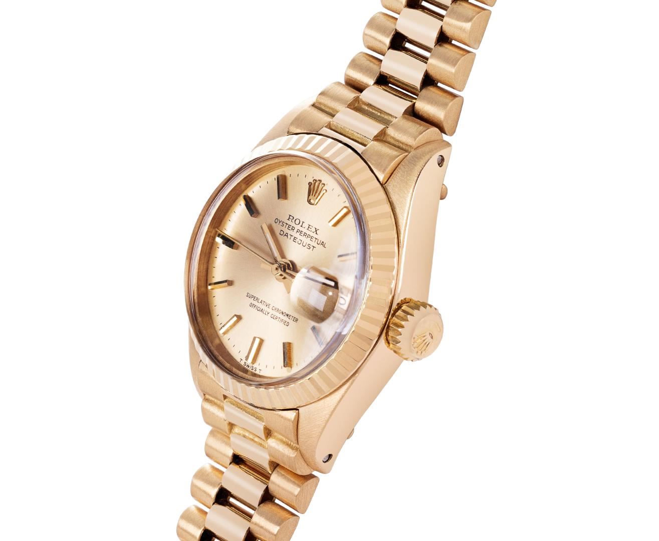 One Ladies Pre Owned Quickset Rolex 18K Yellow Gold President Polished, Serviced & Electronically Tested, Rolex 18K Yellow Gold Case: 26mm, Rolex 18K Yellow Gold Crown, Rolex Bezel: 18K Rolex Yellow Gold Fluted Bezel, Crystal: Sapphire With Cyclops Lens. Hands: Luminescent Hands. Rolex Movement: Rolex Automatic Movement Self Winding 2135. Rolex Dial: Factory Rolex Champagne Index Dial. Model: Quickset President. Condition: G-6 Extra Fine, Rolex Bracelet: 18K Yellow Gold President Band, Bright & Satin Polish. 6.0 Inch Length, Standard President Hidden Clasp, With Rolex Logo. This Watch Has Been Serviced Time Tested And Is In Excellent Condition It Is Free Of All Scratches And Dents. This Watch Comes With A Rolex Box.