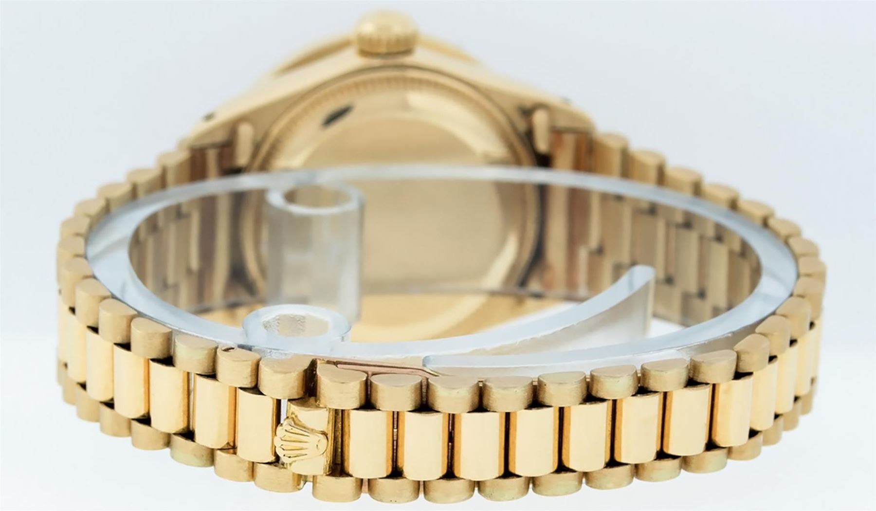 One Ladies Pre Owned 18K Yellow Gold Rolex President Polished, Serviced & Electronically Tested, Rolex Yellow Gold Case: 26mm, Rolex 18K Yellow Gold Crown, Custom Bezel: New 18K Yellow Gold Bezel With Custom Added Genuine Ruby and Diamonds, Diamond + Stone Count: 36 Diamonds + 4 Rubies. Total Weight 1.00 Carat, Clarity: SI-VS, Color: G to H. Custom Crystal: New Sapphire With Magnified Date Window. Custom Hands: New Luminescent Hands. Rolex Movement: Automatic Winding Movement. Rolex Dial: Champagne Index With Dash Track & Lumi Dots. Date Window: 3 O'Clock Position, Model: President, Condition: G-6 Extra Fine. Rolex Bracelet: 18K Yellow Gold President With Hidden Clasp, Bright & Satin Polish. 6.0 Inch Length, Standard President Clasp (Hidden Clasp), With Rolex Logo. Watch Has Been Serviced And Polished It Is Free Of All Scratches And Dents.