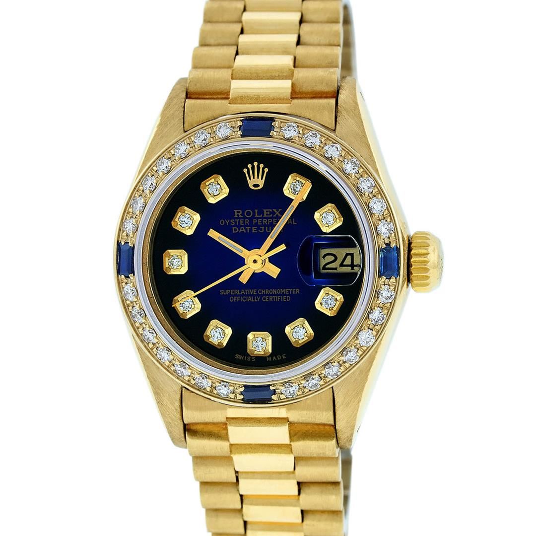 One Ladies 18K Yellow Gold Rolex President Polished, Serviced & Electronically Tested, Yellow Gold Case: 26mm, 18K Yellow Gold Crown, Custom Bezel: 18K Yellow Gold Sapphire Beadset Diamond Bezel, Diamond + Stone Count: 28 Diamonds + 4 Sapphires. Total Weight .70 Carat, Clarity: SI-VS, Color: G to H. Custom Crystal: Synthetic Sapphire Cyclops Lens. Movement: Automatic Winding Movement Caliber 2030. Custom Dial: Blue Vignette Diamond Dial, Stone Count: 10 Diamonds In Dial. Date Window: 3 O'Clock Position, Model: Datejust President, Condition: G-6 Extra Fine. Bracelet: 18K Yellow Gold President With Hidden Clasp, Bright & Satin Polish. 5.5 Inch Length, Standard President Clasp (Hidden Clasp), With Rolex Logo. Watch Has Been Serviced And Polished It Is Free Of All Scratches And Dents.