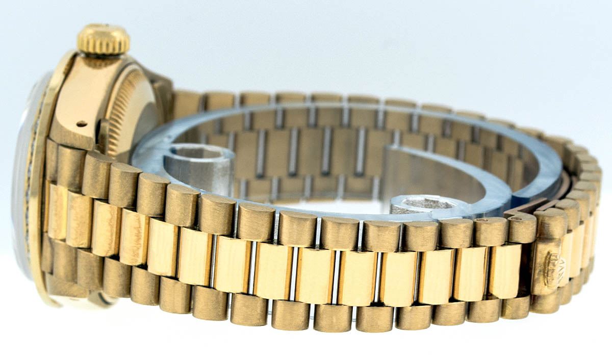 One Ladies 18K Yellow Gold Rolex President Polished, Serviced & Electronically Tested, Yellow Gold Case: 26mm, 18K Yellow Gold Crown, Custom Bezel: 18K Yellow Gold Sapphire Beadset Diamond Bezel, Diamond + Stone Count: 28 Diamonds + 4 Sapphires. Total Weight .70 Carat, Clarity: SI-VS, Color: G to H. Custom Crystal: Synthetic Sapphire Cyclops Lens. Movement: Automatic Winding Movement Caliber 2030. Custom Dial: Blue Vignette Diamond Dial, Stone Count: 10 Diamonds In Dial. Date Window: 3 O'Clock Position, Model: Datejust President, Condition: G-6 Extra Fine. Bracelet: 18K Yellow Gold President With Hidden Clasp, Bright & Satin Polish. 5.5 Inch Length, Standard President Clasp (Hidden Clasp), With Rolex Logo. Watch Has Been Serviced And Polished It Is Free Of All Scratches And Dents.
