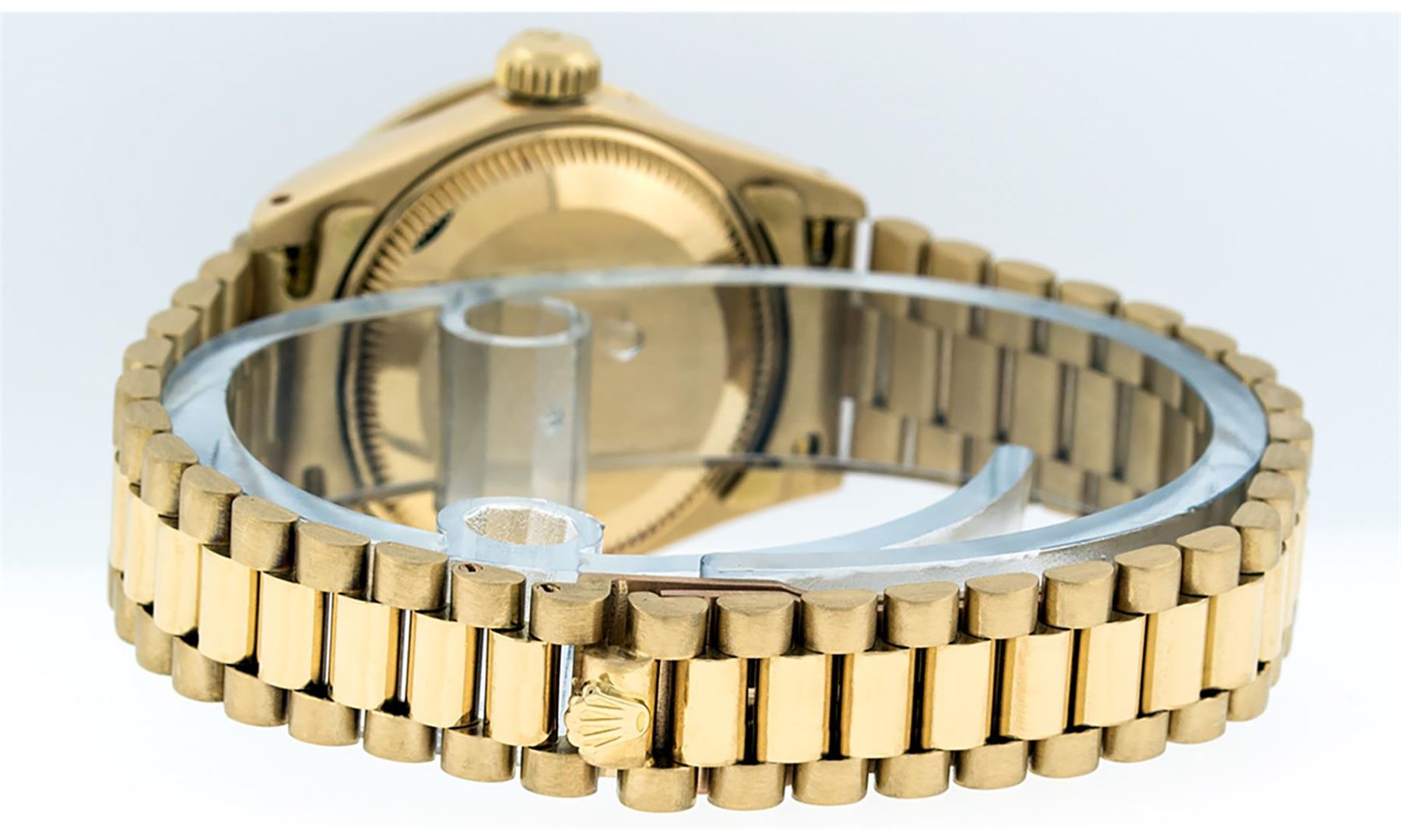 Rolex Ladies 18K Yellow Gold Rolex President Polished, Serviced & Electronically Tested, Yellow Gold Case: 26mm, 18K Yellow Gold Crown, Custom Bezel: 18K Yellow Gold Sapphire Beadset Diamond Bezel, Diamond + Stone Count: 28 Diamonds + 4 Sapphires. Total Weight .70 Carat, Clarity: SI-VS, Color: G to H. Custom Crystal: New Scratch Resistant Synthetic Sapphire Cyclops Lens. Custom Hands: New Luminescent Hands. Movement: Automatic Winding Movement. Custom Dial: Refinished Blue Vignette Diamond Dial, Stone Count: 10 Diamonds In Dial, Color: G To H, Clarity: SI-VS, Date Window: 3 O'Clock Position, Model: Datejust President, Condition: G-6 Extra Fine. Bracelet: 18K Yellow Gold President With Hidden Clasp, Bright & Satin Polish. 6.0 Inch Length, Standard President Clasp (Hidden Clasp), With Rolex Logo. Watch Has Been Serviced And Polished It Is Free Of All Scratches And Dents. This Watch Comes With A Watch Winder And Appraisal. This Watch Has Been Serviced Time Tested And Is In Excellent Condition It Is Free Of All Scratches And Dents.
