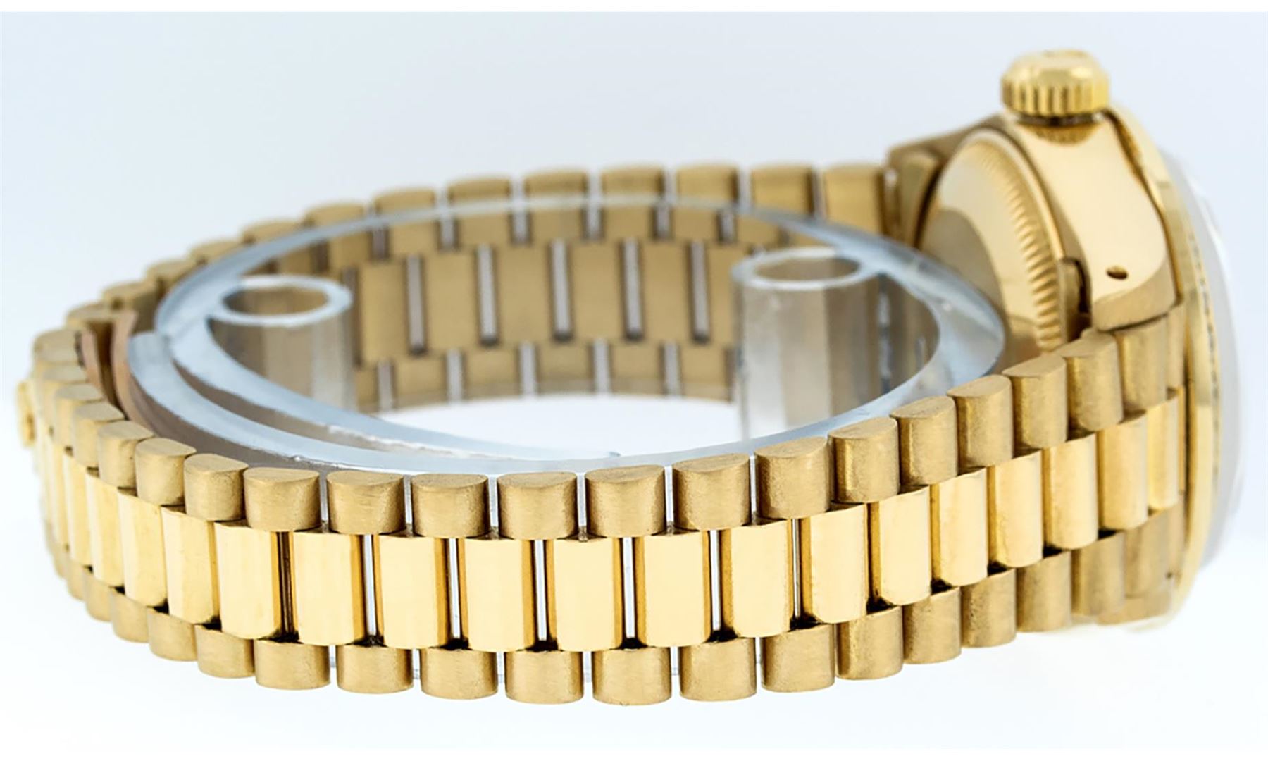 Rolex Ladies 18K Yellow Gold Rolex President Polished, Serviced & Electronically Tested, Yellow Gold Case: 26mm, 18K Yellow Gold Crown, Custom Bezel: 18K Yellow Gold Sapphire Beadset Diamond Bezel, Diamond + Stone Count: 28 Diamonds + 4 Sapphires. Total Weight .70 Carat, Clarity: SI-VS, Color: G to H. Custom Crystal: New Scratch Resistant Synthetic Sapphire Cyclops Lens. Custom Hands: New Luminescent Hands. Movement: Automatic Winding Movement. Custom Dial: Refinished Blue Vignette Diamond Dial, Stone Count: 10 Diamonds In Dial, Color: G To H, Clarity: SI-VS, Date Window: 3 O'Clock Position, Model: Datejust President, Condition: G-6 Extra Fine. Bracelet: 18K Yellow Gold President With Hidden Clasp, Bright & Satin Polish. 6.0 Inch Length, Standard President Clasp (Hidden Clasp), With Rolex Logo. Watch Has Been Serviced And Polished It Is Free Of All Scratches And Dents. This Watch Comes With A Watch Winder And Appraisal. This Watch Has Been Serviced Time Tested And Is In Excellent Condition It Is Free Of All Scratches And Dents.