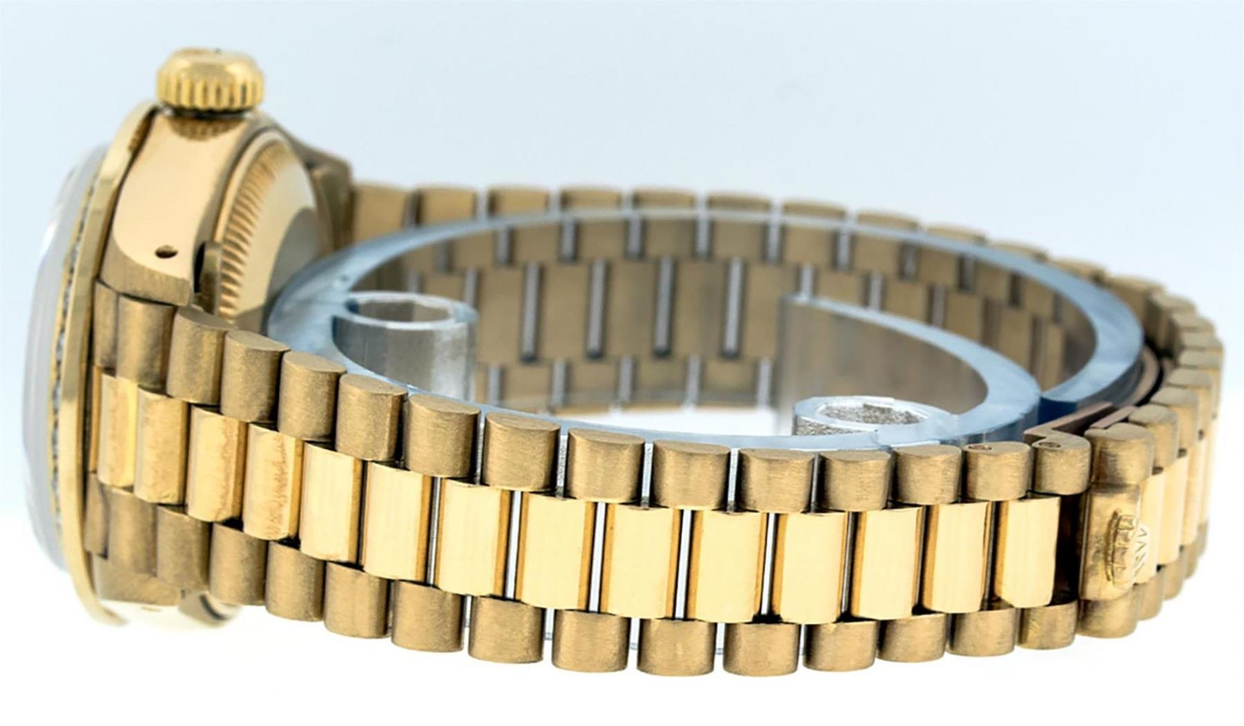 Rolex Ladies 18K Yellow Gold Rolex President Polished, Serviced & Electronically Tested, Yellow Gold Case: 26mm, 18K Yellow Gold Crown, Custom Bezel: 18K Yellow Gold Sapphire Beadset Diamond Bezel, Diamond + Stone Count: 28 Diamonds + 4 Sapphires. Total Weight .70 Carat, Clarity: SI-VS, Color: G to H. Custom Crystal: New Scratch Resistant Synthetic Sapphire Cyclops Lens. Custom Hands: New Luminescent Hands. Movement: Automatic Winding Movement. Custom Dial: Refinished Blue Vignette Diamond Dial, Stone Count: 10 Diamonds In Dial, Color: G To H, Clarity: SI-VS, Date Window: 3 O'Clock Position, Model: Datejust President, Condition: G-6 Extra Fine. Bracelet: 18K Yellow Gold President With Hidden Clasp, Bright & Satin Polish. 6.0 Inch Length, Standard President Clasp (Hidden Clasp), With Rolex Logo. Watch Has Been Serviced And Polished It Is Free Of All Scratches And Dents. This Watch Comes With A Watch Winder And Appraisal. This Watch Has Been Serviced Time Tested And Is In Excellent Condition It Is Free Of All Scratches And Dents.
