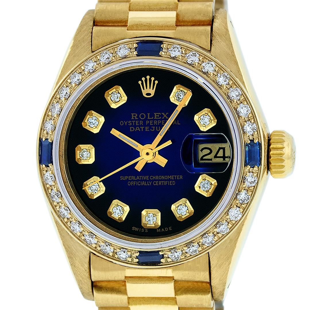 Rolex Ladies 18K Yellow Gold Rolex President Polished, Serviced & Electronically Tested, Yellow Gold Case: 26mm, 18K Yellow Gold Crown, Custom Bezel: 18K Yellow Gold Sapphire Beadset Diamond Bezel, Diamond + Stone Count: 28 Diamonds + 4 Sapphires. Total Weight .70 Carat, Clarity: SI-VS, Color: G to H. Custom Crystal: New Scratch Resistant Synthetic Sapphire Cyclops Lens. Custom Hands: New Luminescent Hands. Movement: Automatic Winding Movement. Custom Dial: Refinished Blue Vignette Diamond Dial, Stone Count: 10 Diamonds In Dial, Color: G To H, Clarity: SI-VS, Date Window: 3 O'Clock Position, Model: Datejust President, Condition: G-6 Extra Fine. Bracelet: 18K Yellow Gold President With Hidden Clasp, Bright & Satin Polish. 6.0 Inch Length, Standard President Clasp (Hidden Clasp), With Rolex Logo. Watch Has Been Serviced And Polished It Is Free Of All Scratches And Dents. This Watch Comes With A Watch Winder And Appraisal. This Watch Has Been Serviced Time Tested And Is In Excellent Condition It Is Free Of All Scratches And Dents.